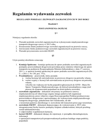 Regulamin wydawania zezwoleń REGULAMIN PODZIAŁU ZEZWOLEŃ ZAGRANICZNYCH W 2015 ROKU Rozdział I POSTANOWIENIA OGÓLNE §1 Niniejszy regulamin określa: 1. Warunki podziału zezwoleń zagranicznych na wykonywanie międzynarodowego transportu drogowego rzeczy w 2015 roku, 2. Przenoszenie limitu podstawowego zezwoleń zagranicznych na przewóz rzeczy, 3. Zawieszanie limitu podstawowego zezwoleń zagranicznych na przewóz rzeczy, 4. Warunki przyznawania zezwoleń EKMT. §2 Użyte poniżej określenia oznaczają: 1. Komisja Społeczna - komisja społeczna do spraw podziału zezwoleń zagranicznych pomiędzy przewoźnikami drogowymi powołana przez ministra właściwego do spraw transportu na podstawie Rozporządzenia Ministra Infrastruktury z dnia 17 czerwca 2011 r. w sprawie komisji społecznej do spraw podziału zezwoleń zagranicznych (Dz. U. z 2011 r. Nr 130, poz. 751), 2. Przedsiębiorca – przewoźnik, który posiada: a. ważną licencję lub zaświadczenie na przewozy drogowe na potrzeby własne, b. ważne wypisy z licencji lub zaświadczenia na przewozy drogowe na potrzeby własne, wliczbie nie większej niż liczba pojazdówzgłoszonych do GITD - Biura Do Spraw Transportu Międzynarodowego, do których przedsiębiorcy mają tytuł prawny do dysponowania pojazdami na dzień poboru zezwoleń, 3. zezwolenie zagraniczne - dokument otrzymany na podstawie umowy międzynarodowej od właściwego organu innego państwa lub organizacji międzynarodowej, przez właściwy organ Rzeczypospolitej Polskiej przekazywany przewoźnikowi drogowemu i upoważniający do wykonywania międzynarodowego transportu drogowego, jednokrotnie lub wielokrotnie, do lub z terytorium państwa określonego w zezwoleniu lub tranzytem przez jego terytorium, 4. zezwolenie EKMT - dokument dopuszczający do wykonywania w 2015 roku nieograniczonej liczby kursów pomiędzy krajami członkowskimi, których przebieg został udokumentowany w odpowiednio wypełnionym karnecie, 5. karnet EKMT - dokument służący do rejestracji, w porządku chronologicznym, informacji o operacjach transportowych przeprowadzonych podczas każdego etapu podróży, pojazdami z ładunkiem, a także pojazdem bez ładunku (zarejestrowane informacje mogą być użyte wyłącznie do kontroli wykorzystania zezwoleń), 6. limit podstawowy - liczba przyznawanych przedsiębiorcy na dany rok kalendarzowy w zależności od liczby pobranych i prawidłowo zwróconych do Biura Do Spraw Transportu Międzynarodowego – zezwoleń zagranicznych, 7. limit dodatkowy - wydzielona z kontyngentu liczba zezwoleń zagranicznych na przewóz rzeczy, przyznawana przedsiębiorcom w cyklu miesięcznym lub/i w sposób ciągły na podstawie stopnia wykorzystania limitu, 8. wolna sprzedaż - zezwolenia wydawane przedsiębiorcy w danym roku kalendarzowym w zależności od liczby pojazdów, które nie stanowią limitu podstawowego oraz dodatkowego, 9. pojazdy uprawnione - pojazdy zgłoszone przez przedsiębiorcę i zarejestrowane w bazie GITD - Biura Do Spraw Transportu Międzynarodowego, którymi przedsiębiorca może dysponować na podstawie przysługującego mu tytułu prawnego, w liczbie nie większej niż liczba posiadanych przez przedsiębiorcę wypisów z licencji lub wypisów z zaświadczeń na przewozy na potrzeby własne. 10. kontyngent dodatkowy - zezwolenia zagraniczne dodatkowo otrzymane w trakcie roku kalendarzowego. Rozdział II ZASADY PODZIAŁU ZEZWOLEŃ ZAGRANICZNYCH §3 1. Komisja Społeczna dokonuje podziału zezwoleń zagranicznych. 2. Komisja Społeczna ustala zasady obliczania limitów podstawowych oraz dokonuje podziału zezwoleń EKMT. 3. Komisja Społeczna rozpatruje wnioski o limity dodatkowe oraz ustala zasady podziału limitów dodatkowych co najmniej raz w miesiącu. Komisja Społeczna określając kryteria przyznawania zezwoleń w limicie dodatkowym, uwzględnia w szczególności: a. posiadanie ważnej licencji lub zaświadczenia na przewozy drogowe na potrzeby własne, b. liczbę wypisów z licencji lub wypisów z zaświadczeń na przewozy drogowe na potrzeby własne odpowiadające liczbie pojazdów zgłoszonych do GITD Biura Do Spraw Transportu Międzynarodowego, którymi przedsiębiorcy mogą dysponować na podstawie przysługującego im na dzień poboru zezwoleń tytułu prawnego do dysponowania pojazdami, c. liczbę zezwoleń zagranicznych w kontyngencie, d. liczbę pojazdów i wypisów zarejestrowanych w bazie GITD - Biura Do Spraw Transportu Międzynarodowego, e. wydane przedsiębiorcom zezwolenia EKMT, f. zezwolenia przyznane w kontyngencie dodatkowym, g. zezwolenia zwrócone i nie zwrócone przez przedsiębiorcę, h. limity podstawowe przedsiębiorcy. 4. Wnioski o przyznanie dodatkowych limitów zezwoleń przyjmowane są w GITD Biurze Do Spraw Transportu Międzynarodowego do 20-tego każdego miesiąca lub 5. 6. 7. 8. 9. ostatniego dnia roboczego przed 20-tym każdego miesiąca (decyduje data wpływu). Wzór wniosku określa załącznik nr 1. Lista złożonych wniosków aktualizowana będzie na bieżąco, na stronie: www.gitd.gov.pl Wnioski, złożone w późniejszym terminie rozpatrywane będą w miesiącu następnym. Lista przyznanych limitów dodatkowych, publikowana będzie na stronie: www.gitd.gov.pl Ustalone przez Komisję Społeczną kryteria przyznania zezwoleń zawarte będą w protokole z posiedzenia Komisji i publikowane na stronie internetowej GITD - Biura Do Spraw Transportu Międzynarodowego Organizacje uprawnione do wydawania zezwoleń wydają limity dodatkowe wyłącznie według kryteriów ustalonych przez Komisję Społeczną. W przypadkach niecierpiących zwłoki (nagłych), Dyrektor Biura Do Spraw Transportu Międzynarodowego może przydzielić zezwolenie zagraniczne - z wyjątkiem zezwoleń EKMT - pomiędzy posiedzeniami Komisji. Wykaz przedsiębiorców, którym przydzielone zostały zezwolenia, Dyrektor Biura Do Spraw Transportu Międzynarodowego przedkłada na najbliższym posiedzeniu Komisji Społecznej. §4 1. Przedsi