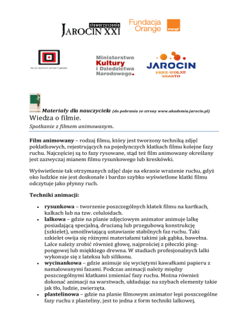 Materiały dla nauczyciela (do pobrania ze strony www.akademia.jarocin.pl) Wiedza o filmie. Spotkanie z filmem animowanym . Film animowany – rodzaj filmu, który jest tworzony techniką zdjęć poklatkowych, rejestrujących na pojedynczych klatkach filmu kolejne fazy ruchu. Najczęściej są to fazy rysowane, stąd też film animowany określany jest zazwyczaj mianem filmu rysunkowego lub kreskówki. Wyświetlenie tak otrzymanych zdjęć daje na ekranie wrażenie ruchu, gdyż oko ludzkie nie jest doskonałe i bardzo szybko wyświetlone klatki filmu odczytuje jako płynny ruch. Techniki animacji: rysunkowa – tworzenie poszczególnych klatek filmu na kartkach, kalkach lub na tzw. celuloidach. lalkowa – gdzie na planie zdjęciowym animator animuje lalkę posiadającą specjalną, drucianą lub przegubową konstrukcję (szkielet), umożliwiającą ustawianie stabilnych faz ruchu. Taki szkielet owija się różnymi materiałami takimi jak gąbka, bawełna. Lalce należy zrobić również głowę, najprościej z piłeczki pingpongowej lub miękkiego drewna. W studiach profesjonalnych lalki wykonuje się z lateksu lub silikonu. wycinankowa – gdzie animuje się wyciętymi kawałkami papieru z namalowanymi fazami. Podczas animacji należy między poszczególnymi klatkami zmieniać fazy ruchu. Można również dokonać animacji na warstwach, układając na szybach elementy takie jak tło, ludzie, zwierzęta. plastelinowa – gdzie na planie filmowym animator lepi poszczególne fazy ruchu z plasteliny, jest to jedna z form techniki lalkowej, animacja 3D – tworzona w technologii cyfrowej, komputerowej. Są tworzone m.in. w programach: 3D Studio Max, Maya, Softimage xsi, Blender, Cinema 4D. animacja materiałów sypkich – tutaj przedmiotem animacji jest np. mąka, sól, cukier, piasek. Animacja polega na przesuwaniu i animowaniu takich właśnie materiałów. pikselacja, fotoanimacja – animowanie wcześniej nakręconymi lub sfotografowanymi przedmiotami, zwierzętami lub postaciami ludzkimi. Film Tango Zbigniewa Rybczyńskiego zrealizowany taką techniką w 1980 r. w Se-ma-forze zdobył w 1983 r. Oscara dla krótkometrażowego filmu animowanego. techniki kombinowane (kolaż) i specjalne, gdzie tworzywo animacyjne jest bardzo różnorodne, zależne od fantazji twórcy (sól, piasek, przedmioty itp.). W tej technice można połączyć inne techniki tj. lalkowa i wycinanka. Mamy wtedy interesujące połączenie często wykorzystywane w tworzeniu filmów animowanych. Obecnie coraz rzadziej animacja filmowana jest na taśmie negatywowej 35 mm. Ta dosyć stara technologia prawie wyszła z użycia. Coraz powszechniej narzędziem pracy nie jest kamera lecz komputer z cyfrową obróbką filmu rysunkowego (2D) lub z technologią 3D. Jak powstaje film animowany? Niezmiennie występują trzy etapy produkcji: 1. Preprodukcja – pisanie scenariusza, tworzenie tzw. storyboardu (rysunkowej wersji scenariusza – coś na zasadzie komiksu), rysowanie szkiców postaci – przygotowywanie wstępnych modeli postaci w trój wymiarze, tworzenie pierwowzoru filmu w specjalnym programie komputerowym. 2. Produkcja – Tworzenie trójwymiarowych postaci, tzw. teksturowanie i łączenie trójwymiarowej postaci ze szkieletem animacyjnym tzw. rigowanie nadawanie właściwych proporcji i zgodność z budową anatomiczną człowieka, aby postać zachowywała się w sposób jak najbardziej podobny do rzeczywistości Następnym etapem pracy jest animacja - sekunda po sekundzie, klatka po klatce, program komputerowy składa przygotowane wcześniej rysunki, przedstawiające losy każdego bohatera. Wszystko po to, aby podczas oglądania widz miał wrażenie płynności ruchu. A oko i mózg "nabierają się" na iluzję gładko poruszającego się obiektu, jedynie wtedy, gdy kolejne klatki animacji pojawiają się z częstotliwością co najmniej 12 razy na sekundę 3. Postprodukcja To składanie całego filmu . Trwa do momentu wprowadzenia filmu do emisji. Dopracowywane są kolory, dodawane efekty dźwiękowe, efekty specjalne i muzyka. PAP - Nauka w Polsce, Katarzyna Czechowicz, źródło: naukawpolsce.pl Zadania dla ucznia Wiedza o filmie. Spotkanie z filmem animowanym. 1. 2. 3. 4. Wymień tytuł obejrzanego w kinie filmu. Czy wiesz, jaki to rodzaj filmu? Wymień tytuły innych, obejrzanych filmów animowanych. Do podanych niżej technik animacji dopisz tytuły filmów, realizowanych w podanej technice. Rodzaj techniki animacji Tytuł filmu 1.Animacja rysunkowa ……………………………………………………… ……………………………………………………… ……………………………………………………… ……………………………………………………… ………………………………………………………. 2.Animacja lalkowa ……………………………………………………… ……………………………………………………… ……………………………………………………… ……………………………………………………… 3.Animacja plastelinowa ……………………………………………………… ……………………………………………………… ……………………………………………………… ……………………………………………………… 4. Animacja 3D ……………………………………………………… ……………………………………………………… ……………………………………………………… ……………………………………………………… ……………………………………………………… ……………………………………………………… 5.Animacja łączona ……………………………………………………… ……………………………………………………… ……………………………………………………… 