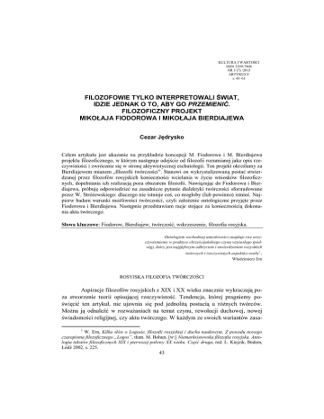 KULTURA I WARTOŚCI ISSN 2299-7806 NR 3 (7) /2013 ARTYKUŁY s. 43–61 FILOZOFOWIE TYLKO INTERPRETOWALI ŚWIAT, IDZIE JEDNAK O TO, ABY GO PRZEMIENIĆ. FILOZOFICZNY PROJEKT MIKOŁAJA FIODOROWA I MIKOŁAJA BIERDIAJEWA Cezar Jędrysko Celem artykułu jest ukazanie na przykładzie koncepcji M. Fiodorowa i M. Bierdiajewa projektu filozoficznego, w którym następuje odejście od filozofii rozumianej jako opis rzeczywistości i zwrócenie się w stronę aktywistycznej eschatologii. Ten projekt określamy za Bierdiajewem mianem „filozofii twórczości”. Stanowi on wykrystalizowaną postać stwierdzanej przez filozofów rosyjskich konieczności wcielania w życie wniosków filozoficznych, dopełniania ich realizacją poza obszarem filozofii. Nawiązując do Fiodorowa i Bierdiajewa, próbuję odpowiedzieć na zasadnicze pytanie dialektyki twórczości sformułowane przez W. Stróżewskiego: dlaczego nie istnieje coś, co mogłoby (lub powinno) istnieć. Najpierw badam warunki możliwości twórczości, czyli założenie ontologiczne przyjęte przez Fiodorowa i Bierdiajewa. Następnie przedstawiam racje stojące za koniecznością dokonania aktu twórczego. Słowa kluczowe: Fiodorow, Bierdiajew, twórczość, wskrzeszenie, filozofia rosyjska. Ontologizm wschodniej umysłowości znajduje swe urzeczywistnienie w praktyce chrześcijańskiego czynu wzniosłego (podwig), który jest najgłębszym odkryciem i utwierdzeniem wszystkich twórczych i rzeczywistych aspektów osoby1. Włodzimierz Ern ROSYJSKA FILOZOFIA TWÓRCZOŚCI Aspiracje filozofów rosyjskich z XIX i XX wieku znacznie wykraczają poza stworzenie teorii opisującej rzeczywistość. Tendencja, której pragniemy poświęcić ten artykuł, nie ujawnia się pod jednolitą postacią u różnych twórców. Można ją odnaleźć w rozważaniach na temat czynu, rewolucji duchowej, nowej świadomości religijnej, czy aktu twórczego. W każdym ze swoich wariantów zasa1 W. Ern, Kilka słów o Logosie, filozofii rosyjskiej i duchu naukowym. Z powodu nowego czasopisma filozoficznego „Logos”, tłum. M. Bohun, [w:] Niemarksistowska filozofia rosyjska. Antologia tekstów filozoficznych XIX i pierwszej połowy XX wieku. Część druga, red. L. Kiejzik, Ibidem, Łódź 2002, s. 225. 43 C. JĘDRYSKO – FILOZOFOWIE TYLKO INTERPRETOWALI ŚWIAT... dza się na konieczności wprowadzenia do obecnej rzeczywistości czegoś zupełnie nowego, pewnej nowej jakości, która zupełnie odmieni istotę świata – przeobrazi ją na lepsze. W większości przypadków będzie to tożsame z eschatologicznym dopełnieniem dziejów, theosis. W ramach tego nurtu główny nacisk kładzie się na człowieka, a nie na otaczającą go rzeczywistość. Nie jest to jednak abstrakcyjne pojęcie człowieka „w ogóle”, lecz odnosi się ono do konkretnej i niepowtarzalnej osoby, która jest określona poprzez jej zdolność tworzenia. Człowiek może tworzyć dobro, tam, gdzie go nie ma, przemieniać rzeczywistość wedle swej woli. Mamy zatem świat wymagający przemiany i podmiot mogący jej dokonać. Od jego wolnego wyboru uzależniona jest sensowność tej rzeczywistości. Jego działanie będzie realizacją logosu, racjonalną koniecznością wynikającą z tego, kim jest człowiek i jak wygląda zastana rzeczywistość. Zaniechanie czynu byłoby równoznaczne z odrzuceniem istnienia sensu. Tak w zarysie można przedstawić nurt „filozofii twórczości” obecny w rosyjskiej myśli religijnej oraz związaną z nim pewną ogólną cechę tego typu filozofowania – konieczność wcielenia w życie wniosków filozoficznych, dopełnienia ich realizacją poza obszarem filozofii. Nazwa „filozofia twórczości” może być zwodząca, gdyż w swoim nadrzędnym sensie nie odnosi się do sytuacji estetycznej, relacji pomiędzy artystą a dziełem sztuki, lecz do relacji etycznej, relacji człowieka do Boga i człowieka do drugiej osoby, jak również do siebie samego. Kluczowe dla tematu pojęcie twórczości nie jest synonimem ani procesu twórczego, wytwarzania artefaktów, ani twórczości jako zbioru wytworów, osiągnięć człowieka. Jest próbą odpowiedzi na podstawowe pytanie o sens istnienia człowieka poprzez wskazanie na twórczość jako istotę i powołanie człowieczeństwa. Aby bliżej przyjrzeć się temu fenomenowi myśli rosyjskiej, posłużymy się analizą dialektyki twórczości Władysława Stróżewskiego. Stróżewski w swoich rozważaniach na temat procesu twórczego w opozycji do zasadniczego pytania metafizyki „dlaczego istnieje raczej coś aniżeli nic?”, formułuje zasadnicze pytanie dialektyki twórczości2: „dlaczego nie istnieje coś, co mogłoby (lub powinno) istnieć?”3. W tym pytaniu W. Stróżewski wyróżnia dwa momenty. Pierwszy z nich jest zapytaniem o obecny stan rzeczy, o powód, dla którego coś nie istnieje; drugi zaś określa możliwość zaistnienia, czegoś, co obecnie nie istnieje. W porządku logicznym drugi moment ma pierwszeństwo. Aby pytać, dlaczego czegoś nie ma, wpierw musi istnieć możliwość pojawienia się tego czegoś. W pierwszej części 2 Twórczość jest procesem dialektycznym, ponieważ jej rezultat jest wypadkową świadomego spotkania różnych, niekiedy przeciwstawnych sił. Człowiek w akcie twórczym zmaga się z ograniczeniami tworzywa, jak również ze swoimi ograniczeniami jako twórcy. 3 W. Stróżewski, Dialektyka twórczości, PWM, Kraków 1983, s. 181. 44 C. JĘDRYSKO – FILOZOFOWIE TYLKO INTERPRETOWALI ŚWIAT... artykułu przyjrzymy się, jak w światopoglądzie filozoficznym wybranych rosyjskich myślicieli zostały spełnione ontologiczne założenia konieczne dla zaistnienia twórczości. W drugiej części przyjrzymy się wynikającym z tego konsekwencjom i spróbujemy uzasadnić powinność dokonania twórczego aktu (czynu) na bazie przyjętych założeń. Tym samym pragniemy potwierdzić przywołaną na początku diagnozę Erna, a nawet ją wzmocnić, widząc w przedstawion