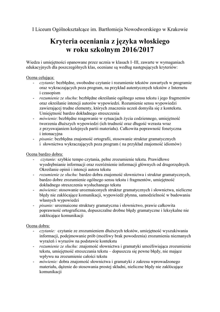 I Liceum Ogólnokształcące im. Bartłomieja Nowodworskiego w Krakowie Kryteria oceniania z języka włoskiego w roku szkolnym 2016/2017 Wiedza i umiejętności opanowane przez ucznia w klasach I–III, zawarte w wymaganiach edukacyjnych dla poszczególnych klas, oceniane są według następujących kryteriów: Ocena celująca: - czytanie: bezbłędne, swobodne czytanie i rozumienie tekstów zawartych w programie oraz wykraczających poza program, na przykład autentycznych tekstów z Internetu i czasopism - rozumienie ze słuchu: bezbłędne określanie ogólnego sensu tekstu i jego fragmentów oraz określanie intencji autorów wypowiedzi. Rozumienie sensu wypowiedzi zawierającej trudne elementy, których znaczenia uczeń domyśla się z kontekstu. Umiejętność bardzo dokładnego streszczenia - mówienie: bezbłędne reagowanie w sytuacjach życia codziennego, umiejętność tworzenia dłuższych wypowiedzi (ich trudność oraz długość wzrasta wraz z przyswajaniem kolejnych partii materiału). Całkowita poprawność fonetyczna i intonacyjna - pisanie: bezbłędna znajomość ortografii, stosowanie struktur gramatycznych i słownictwa wykraczających poza program ( na przykład znajomość idiomów) Ocena bardzo dobra: - czytanie: szybkie tempo czytania, pełne zrozumienie tekstu. Prawidłowe wyodrębnianie informacji oraz rozróżnienie informacji głównych od drugorzędnych. Określanie opinii i intencji autora tekstu - rozumienie ze słuchu: bardzo dobra znajomość słownictwa i struktur gramatycznych, bardzo dobre zrozumienie ogólnego sensu tekstu i fragmentów, umiejętność dokładnego streszczenia wysłuchanego tekstu - mówienie: stosowanie urozmaiconych struktur gramatycznych i słownictwa, nieliczne błędy nie zakłócające komunikacji, wypowiedź płynna, samodzielność w budowaniu własnych wypowiedzi - pisanie: urozmaicone struktury gramatyczna i słownictwo, prawie całkowita poprawność ortograficzna, dopuszczalne drobne błędy gramatyczne i leksykalne nie zakłócające komunikacji Ocena dobra: - czytanie: czytanie ze zrozumieniem dłuższych tekstów, umiejętność wyszukiwania informacji, podejmowanie prób (możliwy brak powodzenia) zrozumienia nieznanych wyrażeń i wyrazów na podstawie kontekstu - rozumienie ze słuchu: znajomość słownictwa i gramatyki umożliwiająca zrozumienie tekstu, umiejętność streszczania tekstu – dopuszcza się pewne błędy, nie mające wpływu na zrozumienie całości tekstu - mówienie: dobra znajomość słownictwa i gramatyki z zakresu wprowadzonego materiału, dążenie do stosowania prostej składni, nieliczne błędy nie zakłócające komunikacji - pisanie: dobra znajomość słownictwa i gramatyki z zakresu wprowadzonego materiału, dążenie do stosowania prostej składni, nieliczne błędy nie zakłócające komunikacji Ocena dostateczna: - czytanie: czytanie ze zrozumieniem krótkich i prostych tekstów, umiejętność określania głównych myśli zawartych we fragmentach tekstu, umiejętność wykonania ćwiczenia prawda – fałsz - rozumienie ze słuchu: uczeń zna gramatykę i słownictwo w stopniu podstawowym, umożliwiającym wykonanie ćwiczenia prawda – fałsz, w którym popełnia błędy - mówienie: posiadanie ograniczonego zakresu słownictwa i struktur gramatycznych, liczne powtórzenia, liczne błędy językowe w dużym stopniu zakłócające komunikację, tempo wypowiedzi wolne, częste pomyłki w akcentowaniu - pisanie: ograniczony zakres słownictwa i struktur gramatycznych, liczne powtórzenia, dość liczne błędy językowe w znacznym stopniu zakłócające komunikację, dość liczne błędy ortograficzne Ocena dopuszczająca: - czytanie: czytanie ze zrozumieniem krótkich i bardzo prostych tekstów, umiejętność określenia głównej myśli tekstu, częściowa umiejętność wykonania ćwiczenia prawda – fałsz - rozumienie ze słuchu: znajomość elementarnych środków językowych, umożliwiająca zrozumienie ogólnego sensu tekstu - mówienie: znajomość najprostszego słownictwa i struktur gramatycznych, budowanie krótkich zdań z licznymi błędami, które uczeń jest w stanie poprawić przy pomocy nauczyciela - pisanie: znajomość najprostszego słownictwa i najbardziej podstawowych form gramatycznych, umiejętność tworzenia wypowiedzi złożonej z kilku zdań o prostej składni, w której uczeń popełnia bardzo liczne błędy w dużym stopniu zakłócające komunikację Wymagania edukacyjne z języka włoskiego klasa I w roku szkolnym 2016/2017 Poziom C – nauka języka włoskiego od podstaw, jako drugiego języka obcego Podręcznik Nuovo progetto italiano. Libro dello studente część 1, T. Marin, S. Magnelli Nuovo progetto italiano. Quaderno degli esercizi e delle attivita video. Część 1, L. Ruggieri, S. Magnelli, T. Marin Materiał gramatyczny - - Alfabet, wymowa i akcent Rzeczownik – rodzaj męski i żeński liczba pojedyncza i mnoga wybrane rzeczowniki nieregularne Rodzajnik określony i nieokreślony - Przymiotnik – liczba pojedyncza i mnoga, rodzaj męski i żeński liczba mnoga przymiotników zakończonych na -co, -ca Zaimki zastępujące podmiot – i pronomi soggetto Zaimki i przymiotniki wskazujące: questo, questa Zaimki i przymiotniki dzierżawcze: mio, tuo, suo, mia, tua, sua Zaimki i przymiotniki pytające: chi, che cosa, come, dove, quale,quanto, quando, perche Zaimki i przymiotniki nieokreślone : molto, poco, tanto, troppo, tutto Liczebniki główne i porządkowe Daty Przyimki proste i ściągnięte Czas teraźniejszy – czasowniki regularne I, II i III koniugacji oraz podstawowe czasowniki nieregularne Czasownik zwrotny – wybrane formy Materiał leksykalny - Dane personalne. Zawieranie nowej znajomości; formułki używane na powitanie i pożegnanie Określanie pochodzenia i narodowości Pytanie o adres i określanie miejsca zamieszkania Przedstawianie osób trzecich Określanie samopoczucia Opisywanie osób. Podstawowe przymiotnik