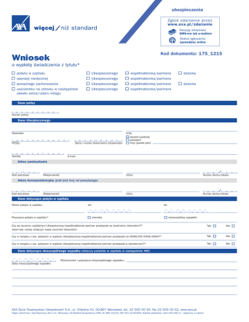 ubezpieczenia Zgłoś zdarzenie przez www.axa.pl/zdarzenie Decyzję otrzymasz SMS-em lub e-mailem Status zgłoszenia sprawdzisz online Kod dokumentu: 175_1215 Wniosek o wypłatę świadczenia z tytułu* pobytu w szpitalu Ubezpieczonego współmałżonka/partnera operacji medycznej Ubezpieczonego współmałżonka/partnera poważnego zachorowania Ubezpieczonego współmałżonka/partnera uszczerbku na zdrowiu w następstwie zawału serca/udaru mózgu Ubezpieczonego współmałżonka/partnera dziecka dziecka Dane polisy Numer polisy Dane Ubezpieczonego Nazwisko Seria i numer dokumentu tożsamości PESEL Telefon Imię dowód osobisty paszport inny (podać jaki) E-mail Adres zamieszkania - Kod pocztowy Miejscowość Ulica Numer domu/lokalu Ulica Numer domu/lokalu Adres korespondencyjny (jeśli jest inny od powyższego) - Kod pocztowy Miejscowość Dane dotyczące pobytu w szpitalu Okres pobytu w szpitalu od do D D M M R R R R Przyczyna pobytu w szpitalu* choroba D D M M R R R R nieszczęśliwy wypadek Czy po leczeniu szpitalnym Ubezpieczony/współmałżonek/partner przebywał na zwolnieniu lekarskim?* Jeżeli tak, należy dołączyć kopię zwolnień lekarskich. Tak Nie Czy w związku z ww. pobytem w szpitalu Ubezpieczony/współmałżonek/partner przebywał na OIOM/OIT/OIOK/OINK?* Tak Nie Czy w związku z ww. pobytem w szpitalu Ubezpieczony/współmałżonek/partner przebywał w sanatorium?* Tak Nie Dane dotyczące nieszczęśliwego wypadku (dotyczy pobytów w szpitalu w następstwie NW) D D M M R R R R Data nieszczęśliwego wypadku Okoliczności i przyczyna nieszczęśliwego wypadku: AXA Życie Towarzystwo Ubezpieczeń S.A., ul. Chłodna 51, 00-867 Warszawa, tel. 22 555 00 50, fax 22 555 00 52, www.axa.pl Organ rejestrowy: Sąd Rejonowy dla m.st. Warszawy, XII Wydział Gospodarczy KRS, Nr KRS 41216, NIP 521-10-36-859, Kapitał zakładowy: 444 440 000 zł – wpłacony w całości Miejsce (adres) nieszczęśliwego wypadku: Czy Ubezpieczony/współmałżonek/partner/dziecko w chwili wypadku znajdował/znajdowało się pod wpływem alkoholu?* Tak Nie Tak Nie Kto udzielił Ubezpieczonemu/współmałżonkowi/partnerowi/dziecku pomocy po wypadku? Czy był spisany protokół policyjny lub protokół przedstawiciela BHP w zakładzie pracy?* Jeżeli tak, należy dołączyć protokół. Adres policji, prokuratury, sądu prowadzącego(ych) postępowanie: Dane dotyczące leczenia (dotyczy uszczerbku na zdrowiu w następstwie zawału serca lub udaru mózgu) Czy leczenie zostało zakończone?* Jeżeli nie, przewidywana data zakończenia Tak Nie Czy rehabilitacja została zakończona?* D D M M R R R R Jeżeli nie, przewidywana data zakończenia Tak Nie D D M M R R R R Okres zwolnienia lekarskiego od D D M M R R R R D D M M R R R R od Dane dotyczące operacji medycznej/poważnego zachorowania** Data operacji medycznej / rozpoznania poważnego zachorowania D D M M R R R R Rodzaj operacji medycznej / poważnego zachorowania D D M M R R R R Data początku leczenia choroby/urazu D D M M R R R R Czy operacja/poważne zachorowanie związana(e) jest z chorobą/obrażeniami ciała rozpoznanymi i leczonymi przed przystąpieniem do umowy ubezpieczenia? Tak Nie Jeżeli tak, należy dołączyć historie choroby z przebiegu leczenia. Adresy placówek medycznych, w których leczył się Ubezpieczony/współmałżonek/partner/dziecko w związku ze zgłoszonym roszczeniem oraz adres przychodni lekarza rodzinnego w której zarejestrowany(e) jest Ubezpieczony/współmałżonek/partner/dziecko: Oświadczenie Ubezpieczonego/współmałżonka/partnera/dziecka Upoważniam Towarzystwo do zasięgania wszelkich informacji medycznych dotyczących stanu mojego zdrowia, w tym także do uzyskiwania kopii dokumentacji medycznej od każdego lekarza, u którego leczyłem(am) się lub zasięgałem(am) porady medycznej, a także we wszystkich placówkach medycznych i podmiotach wykonujących działalność leczniczą, które udzielały mi świadczeń zdrowotnych, koniecznych do ustalenia odpowiedzialności Towarzystwa. Równocześnie wyrażam zgodę na udostępnienie Towarzystwu przez lekarzy, placówki medyczne i podmioty wykonujące działalność leczniczą wszelkich informacji o stanie mojego zdrowia, w tym do przekazania kopii dokumentacji medycznej, o które Towarzystwo będzie zapytywało w związku z wykonywaniem ubezpieczenia. Powyższe nie dotyczy wyników badań genetycznych. Wyrażam zgodę na przetwarzanie przez AXA Życie Towarzystwo Ubezpieczeń S.A., z siedzibą w Warszawie (00-867) przy ul. Chłodnej 51 („Towarzystwo”), moich danych osobowych zawartych w tym wniosku oraz w innych dokumentach przekazanych Towarzystwu, w tym także danych o stanie zdrowia ujawnionych Towarzystwu w okresie obowiązywania i wykonywania umowy ubezpieczenia, w celach związanych z działalnością ubezpieczeniową Towarzystwa, w tym w celu realizacji świadczeń ubezpieczeniowych, oraz na powierzanie przez Towarzystwo przetwarzania tych danych Partnerowi Medycznemu AXA, na podstawie art. 31 ustawy o ochronie danych osobowych, i przekazywania tych danych innym podmiotom do celów związanych z wykonywaniem umowy ubezpieczenia. Jestem świadomy(a) dobrowolności udostępniania moich danych. Ponadto przyjmuję do wiadomości, iż mam prawo wglądu do moich danych oraz ich poprawiania. Zgoda na przetwarzanie moich danych osobowych obejmuje także przetwarzanie tych danych w przyszłości, o ile nie zmieni się cel przetwarzania tych danych. Wyrażam zgodę na przekazywanie Towarzystwu przez Narodowy Fundusz Zdrowia danych o nazwach i adresach świadczeniodawców, którzy udzielili mi świadczeń opieki zdrowotnej w związku z wypadkiem lub zdarzeniem losowym, będącym podstawą ustalenia odpowiedzialności Towarzystwa oraz wysokości odszkodowania lub świadczenia. Upoważniam Towarzystwo do zasięgania informacji w: – Zakładzie Ubezpieczeń Społecznych, w związku z wypadkiem lub zdarzeniem będącym podstawą ustalenia odpowiedzialnoś