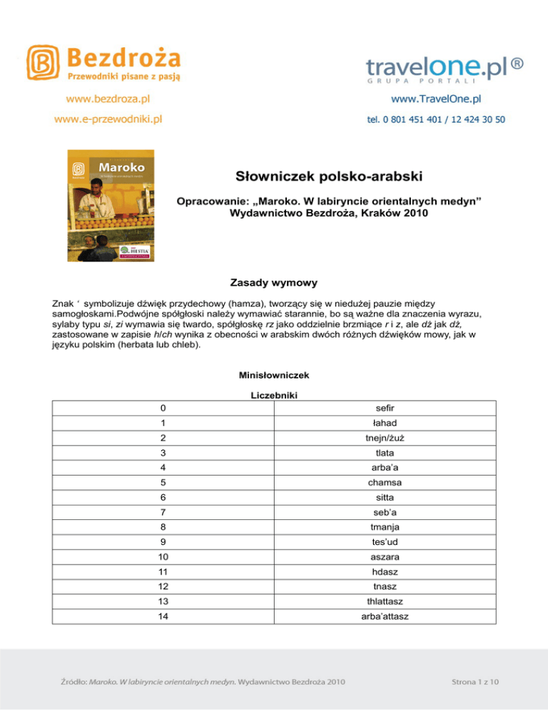 Słowniczek polsko-arabski Opracowanie: „Maroko. W labiryncie orientalnych medyn” Wydawnictwo Bezdroża, Kraków 2010 Zasady wymowy Znak ‘ symbolizuje dźwięk przydechowy (hamza), tworzący się w niedużej pauzie między samogłoskami.Podwójne spółgłoski należy wymawiać starannie, bo są ważne dla znaczenia wyrazu, sylaby typu si, zi wymawia się twardo, spółgłoskę rz jako oddzielnie brzmiące r i z, ale dż jak dż, zastosowane w zapisie h/ch wynika z obecności w arabskim dwóch różnych dźwięków mowy, jak w języku polskim (herbata lub chleb). Minisłowniczek Liczebniki 0 sefir 1 łahad 2 tnejn/żuż 3 tlata 4 arba’a 5 chamsa 6 sitta 7 seb’a 8 tmanja 9 tes’ud 10 aszara 11 hdasz 12 tnasz 13 thlattasz 14 arba’attasz 15 chamstasz 16 sittasz 17 seb’atasz 18 tmantasz 19 tsa’tasz 20 eszrin 21 łahad ła eszrin 30 tlatin 40 arba’in 50 chamsin 60 sittin 70 sab’in 80 tmanin 90 tis’in 100 mijj 200 mjatejn 300 teltmija 1000 alf Pozdrowienia i zwroty grzecznościowe Pokój z tobą (najczęściej używane). As-salaam alajkum (odpowiedź: ła alajkum assalaam). Dzień dobry. Sbah lchir. Do wiedzenia. Besslama. Dziękuję. Szukran. Proszę. Men fadlak. Witam. Ahlan ła sahlan. Zwrot powszechnie używany w różnych sytuacjach, oznaczający mniej więcej „kto to wie/Bóg jeden wie” Inszallah Przydatne słowa tak/nie na’am/la ile kam godzina saa dzień nahar noc lajl tydzień usbu dzisiaj ljoum jutro ghedda rano sabah wieczorem masa’an W drodze w południe al-zohor w lewo aljasar w prawo aljamin prosto al’amam wejście duchul wyjście churudż pociąg tren dworzec kolejowy lagar autobus l-kar dworzec autobusowy mahattat prom abbara bilet tazkera kasa asz-szubbak uwaga balek W mieście fontanna nafura lekarz tabib łaźnie hammam meczet dżam’a most dżisr plac saahat poczta barid policja szurta pomnik temsal ulica szaria Słowniczek polsko-francuski Zasady wymowy ostatnia głoska wyrazu zwykle nie jest wymawiana (chyba że samogłoska jest oznaczona akcentem, np. é). Wymawia się ostatnią spółgłoskę wyrazu, jeżeli na końcu jest samogłoska spółgłoski nosowe m i n poprzedzone samogłoskami nie są wymawiane, ale wskazują na unosowienie tych samogłosek (np. in/un wymawia się jak polskie ę, on/om jak polskie ą) wymowa innych głosek: au zbliżone do polskiego o ou zbliżone do polskiego u (jeśli znajduje się na początku wyrazu do l) eu między e i y oi jak la ai jak polskie e ci jak si que jak ke qui jak ki tion jak sja j jak ż g jak ż przed e, i, y, w innych przypadkach jak g s jak z między dwiema samogłoskami, inaczej jak s Minisłowniczek Liczebniki 0 zéro 1 un/une 2 deux 3 trois 4 quatre 5 cinq 6 six 7 sept 8 huit 9 neuf 10 dix 11 onze 12 douze 13 treize 14 quatorze 15 quinze 16 seize 17 dix-sept 18 dix-huit 19 dix-neuf 20 vingt 21 vingt et un/une 30 trente 40 quarante 50 cinquante 60 soixante 70 soixante-dix 80 quatre-vingt 90 quatre-vingt-dix 100 cent 200 deux cent 300 troix cent 1000 mille Pozdrowienia i podstawowe zwroty Dzień dobry. Bonjour. Dobry wieczór. Bonsoir. Dobranoc. Bonne nuit. Do wiedzenia. Au revoir. Cześć. Salut. Miłego dnia. Bonne journée. Jak się masz? Comment ça va? Dziękuję, dobrze. Ca va bien, merci. Proszę (prośba). S’il vous plaît. Dziękuję. Merci. Nie ma za co. De rien./Je vous en prie (grzeczniej). Przepraszam. Excusez-moi./Pardon. Uwaga! Attention! Pomocy! Au secours! Szerokiej drogi. Bon voyage. Nazywam się… Je m’appelle… Jestem Polką/Polakiem. Je suis Polonaise/Polonais. Nie mówię po francusku. Je ne parle pas français. Czy mówi pan/pani po angielsku? Parlez-vous anglais? Przydatne słowa tak/nie oui/non pan/pani/panna monsieur/madame/mademoiselle kobieta/mężczyzna femme/homme Znaki brak wolnych miejsc complet dla niepalących non fumeurs otwarte ouvert toalety toilettes wejście/wjazd entrée wyjście/wyjazd sortie zakaz interdit zamknięte fermé W drodze dworzec kolejowy gare dworzec autobusowy gare routière lotnisko aéroport pociąg train autobus bus, cars samolot avion peron quai rozkład jazdy horaires odjazdy/odloty départs przyjazdy/przyloty arrivées kasa biletowa caisse/billetterie bilet w jedną stronę un aller simple bilet w dwie strony un aller-retour pierwsza klasa première classe druga klasa deuxième classe rezerwacja réservation bagaż bagage przechowalnia bagażu consigne poczekalnia salle d’attente ambasada ambassade W mieście biuro informacji turystycznej office de tourisme bank banque bankomat distributeur de billets wymiana (pieniędzy) change centrum miasta centre-ville droga route meczet mosquée muzeum musée policja police posterunek policji poste de police poczta poste lekarz médecin szpital hôpital ulica rue/avenue/boulevard godziny otwarcia heures d’ouverture cena biletu prix d’entrée prosto tout droit w prawo à droite w lewo à gauche most pont Nocleg hotel hôtel schronisko młodzieżowe auberge de jeunesse kemping camping tanio bon marché wolne miejsca places libres jedynka chambre simple dwójka chambre double pokój z łazienką chambre avec salle de bains łazienka na korytarzu (wspólna) salle de bain commune prysznic douche ciepła woda l’eau chaude cena za pokój prix pour la chambre cena za osobę prix par personne Czas kiedy quand Która godzina? Quelle heure est il? O której godzinie? A quelle heure? dziś aujourd’hui jutro demain wczoraj hier rano matin południe midi popołudniu après-midi wieczór soir dzień/noc jour/nuit teraz maintenant później plus tard przedtem avant tydzień semaine miesiąc mois rok année Dni tygodnia poniedziałek lundi wtorek mardi środa mercredi czwartek jeudi piątek vendredi sobota samedi niedziela dimanche Miesiące styczeń janvier luty février marzec mars kwiecień avril maj mai czerwiec juin lipiec juillet sierpień août wrzesień septembre październik octobre listopad novembre grudzień décembre Posiłki śniadanie petit déjeuner obiad déjeneur kolacja dî