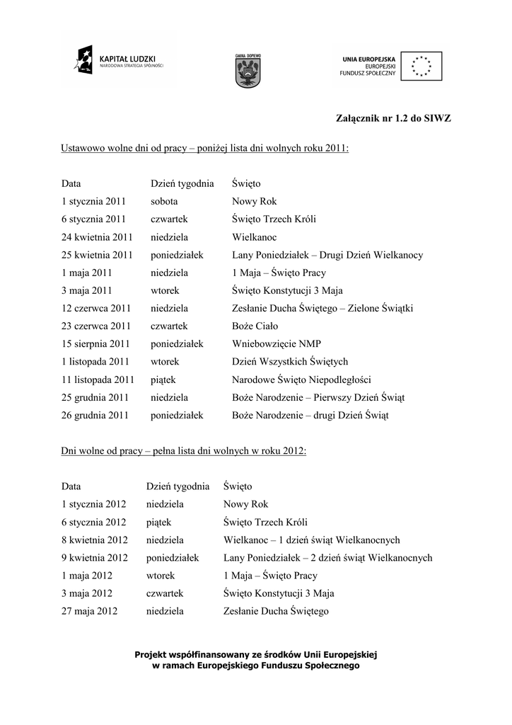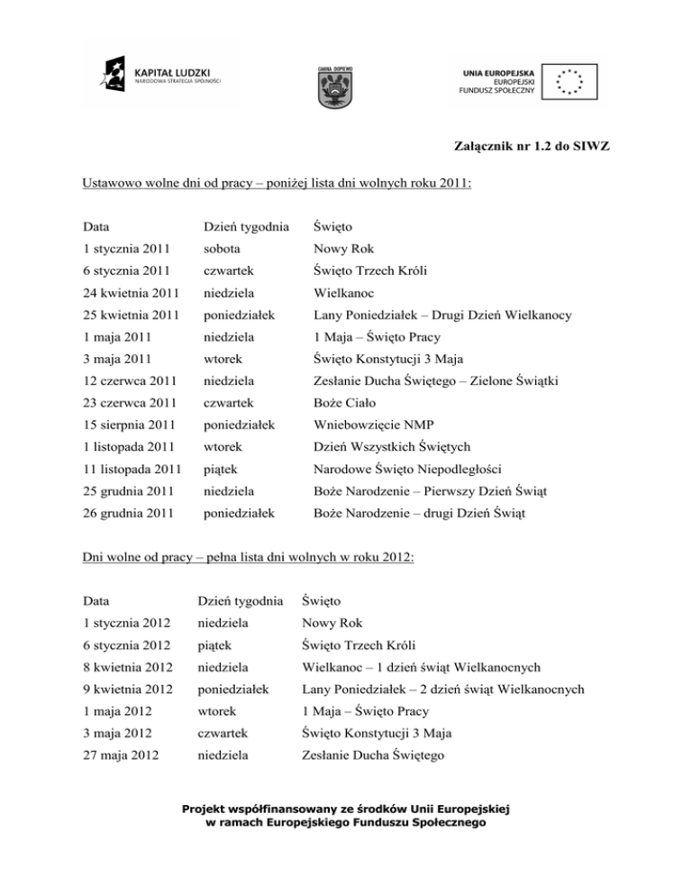Załącznik nr 1.2 do SIWZ Ustawowo wolne dni od pracy – poniŜej lista dni wolnych roku 2011: Data Dzień tygodnia Święto 1 stycznia 2011 sobota Nowy Rok 6 stycznia 2011 czwartek Święto Trzech Króli 24 kwietnia 2011 niedziela Wielkanoc 25 kwietnia 2011 poniedziałek Lany Poniedziałek – Drugi Dzień Wielkanocy 1 maja 2011 niedziela 1 Maja – Święto Pracy 3 maja 2011 wtorek Święto Konstytucji 3 Maja 12 czerwca 2011 niedziela Zesłanie Ducha Świętego – Zielone Świątki 23 czerwca 2011 czwartek BoŜe Ciało 15 sierpnia 2011 poniedziałek Wniebowzięcie NMP 1 listopada 2011 wtorek Dzień Wszystkich Świętych 11 listopada 2011 piątek Narodowe Święto Niepodległości 25 grudnia 2011 niedziela BoŜe Narodzenie – Pierwszy Dzień Świąt 26 grudnia 2011 poniedziałek BoŜe Narodzenie – drugi Dzień Świąt Dni wolne od pracy – pełna lista dni wolnych w roku 2012: Data Dzień tygodnia Święto 1 stycznia 2012 niedziela Nowy Rok 6 stycznia 2012 piątek Święto Trzech Króli 8 kwietnia 2012 niedziela Wielkanoc – 1 dzień świąt Wielkanocnych 9 kwietnia 2012 poniedziałek Lany Poniedziałek – 2 dzień świąt Wielkanocnych 1 maja 2012 wtorek 1 Maja – Święto Pracy 3 maja 2012 czwartek Święto Konstytucji 3 Maja 27 maja 2012 niedziela Zesłanie Ducha Świętego Projekt współfinansowany ze środków Unii Europejskiej w ramach Europejskiego Funduszu Społecznego 7 czerwca 2012 czwartek BoŜe Ciało 15 sierpnia 2012 środa Wniebowzięcie NMP 1 listopada 2012 czwartek Dzień Wszystkich Świętych 11 listopada 2012 niedziela Narodowe Święto Niepodległości 25 grudnia 2012 wtorek BoŜe Narodzenie – pierwszy dzień świąt 26 grudnia 2012 środa BoŜe Narodzenie – drugi dzień świąt Ustawowo wolne dni od pracy – lista dni wolnych do 30.04. 2013: Data Dzień tygodnia Święto 1 stycznia 2013 wtorek Nowy Rok 6 stycznia 2013 niedziela Święto Trzech Króli Projekt współfinansowany ze środków Unii Europejskiej w ramach Europejskiego Funduszu Społecznego