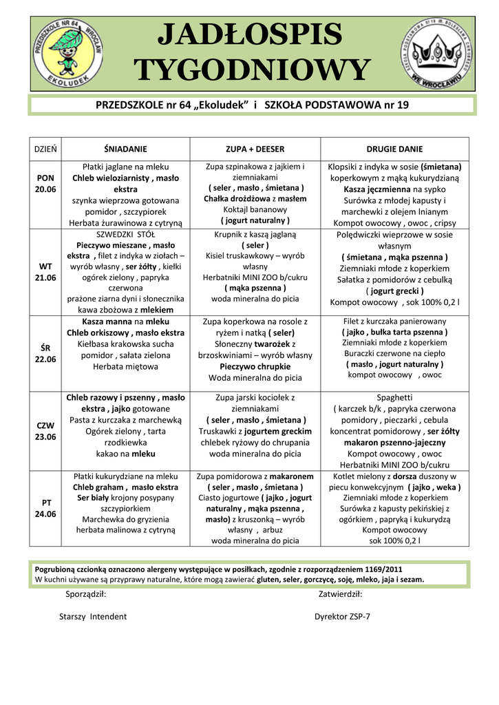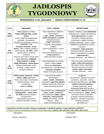 JADŁOSPIS TYGODNIOWY PRZEDSZKOLE nr 64 „Ekoludek” i SZKOŁA PODSTAWOWA nr 19 DZIEŃ PON 20.06 WT 21.06 ŚR 22.06 CZW 23.06 PT 24.06 ŚNIADANIE ZUPA + DEESER DRUGIE DANIE Płatki jaglane na mleku Chleb wieloziarnisty , masło ekstra szynka wieprzowa gotowana pomidor , szczypiorek Herbata żurawinowa z cytryną SZWEDZKI STÓŁ Pieczywo mieszane , masło ekstra , filet z indyka w ziołach – wyrób własny , ser żółty , kiełki ogórek zielony , papryka czerwona prażone ziarna dyni i słonecznika kawa zbożowa z mlekiem Kasza manna na mleku Chleb orkiszowy , masło ekstra Kiełbasa krakowska sucha pomidor , sałata zielona Herbata miętowa Zupa szpinakowa z jajkiem i ziemniakami ( seler , masło , śmietana ) Chałka drożdżowa z masłem Koktajl bananowy ( jogurt naturalny ) Krupnik z kaszą jaglaną ( seler ) Kisiel truskawkowy – wyrób własny Herbatniki MINI ZOO b/cukru ( mąka pszenna ) woda mineralna do picia Klopsiki z indyka w sosie (śmietana) koperkowym z mąką kukurydzianą Kasza jęczmienna na sypko Surówka z młodej kapusty i marchewki z olejem lnianym Kompot owocowy , owoc , cripsy Polędwiczki wieprzowe w sosie własnym ( śmietana , mąka pszenna ) Ziemniaki młode z koperkiem Sałatka z pomidorów z cebulką ( jogurt grecki ) Kompot owocowy , sok 100% 0,2 l Zupa koperkowa na rosole z ryżem i natką ( seler) Słoneczny twarożek z brzoskwiniami – wyrób własny Pieczywo chrupkie Woda mineralna do picia Filet z kurczaka panierowany ( jajko , bułka tarta pszenna ) Ziemniaki młode z koperkiem Buraczki czerwone na ciepło ( masło , jogurt naturalny ) kompot owocowy , owoc Chleb razowy i pszenny , masło ekstra , jajko gotowane Pasta z kurczaka z marchewką Ogórek zielony , tarta rzodkiewka kakao na mleku Zupa jarski kociołek z ziemniakami ( seler , masło , śmietana ) Truskawki z jogurtem greckim chlebek ryżowy do chrupania woda mineralna do picia Płatki kukurydziane na mleku Chleb graham , masło ekstra Ser biały krojony posypany szczypiorkiem Marchewka do gryzienia herbata malinowa z cytryną Zupa pomidorowa z makaronem ( seler , masło , śmietana ) Ciasto jogurtowe ( jajko , jogurt naturalny , mąka pszenna , masło) z kruszonką – wyrób własny , arbuz woda mineralna do picia Spaghetti ( karczek b/k , papryka czerwona pomidory , pieczarki , cebula koncentrat pomidorowy , ser żółty makaron pszenno-jajeczny Kompot owocowy , owoc Herbatniki MINI ZOO b/cukru Kotlet mielony z dorsza duszony w piecu konwekcyjnym ( jajko , weka ) Ziemniaki młode z koperkiem Surówka z kapusty pekińskiej z ogórkiem , papryką i kukurydzą Kompot owocowy sok 100% 0,2 l Pogrubioną czcionką oznaczono alergeny występujące w posiłkach, zgodnie z rozporządzeniem 1169/2011 W kuchni używane są przyprawy naturalne, które mogą zawierać gluten, seler, gorczycę, soję, mleko, jaja i sezam. Sporządził: Starszy Intendent Zatwierdził: Dyrektor ZSP-7