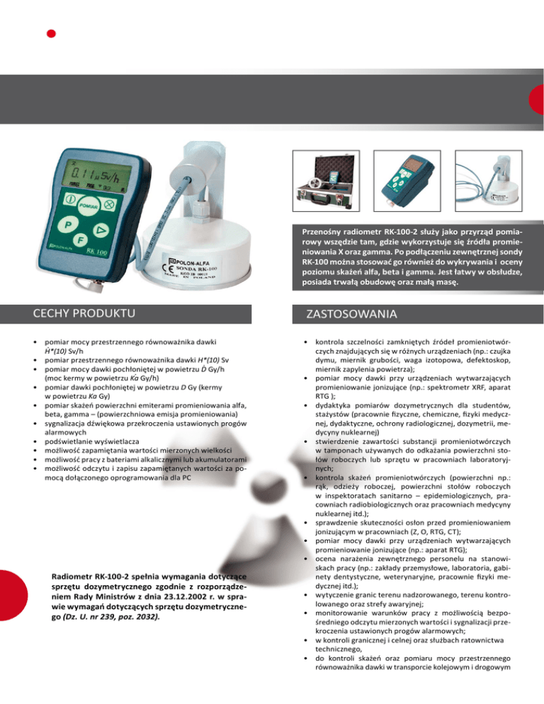 Przenośny radiometr RK-100-2 służy jako przyrząd pomiarowy wszędzie tam, gdzie wykorzystuje się źródła promieniowania X oraz gamma. Po podłączeniu zewnętrznej sondy RK-100 można stosować go również do wykrywania i oceny poziomu skażeń alfa, beta i gamma. Jest łatwy w obsłudze, posiada trwałą obudowę oraz małą masę. CECHY PRODUKTU • pomiar mocy przestrzennego równoważnika dawki . H*(10) Sv/h • pomiar przestrzennego równoważnika dawki H*(10) Sv . • pomiar mocy dawki pochłoniętej w powietrzu D Gy/h . (moc kermy w powietrzu Ka Gy/h) • pomiar dawki pochłoniętej w powietrzu D Gy (kermy w powietrzu Ka Gy) • pomiar skażeń powierzchni emiterami promieniowania alfa, beta, gamma – (powierzchniowa emisja promieniowania) • sygnalizacja dźwiękowa przekroczenia ustawionych progów alarmowych • podświetlanie wyświetlacza • możliwość zapamiętania wartości mierzonych wielkości • możliwość pracy z bateriami alkalicznymi lub akumulatorami • możliwość odczytu i zapisu zapamiętanych wartości za pomocą dołączonego oprogramowania dla PC Radiometr RK-100-2 spełnia wymagania dotyczące sprzętu dozymetrycznego zgodnie z rozporządzeniem Rady Ministrów z dnia 23.12.2002 r. w sprawie wymagań dotyczących sprzętu dozymetrycznego (Dz. U. nr 239, poz. 2032). ZASTOSOWANIA • kontrola szczelności zamkniętych źródeł promieniotwórczych znajdujących się w różnych urządzeniach (np.: czujka dymu, miernik grubości, waga izotopowa, defektoskop, miernik zapylenia powietrza); • pomiar mocy dawki przy urządzeniach wytwarzających promieniowanie jonizujące (np.: spektrometr XRF, aparat RTG ); • dydaktyka pomiarów dozymetrycznych dla studentów, stażystów (pracownie fizyczne, chemiczne, fizyki medycznej, dydaktyczne, ochrony radiologicznej, dozymetrii, medycyny nuklearnej) • stwierdzenie zawartości substancji promieniotwórczych w tamponach używanych do odkażania powierzchni stołów roboczych lub sprzętu w pracowniach laboratoryjnych; • kontrola skażeń promieniotwórczych (powierzchni np.: rąk, odzieży roboczej, powierzchni stołów roboczych w inspektoratach sanitarno – epidemiologicznych, pracowniach radiobiologicznych oraz pracowniach medycyny nuklearnej itd.); • sprawdzenie skuteczności osłon przed promieniowaniem jonizującym w pracowniach (Z, O, RTG, CT); • pomiar mocy dawki przy urządzeniach wytwarzających promieniowanie jonizujące (np.: aparat RTG); • ocena narażenia zewnętrznego personelu na stanowiskach pracy (np.: zakłady przemysłowe, laboratoria, gabinety dentystyczne, weterynaryjne, pracownie fizyki medycznej itd.); • wytyczenie granic terenu nadzorowanego, terenu kontrolowanego oraz strefy awaryjnej; • monitorowanie warunków pracy z możliwością bezpośredniego odczytu mierzonych wartości i sygnalizacji przekroczenia ustawionych progów alarmowych; • w kontroli granicznej i celnej oraz służbach ratownictwa technicznego, • do kontroli skażeń oraz pomiaru mocy przestrzennego równoważnika dawki w transporcie kolejowym i drogowym DANE TECHNICZNE Zakres pomiarowy dla sondy zewnętrznej - skażenia emiterami promieniotwórczymi alfa, beta i gamma do 104 s-1 Zakres pomiarowy dla sondy wewnętrznej - mocy przestrzennego równoważnika dawki do 50 mSv/h - mocy dawki pochłoniętej w powietrzu do 50 mGy/h - przestrzennego równoważnika dawki 0,1 µSv ÷ 10 Sv - dawki pochłoniętej w powietrzu 0,1 µGy ÷ 10 Gy Błąd wskazań dla Cs-137 dla sondy wewnętrznej - mocy przestrzennego równoważnika dawki powyżej 1µSv/h ≤ 20% - mocy dawki pochłoniętej w powietrzu powyżej 1 µGy/h ≤ 20% Nierównomierność charakterystyki energetycznej sondy wewnętrznej dla promieniowania gamma - w zakresie energii od 65 keV do 1 MeV ≤ 25% - w zakresie energii od 40 keV do 1,25 MeV ≤ 30% Nierównomierność charakterystyki energetycznej sondy zewnętrznej dla promieniowania gamma w zakresie energii od 40 keV do 1,25 MeV ≤ 25% Bieg własny: - przy pomiarze mocy przestrzennego równoważnika dawki ≤ 0,27 µSv/h - przy pomiarze mocy dawki ≤ 0,23 µGy/h - przy pomiarze skażeń ≤ 5 s-1 Zasilanie 6 V (4 x AAA) Pobór mocy bez promieniowania < 10 mW Zakres temperatur pracy -25 oC ÷ +40 oC OPROGRAMOWANIE RK-100-2 posiada możliwość komunikacji z komputerem w tzw. trybie „off-line” co oznacza, że podczas połączenia RK-100-2 nie dokonuje pomiarów a jedynie transmituje dane z/do komputera. Transmisja danych odbywa się z wykorzystaniem podczerwieni w sposób zgodny ze standardem IrDA. Przesyłaniu podlegają dane konfiguracyjne, współczynniki kalibracji, predefiniowane nastawy a także rejestracja zmiany dawki w czasie. WYMIARY [mm] RADIOMETR RK-100-2 SONDA ZEWNĘTRZNA RK-100 WYPOSAŻENIE STANDARDOWE WYPOSAŻENIE RK-100-2 PRODUKT NAZWA / TYP OPIS Radiometr RK-100-2 umożliwia pomiar pomiar mocy przestrzennego równoważnika dawki, pomiar przestrzennego równoważnika dawki, pomiar mocy kermy w powietrzu oraz pomiar kermy w powietrzu Walizka ochronna 4 x bateria AAA Oprogramowanie pozwala na bezpieczny transport urządzenia umożliwia zasilanie radiometru RK-100-2 pozwala na odczyt danych tabelarycznych i wykresów (dawka, moc dawki) czy też zmianę wybranych parametrów urządzenia (wartość progów alarmowych, współczynniki kalibracji) WYPOSAŻENIE OPCJONALNE PRODUKT NAZWA / TYP WYPOSAŻENIE SONDY ZEWNĘTRZNEJ RK-100 Adapter USB - IrDA OPIS umożliwia komunikację radiometru RK-100-2 z komputerem nie posiadającym portu IrDA Świadectwo Wzorcowania dostarczenie Świadectwa Wzorcowania przez Laboratorium Wzorcujące Urządzeń Dozymetrycznych przy Polon-Alfa (Akredytowane Laboratorium Wzorcujące Nr AP 109) Sonda zewnętrzna RK-100 umożliwia pomiar skażeń powierzchni substancjami alfa, beta i gamma promieniotwórczymi oraz promieniowania X; standardowa długość przewodu to ok. 1,25 m (opcjonalnie można zamówić przewód o dł. 2,5 m) Osłona sondy alfa odcina pr