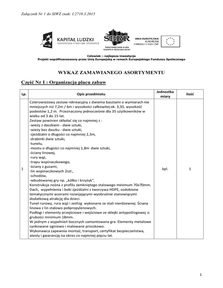 WYKAZ ZAMAWIANEGO ASORTYMENTU Część Nr I : Organizacja