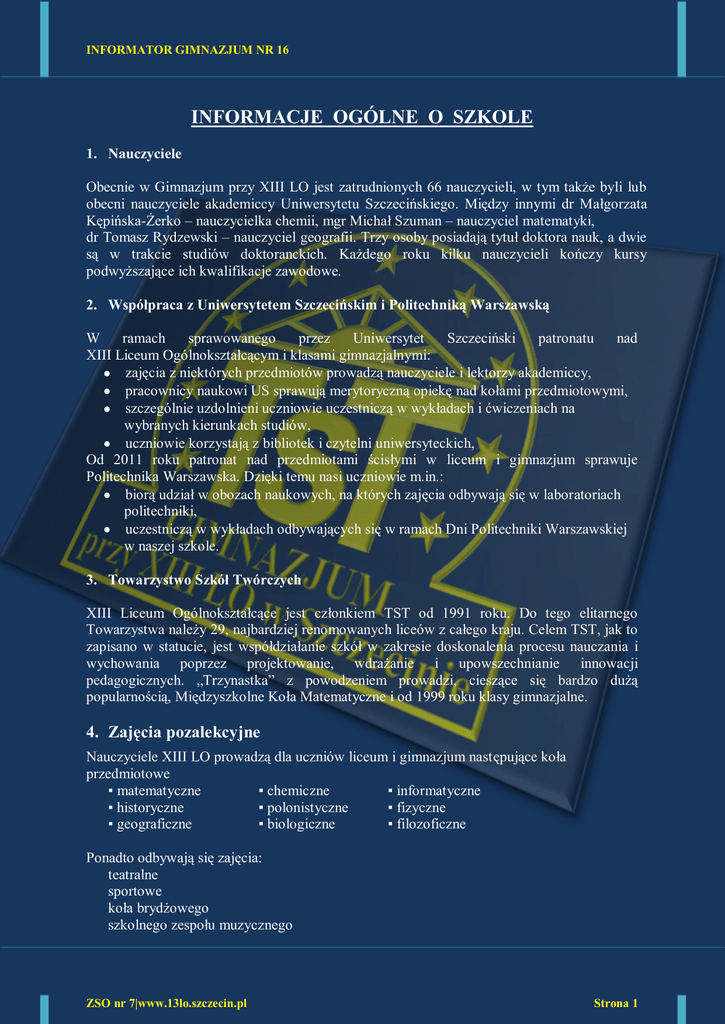 INFORMATOR GIMNAZJUM NR 16 INFORMACJE OGÓLNE O SZKOLE 1. Nauczyciele Obecnie w Gimnazjum przy XIII LO jest zatrudnionych 66 nauczycieli, w tym także byli lub obecni nauczyciele akademiccy Uniwersytetu Szczecińskiego. Między innymi dr Małgorzata Kępińska-Żerko – nauczycielka chemii, mgr Michał Szuman – nauczyciel matematyki, dr Tomasz Rydzewski – nauczyciel geografii. Trzy osoby posiadają tytuł doktora nauk, a dwie są w trakcie studiów doktoranckich. Każdego roku kilku nauczycieli kończy kursy podwyższające ich kwalifikacje zawodowe. 2. Współpraca z Uniwersytetem Szczecińskim i Politechniką Warszawską W ramach sprawowanego przez Uniwersytet Szczeciński patronatu nad XIII Liceum Ogólnokształcącym i klasami gimnazjalnymi: zajęcia z niektórych przedmiotów prowadzą nauczyciele i lektorzy akademiccy, pracownicy naukowi US sprawują merytoryczną opiekę nad kołami przedmiotowymi, szczególnie uzdolnieni uczniowie uczestniczą w wykładach i ćwiczeniach na wybranych kierunkach studiów, uczniowie korzystają z bibliotek i czytelni uniwersyteckich, Od 2011 roku patronat nad przedmiotami ścisłymi w liceum i gimnazjum sprawuje Politechnika Warszawska. Dzięki temu nasi uczniowie m.in.: biorą udział w obozach naukowych, na których zajęcia odbywają się w laboratoriach politechniki, uczestniczą w wykładach odbywających się w ramach Dni Politechniki Warszawskiej w naszej szkole. 3. Towarzystwo Szkół Twórczych XIII Liceum Ogólnokształcące jest członkiem TST od 1991 roku. Do tego elitarnego Towarzystwa należy 29, najbardziej renomowanych liceów z całego kraju. Celem TST, jak to zapisano w statucie, jest współdziałanie szkół w zakresie doskonalenia procesu nauczania i wychowania poprzez projektowanie, wdrażanie i upowszechnianie innowacji pedagogicznych. „Trzynastka” z powodzeniem prowadzi, cieszące się bardzo dużą popularnością, Międzyszkolne Koła Matematyczne i od 1999 roku klasy gimnazjalne. 4. Zajęcia pozalekcyjne Nauczyciele XIII LO prowadzą dla uczniów liceum i gimnazjum następujące koła przedmiotowe ▪ matematyczne ▪ chemiczne ▪ informatyczne ▪ historyczne ▪ polonistyczne ▪ fizyczne ▪ geograficzne ▪ biologiczne ▪ filozoficzne Ponadto odbywają się zajęcia: teatralne sportowe koła brydżowego szkolnego zespołu muzycznego ZSO nr 7|www.13lo.szczecin.pl Strona 1 INFORMATOR GIMNAZJUM NR 16 5. Pracownie komputerowe Jednymi z najlepiej wyposażonych pracowni przedmiotowych w XIII LO są pracownie komputerowe. Pracownie umożliwiają pracę w systemach Microsoft Windows XP, Windows VISTA oraz Linux. Wszystkie komputery połączone są w sieć lokalną opartą na architekturze Windows Server 2003. Program nauczania obejmuje naukę używania popularnych aplikacji biurowych, korzystania z sieci Internet, a także podstawy programowania i algorytmiki. Ponadto każdy uczeń ma możliwość bezpłatnego otrzymania konta pocztowego, miejsca na publikowanie własnych witryn WWW, konta FTP oraz konta shellowego na naszym szkolnym serwerze internetowym (13lo.szczecin.pl). 6. Opieka medyczna W szkole znajduje się gabinet medyczny, w którym opiekę nad uczniami sprawuje pielęgniarka. 7. W szkole funkcjonuje stołówka oraz bufet w klubie uczniowskim. 8. Rodzice W „Trzynastce” aktywnie działa Rada Rodziców i Rada Szkoły, która zgodnie z zapisami w ustawie o systemie oświaty, gromadzi środki finansowe na swoim koncie. Pochodzą one z wpłat rodziców uczniów. Miesięczna składka na Radę Szkoły wynosi 30 złotych. Pieniądze przeznaczane są na: doposażenie pracowni przedmiotowych w pomoce dydaktyczne, imprezy szkolne i klasowe, powiększanie księgozbioru szkolnej biblioteki, prowadzenie kół przedmiotowych. ZSO nr 7|www.13lo.szczecin.pl Strona 2