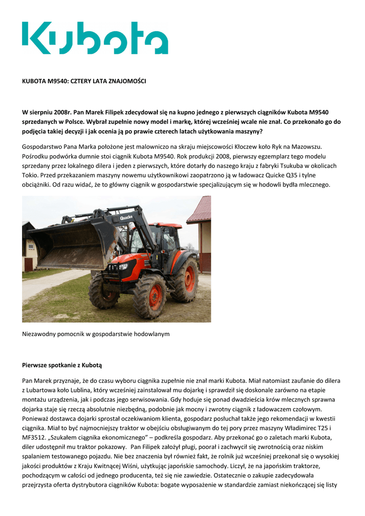 KUBOTA M9540: CZTERY LATA ZNAJOMOŚCI W sierpniu 2008r. Pan Marek Filipek zdecydował się na kupno jednego z pierwszych ciągników Kubota M9540 sprzedanych w Polsce. Wybrał zupełnie nowy model i markę, której wcześniej wcale nie znał. Co przekonało go do podjęcia takiej decyzji i jak ocenia ją po prawie czterech latach użytkowania maszyny? Gospodarstwo Pana Marka położone jest malowniczo na skraju miejscowości Kłoczew koło Ryk na Mazowszu. Pośrodku podwórka dumnie stoi ciągnik Kubota M9540. Rok produkcji 2008, pierwszy egzemplarz tego modelu sprzedany przez lokalnego dilera i jeden z pierwszych, które dotarły do naszego kraju z fabryki Tsukuba w okolicach Tokio. Przed przekazaniem maszyny nowemu użytkownikowi zaopatrzono ją w ładowacz Quicke Q35 i tylne obciążniki. Od razu widać, że to główny ciągnik w gospodarstwie specjalizującym się w hodowli bydła mlecznego. Niezawodny pomocnik w gospodarstwie hodowlanym Pierwsze spotkanie z Kubotą Pan Marek przyznaje, że do czasu wyboru ciągnika zupełnie nie znał marki Kubota. Miał natomiast zaufanie do dilera z Lubartowa koło Lublina, który wcześniej zainstalował mu dojarkę i sprawdził się doskonale zarówno na etapie montażu urządzenia, jak i podczas jego serwisowania. Gdy hoduje się ponad dwadzieścia krów mlecznych sprawna dojarka staje się rzeczą absolutnie niezbędną, podobnie jak mocny i zwrotny ciągnik z ładowaczem czołowym. Ponieważ dostawca dojarki sprostał oczekiwaniom klienta, gospodarz posłuchał także jego rekomendacji w kwestii ciągnika. Miał to być najmocniejszy traktor w obejściu obsługiwanym do tej pory przez maszyny Władimirec T25 i MF3512. „Szukałem ciągnika ekonomicznego” – podkreśla gospodarz. Aby przekonać go o zaletach marki Kubota, diler udostępnił mu traktor pokazowy. Pan Filipek założył pługi, poorał i zachwycił się zwrotnością oraz niskim spalaniem testowanego pojazdu. Nie bez znaczenia był również fakt, że rolnik już wcześniej przekonał się o wysokiej jakości produktów z Kraju Kwitnącej Wiśni, użytkując japońskie samochody. Liczył, że na japońskim traktorze, pochodzącym w całości od jednego producenta, też się nie zawiedzie. Ostatecznie o zakupie zadecydowała przejrzysta oferta dystrybutora ciągników Kubota: bogate wyposażenie w standardzie zamiast niekończącej się listy kosztownych opcji. Nabywca zamówił jednak u Dilera jeden niecodzienny dodatek: odtwarzacz DVD z ekranem wbudowanym w daszek przeciwsłoneczny. „Nigdy wcześniej nie miałem tak równo zaoranego pola” – chwali się. Wrażenia z eksploatacji Jak więc po czterech latach właściciel ocenia swój nabytek? Według opinii Pana Marka ciągnik Kubota M9540 to idealny wybór dla gospodarstwa hodowlanego. Świetna zwrotność tego traktora i wydajny rewers czynią codzienne prace o wiele łatwiejszymi - szczególnie w zestawie z ładowaczem renomowanej firmy. Gospodarz nie może się nachwalić doskonałej współpracy swojego traktora z dobrze wyważonym ładowaczem Quicke o zwartej i lekkiej konstrukcji. Swój zestaw roboczy określa jednym słowem: „zadziwiający”. Wydajna pompa hydrauliczna ciągnika Kubota z łatwością obsługuje siłowniki ładowacza, gwarantując natychmiastową reakcję na ruchy dźwignią sterującą. Przedni most o przekładni stożkowej nie tylko pozwala ciągnikowi zawracać niemal w miejscu, ale także bez obaw manewrować z obciążoną łyżką przy włączonym przednim napędzie. Właściciel określa ciągnik o przebiegu 1900 mth jako „bezproblemowy” i wolny nawet od drobnych przypadłości. Chwali również serwis Kubota, który szybko i sprawnie usunął niedomaganie rewersu hydraulicznego – jedyną awarię przez te cztery lata pracy. Oczywiście, Pan Marek widzi kilka punktów, nad którymi producent ciągnika mógłby jeszcze popracować. Życzyłby sobie, aby skrzynia biegów działała lżej, kabina była bardziej przestronna, a cały traktor posiadał większą masę. Jednak większa kabina utrudniłaby bezpieczny wjazd do obory, a większa masa wpłynęłaby negatywnie na ekonomię – główny powód zadowolenia Pana Filipka. Oszczędność, która daje satysfakcję „Spalania wcale już nie mierzę” – podkreśla właściciel. Podczas tych czterech lat przekonał się, że zarówno w orce, w ładowaczu, jak i w innych pracach ciągnik potrafi spalić zadziwiająco mało paliwa. W orce czterozagonowym, importowanym pługiem na pagórkowatym, klinowym polu o glebie gliniastej uzyskał wynik spalania 10,3 litra na hektar. Przy bardzo lekkiej pracy w ugniataniu kukurydzy: 3,0 litra na godzinę. A w ładowaczu czołowym? Tu właściciel twierdzi, że Kubota spala około 5 litrów na godzinę przy ładowaniu bel. To niewiele więcej od o połowę słabszego MF-a, który do tej pory był dla gospodarza wzorem ekonomii. Jaki jest sekret Pana Marka? Precyzyjny dobór przełożeń tak, aby obroty nie przekroczyły 2000 obr/min . Dla przykładu, spalanie 10,3 litra na hektar orki wymagającej gleby osiągnął utrzymując obroty silnika w zakresie 1600-1700 obr/min. Standardowa skrzynia biegów o 36-ciu przełożeniach i seryjnie montowane „pełzaki" pozwalają zawsze znaleźć właściwy bieg. Przekonywanie niedowiarków A jak zareagowali znajomi rolnicy, gdy ten egzotyczny ciągnik pojawił się na podwórku Pana Marka? „Ciągle czekają, aż się zepsuje” – uśmiecha się gospodarz. Z drugiej strony, szczególnie na początku, ta nowość wzbudzała ogromne zainteresowanie w okolicy. Oprócz niezliczonych telefonów, nasz rozmówca miał co najmniej 2 wizyty miesięcznie osób, które rozważały zakup ciągnika Kubota. Najtrudniejsze pytanie, jakie często słyszy, to: ile kosztują części zamienne i jaka jest ich dostępność. Sam jeszcze żadnej nie musiał kupić, więc nie zna na nie odpowiedzi. Gospodarz twierdzi, że nie musi nikogo przekonywać do zalet traktora, wysta