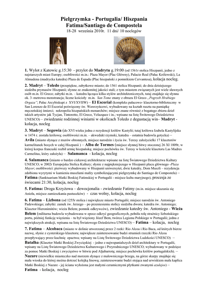 Pielgrzymka - Portugalia/ Hiszpania Fatima/Santiago de Compostela 18-28 września 2010r. 11 dni/ 10 noclegów 1. Wylot z Katowic g.15:30 - przylot do Madrytu g.19:00 (od 1561r stolica Hiszpanii, jedno z najstarszych miast Europy; osobliwości m.in.: Plaza Mayor (Plac Główny), Palacio Real (Pałac Królewski), La Almudena (madrycka katedra) Plaza de Espada (Plac hiszpański z pomnikiem Cervantesa), kolacja nocleg. 2. Madryt – Toledo (przepiękne, zabytkowe miasto; do 1561 stolica Hiszpanii; do dnia dzisiejszego siedziba prymasów Hiszpanii; słynne ze znakomitej jakości stali; z tym miastem związanych jest wiele sławnych osób m.in. El Greco; zabytki m.in. – katedra łącząca kilka stylów architektonicznych, tutaj znajduje się słynna ok. 3–metrowa monstrancja; liczne kościoły m.in. San Tome znany z obrazu El Greco „Pogrzeb Hrabiego Orgaza”; Pałac Arcybiskupi z XVI/XVIIW) – El Escorial (kompleks pałacowo- klasztorno-biblioteczny w San Lorenzo de El Escorial poświęcony św. Wawrzyńcowi, wybudowany na kształt rusztu na pamiątkę męczeńskiej śmierci; nekropolia hiszpańskich monarchów; miejsce znane również z bogatego zbioru dzieł takich artystów jak Tycjan, Tintoretto, El Greco, Velazquez i in.; wpisane na listę Świtowego Dziedzictwa UNESCO) – zwiedzanie rodzinnej winiarni w okolicach Toledo z degustacją win– Madryt - kolacja, nocleg 3. Madryt – Segowia (do XVI wieku jedna z rezydencji królów Kastylii; tutaj królowa Izabela Kastylijska w 1474 r. została królową; osobliwości m.in. – akwedukt rzymski, katedra – ostatnia budowla gotycka) – Avila (miasto słynące z murów obronnych, miejsce narodzin i życia św. Teresy założycielki 17 klasztorów karmelitanek bosych w całej Hiszpanii ) – Alba de Tormes (miejsce słynnej bitwy stoczonej 26 XI 1809r, w której korpus francuski rozbił armię hiszpańską; miejsce pochówku św. Teresy w kościele klasztoru Las Madres Carmelitas, który założyła) – Salamanca - kolacja, nocleg 4. Salamanca (miasto o bardzo ciekawej architekturze wpisane na listę Światowego Dziedzictwa Kultury UNESCO; w 2002r Europejska Stolica Kultury; słynie z najpiękniejszego w Hiszpanii placu głównego -Plaza Mayor; osobliwości: pierwszy wybudowany w Hiszpanii uniwersytet, dwie katedry, Dom Muszli – rezydencja zdobiona wyrytymi w kamieniu muszlami małży symbolizującymi pielgrzymkę do Santiago de Compostela) – Fatima (Sanktuarium Matki Boskiej Fatimskiej w Portugalii - miejsce kultu maryjnego), procesja ze świecami 21:30, kolacja, nocleg 5. Fatima: Droga Krzyżowa – dewocjonalia - zwiedzanie Fatimy (m.in. miejsce ukazania się Anioła, miejsce zamieszkania pastuszków) - czas wolny, kolacja, nocleg 6. Fatima – Lizbona (od 1255r stolica i największe miasto Portugalii; miejsce narodzin św. Antoniego Padewskiego; zabytki: zamek św. Jerzego – po przeniesieniu stolicy siedziba dworu; katedra św. Antoniego; Klasztor Hieronimitów; wieża Belem; pomnik odkrywców), zwiedzanie katedry św. Antoniego - Wieża Belem (militarna budowla wybudowana w epoce odkryć geograficznych, pełniła rolę strażnicy lizbońskiego portu, później funkcję więzienia – tu był więziony Józef Bem, twórca Legionu Polskiego w Portugalii; jedna z największych atrakcji, wpisana na listę Światowego Dziedzictwa UNESCO) – Fatima – kolacja, nocleg 7. Fatima – Alcobaca (miasto w dolinie utworzonej przez 2 rzeki: Rio Alcoa i Rio Baca, od których bierze nazwę, słynie z cysterskiego klasztoru; największe zainteresowanie budzi strumień rzeczki Rio Alcoa przepływający przez kuchnię opactwa; wpisany na Listę Świtowego Dziedzictwa Ludzkości UNESCO) – Batalha (Klasztor Matki Boskiej Zwycięskiej - jedno z najwspanialszych dzieł architektury w Portugalii, wpisany na Listę Światowego Dziedzictwa Kulturowego i Przyrodniczego UNESCO; wybudowany w podzięce za pomoc Matki Boskiej i zwycięstwo w bitwie pod Aljubarrotą; miejsce pochówku królów portugalskich). – Nazare (niewielkie miasteczko nad morzem słynące z malowniczego brzegu, na górze skarpy znajduje się mała wioska do której można dotrzeć kolejką linową; zainteresowanie budzi stojąca nad urwiskiem mała kaplica Matki Boskiej z Nazare - jej ściana wyłożona jest małymi ceramicznymi płytkami zwanymi azulejos) – Fatima - kolacja, nocleg 8. Fatima – Coimbra (w latach 1139 do 1255 stolica Portugalii; tutaj mieści się najstarszy w Europie uniwersytet z ciekawymi turystycznie obiektami: barokową wieżą zegarową, Salą Profesorów z portretami królów i prowadzącymi do niej pięknie zdobionymi schodami, słynną biblioteką) – Porto (miasto znane z sławnego na cały świat wina o tej samej nazwie; interesującym obiektem jest dwupoziomowy most nad rzeką Duro zaprojektowany przez Teofila Seyriga, ucznia Gustawa Eiffla), zwiedzanie winiarni Padron/Santiago de Compostela (wg legendy św. Jakub, zaraz po śmierci Chrystusa, sprowadził chrześcijaństwo do Hiszpanii. Po powrocie do Judei został zabity przez Heroda. Uczniowie św. Jakuba uciekli z jego ciałem i przypłynęli magicznym statkiem bez żagli i załogi do wioski Padron, a ciało pochowali w pobliżu. Na tym miejscu powstało później miasto Santiago de Compostela) – kolacja, nocleg 9. Santiago de Compostela (trzecie po Jerozolimie i Rzymie najważniejsze święte miejsce chrześcijaństwa; Droga św. Jakuba - Camino de Santiago- szlaki pielgrzymkowe istniejące od ok. 1000 lat prowadzące do katedry wybudowanej w miejscu znalezienia szczątków św. Jakuba, symbolem jest muszla św. Jakuba, po którą pierwotnie udawano się nad pobliskie wybrzeże i zabierano jako dowód i pamiątkę pielgrzymki), Msza św. w katedrze , zwiedzanie miasta, rejs statkiem po morzu, wycieczka objazdowa po Galicji (region Hiszpanii podzielony na 4 prowincje La Corunę, Lugo, Odense, Pontavedrę; z wybrzeżem z charakterystycznymi wąskimi morskimi zatokami (rias)- idealne miejs