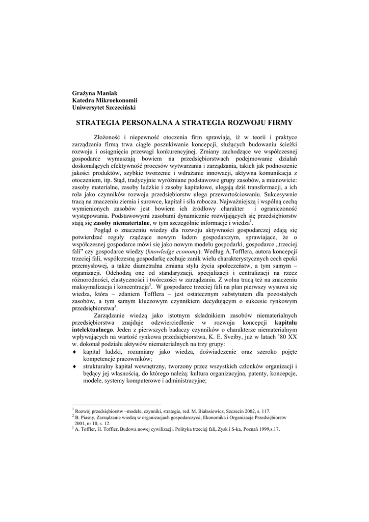 Grażyna Maniak Katedra Mikroekonomii Uniwersytet Szczeciński STRATEGIA PERSONALNA A STRATEGIA ROZWOJU FIRMY Złożoność i niepewność otoczenia firm sprawiają, iż w teorii i praktyce zarządzania firmą trwa ciągłe poszukiwanie koncepcji, służących budowaniu ścieżki rozwoju i osiągnięcia przewagi konkurencyjnej. Zmiany zachodzące we współczesnej gospodarce wymuszają bowiem na przedsiębiorstwach podejmowanie działań doskonalących efektywność procesów wytwarzania i zarządzania, takich jak podnoszenie jakości produktów, szybkie tworzenie i wdrażanie innowacji, aktywna komunikacja z otoczeniem, itp. Stąd, tradycyjnie wyróżniane podstawowe grupy zasobów, a mianowicie: zasoby materialne, zasoby ludzkie i zasoby kapitałowe, ulegają dziś transformacji, a ich rola jako czynników rozwoju przedsiębiorstw ulega przewartościowaniu. Sukcesywnie tracą na znaczeniu ziemia i surowce, kapitał i siła robocza. Najważniejszą i wspólną cechą wymienionych zasobów jest bowiem ich źródłowy charakter i ograniczoność występowania. Podstawowymi zasobami dynamicznie rozwijających się przedsiębiorstw stają się zasoby niematerialne, w tym szczególnie informacje i wiedza1. Pogląd o znaczeniu wiedzy dla rozwoju aktywności gospodarczej zdają się potwierdzać reguły rządzące nowym ładem gospodarczym, sprawiające, że o współczesnej gospodarce mówi się jako nowym modelu gospodarki, gospodarce „trzeciej fali” czy gospodarce wiedzy (knowledge economy). Według A.Tofflera, autora koncepcji trzeciej fali, współczesną gospodarkę cechuje zanik wielu charakterystycznych cech epoki przemysłowej, a także diametralna zmiana stylu życia społeczeństw, a tym samym – organizacji. Odchodzą one od standaryzacji, specjalizacji i centralizacji na rzecz różnorodności, elastyczności i twórczości w zarządzaniu. Z wolna tracą też na znaczeniu maksymalizacja i koncentracja2. W gospodarce trzeciej fali na plan pierwszy wysuwa się wiedza, która – zdaniem Tofflera – jest ostatecznym substytutem dla pozostałych zasobów, a tym samym kluczowym czynnikiem decydującym o sukcesie rynkowym przedsiębiorstwa3. Zarządzanie wiedzą jako istotnym składnikiem zasobów niematerialnych przedsiębiorstwa znajduje odzwierciedlenie w rozwoju koncepcji kapitału intelektualnego. Jeden z pierwszych badaczy czynników o charakterze niematerialnym wpływających na wartość rynkowa przedsiębiorstwa, K. E. Sveiby, już w latach ’80 XX w. dokonał podziału aktywów niematerialnych na trzy grupy: ♦ kapitał ludzki, rozumiany jako wiedza, doświadczenie oraz szeroko pojęte kompetencje pracowników; ♦ strukturalny kapitał wewnętrzny, tworzony przez wszystkich członków organizacji i będący jej własnością, do którego należą: kultura organizacyjna, patenty, koncepcje, modele, systemy komputerowe i administracyjne; 1 Rozwój przedsiębiorstw –modele, czynniki, strategie, red. M. Białasiewicz, Szczecin 2002, s. 117. B. Piasny, Zarządzanie wiedzą w organizacjach gospodarczych, Ekonomika i Organizacja Przedsiębiorstw 2001, nr 10, s. 12. 3 A. Toffler, H. Toffler, Budowa nowej cywilizacji. Polityka trzeciej fali, Zysk i S-ka, Poznań 1999,s.17. 2 ♦ strukturalny kapitał zewnętrzny, obrazujący relacje firmy z rynkiem, tj. z klientami i dostawcami, a składający się z reputacji firmy lub marek handlowych, sieci kontaktów, baz danych o rynku i klientach4. Mimo iż od podjęcia pierwszych badań nad istotą kapitału intelektualnego upłynęło wiele czasu, nadal pozostaje on kategorią wieloznaczną i różnie określaną przez poszczególnych autorów5. Niemniej jednak można przyjąć, iż istotą kapitału intelektualnego firmy są interakcje między: ♦ kapitałem przypisanym jednostce (zwanym kapitałem indywidualnym lub kapitałem ludzkim), rozumianym jako wykształcenie, doświadczenie i umiejętności osobiste i społeczne pracowników, zorientowane na zewnątrz w kierunku klientów przedsiębiorstwa ♦ a kapitałem przypisanym organizacji (kapitałem strukturalnym), czyli doświadczeniu i koncepcjom wypracowanym w całej organizacji, w celu rozwiązywania problemów klientów6. W najnowszych ujęciach struktury kapitału intelektualnego firmy pojawia się dodatkowy element: kapitał konkurencyjny, obejmujący ten rodzaj wiedzy, która dotyczy działań konkurentów: ich strategii, sposobu marketingowego kreowania swojej oferty, itp. Podobnie jak inne rodzaje kapitału intelektualnego, stanowi on element unikalnej wiedzy posiadanej przez jednostki lub zespoły pracowników, którzy rozumieją lepiej niż inni sposób, w jaki konkurenci myślą i działają7. Znaczenie zasobów, szczególnie niematerialnych, jako potencjalnego źródła zdobywania przewagi konkurencyjnej sprawia, iż wzrasta rola pracowników, którzy ucieleśniają - tworzą i rozwijają - wartość kapitału intelektualnego firmy. Tworzenie innowacji, oferowanie unikalnego produktu bądź usług w sposób utrudniający imitację aktualnym i potencjalnym konkurentom, wymaga skoordynowanego współdziałania różnorodnych, nakładających się na siebie i wzajemnie uzupełniających kompetencji. Złożona struktura społecznych relacji w procesie budowania przewagi konkurencyjnej firmy uzasadnia uznanie zasobów ludzkich za zasób strategiczny.8 Takie postrzeganie roli czynnika ludzkiego wymaga odmiennego niż tradycyjne podejścia. Poszukiwania i dyskusje odnośnie sposobów efektywnego pozyskiwania, rozwoju i mobilizowania zasobów ludzkich toczą się na gruncie teorii planowania i zarządzania strategicznego. Zarządzanie strategiczne jest kompleksowym, ciągłym procesem zarządzania nastawionym na formułowanie i wdrażanie skutecznych strategii sprzyjających wyższemu stopniowi zgodności organizacji i jej otoczenia oraz osiągnięciu celów strategicznych9. Proces zarządzania strategicznego obejmuje zazwyczaj kilka kolejno następujących po sobie etapów: