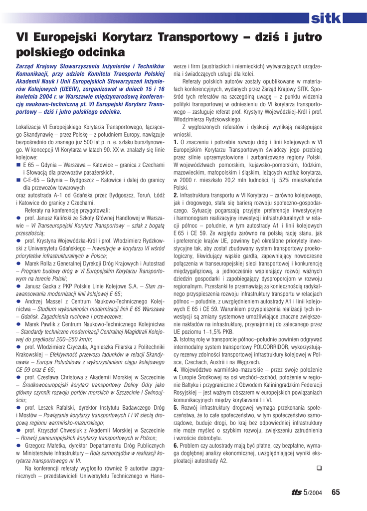 sitk VI Europejski Korytarz Transportowy – dziś i jutro polskiego odcinka Zarząd Krajowy Stowarzyszenia Inżynierów i Techników Komunikacji, przy udziale Komitetu Transportu Polskiej Akademii Nauk i Unii Europejskich Stowarzyszeń Inżynierów Kolejowych (UEEIV), zorganizował w dniach 15 i 16 kwietnia 2004 r. w Warszawie międzynarodową konferencję naukowo-techniczną pt. VI Europejski Korytarz Transportowy – dziś i jutro polskiego odcinka. Lokalizacja VI Europejskiego Korytarza Transportowego, łączącego Skandynawię – przez Polskę – z południem Europy, nawiązuje bezpośrednio do znanego już 500 lat p. n. e. szlaku bursztynowego. W koncepcji VI Korytarza w latach 90. XX w. znalazły się linie kolejowe: E 65 – Gdynia – Warszawa – Katowice – granica z Czechami i Słowacją dla przewozów pasażerskich, C-E-65 – Gdynia – Bydgoszcz – Katowice i dalej do granicy dla przewozów towarowych oraz autostrada A-1 od Gdańska przez Bydgoszcz, Toruń, Łódź i Katowice do granicy z Czechami. Referaty na konferencję przygotowali: prof. Janusz Kaliński ze Szkoły Głównej Handlowej w Warszawie – VI Transeuropejski Korytarz Transportowy – szlak z bogatą przeszłością; prof. Krystyna Wojewódzka-Król i prof. Włodzimierz Rydzkowski z Uniwersytetu Gdańskiego – Inwestycje w korytarzu VI wśród priorytetów infrastrukturalnych w Polsce; Marek Rolla z Generalnej Dyrekcji Dróg Krajowych i Autostrad – Program budowy dróg w VI Europejskim Korytarzu Transportowym na terenie Polski; Janusz Gacka z PKP Polskie Linie Kolejowe S.A. – Stan zaawansowania modernizacji linii kolejowej E 65; Andrzej Massel z Centrum Naukowo-Technicznego Kolejnictwa – Studium wykonalności modernizacji linii E 65 Warszawa – Gdańsk. Zagadnienia ruchowe i przewozowe; Marek Pawlik z Centrum Naukowo-Technicznego Kolejnictwa – Standardy techniczne modernizacji Centralnej Magidtrali Kolejowej do prędkości 200–250 km/h; prof. Włodzimierz Czyczuła, Agnieszka Filarska z Politechniki Krakowskiej – Efektywność przewozu ładunków w relacji Skandynawia – Europa Południowa z wykorzystaniem ciągu kolejowego CE 59 oraz E 65; prof. Czesława Christowa z Akademii Morskiej w Szczecinie – Środkowoeuropejski korytarz transportowy Doliny Odry jako główny czynnik rozwoju portów morskich w Szczecinie i Świnoujściu; prof. Leszek Rafalski, dyrektor Instytutu Badawczego Dróg i Mostów – Powiązanie korytarzy transportowych I i VI siecią drogową regionu warmińsko-mazurskiego; prof. Krzysztof Chwesiuk z Akademii Morskiej w Szczecinie – Rozwój paneuropejskich korytarzy transportowych w Polsce; Grzegorz Małetka, dyrektor Departamentu Dróg Publicznych w Ministerstwie Infrastruktury – Rola samorządów w realizacji korytarza transportowego nr VI. Na konferencji referaty wygłosiło również 9 autorów zagranicznych – przedstawicieli Uniwersytetu Technicznego w Hano- werze i firm (austriackich i niemieckich) wytwarzających urządzenia i świadczących usługi dla kolei. Referaty polskich autorów zostały opublikowane w materiałach konferencyjnych, wydanych przez Zarząd Krajowy SITK. Spośród tych referatów na szczególną uwagę – z punktu widzenia polityki transportowej w odniesieniu do VI korytarza transportowego – zasługuje referat prof. Krystyny Wojewódzkiej-Król i prof. Włodzimierza Rydzkowskiego. Z wygłoszonych referatów i dyskusji wynikają następujące wnioski. 1. O znaczeniu i potrzebie rozwoju dróg i linii kolejowych w VI Europejskim Korytarzu Transportowym świadczy jego przebieg przez silnie uprzemysłowione i zurbanizowane regiony Polski. W województwach pomorskim, kujawsko-pomorskim, łódzkim, mazowieckim, małopolskim i śląskim, leżących wzdłuż korytarza, w 2000 r. mieszkało 20,2 mln ludności, tj. 52% mieszkańców Polski. 2. Infrastruktura transportu w VI Korytarzu – zarówno kolejowego, jak i drogowego, stała się barierą rozwoju społeczno-gospodarczego. Sytuację pogarszają przyjęte preferencje inwestycyjne i harmonogram realizacyjny inwestycji infrastrukturalnych w relacji północ – południe, w tym autostrady A1 i linii kolejowych E 65 i CE 59. Ze względu zarówno na polską rację stanu, jak i preferencje krajów UE, powinny być określone priorytety inwestycyjne tak, aby został zbudowany system transportowy proekologiczny, likwidujący wąskie gardła, zapewniający nowoczesne połączenia w transeuropejskiej sieci transportowej i konkurencję międzygałęziową, a jednocześnie wspierający rozwój ważnych dziedzin gospodarki i zapobiegający dysproporcjom w rozwoju regionalnym. Przesłanki te przemawiają za koniecznością radykalnego przyspieszenia rozwoju infrastruktury transportu w relacjach północ – południe, z uwzględnieniem autostrady A1 i linii kolejowych E 65 i CE 59. Warunkiem przyspieszenia realizacji tych inwestycji są zmiany systemowe umożliwiające znaczne zwiększenie nakładów na infrastrukturę, przynajmniej do zalecanego przez UE poziomu 1–1,5% PKB. 3. Istotną rolę w transporcie północ–południe powinien odgrywać intermodalny system transportowy POLCORRIDOR, wykorzystujący rezerwy zdolności transportowej infrastruktury kolejowej w Polsce, Czechach, Austrii i na Węgrzech. 4. Województwo warmińsko-mazurskie – przez swoje położenie w Europie Środkowej na osi wschód–zachód, położenie w regionie Bałtyku i przygraniczne z Obwodem Kaliningradzkim Federacji Rosyjskiej – jest ważnym obszarem w europejskich powiązaniach komunikacyjnych między korytarzami I i VI. 5. Rozwój infrastruktury drogowej wymaga przekonania społeczeństwa, że to całe społeczeństwo, w tym społeczeństwo samorządowe, buduje drogi, bo kraj bez odpowiedniej infrastruktury nie może myśleć o szybkim rozwoju, zwiększeniu zatrudnienia i wzroście dobrobytu. 6. Problem czy autostrady mają być płatne, czy bezpłatne, wymaga dogłębnej analizy ekonomicznej, uwzględniającej w