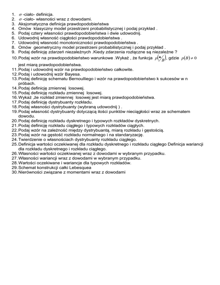 1. -ciało- definicja. 2. -ciało- własności wraz z dowodami. 3. Aksjomatyczna definicja prawdopodobieństwa 4. Omów klasyczny model przestrzeni probabilistycznej i podaj przykład . 5. Podaj cztery własności prawdopodobieństwa i dwie udowodnij. 6. Udowodnij własność ciągłości prawdopodobieństwa . 7. Udowodnij własność monotoniczności prawdopodobieństwa . 8. Omów geometryczny model przestrzeni probabilistycznej i podaj przykład . 9. Podaj definicję zdarzeń niezależnych .Kiedy zdarzenia rozłączne są niezależne ? 10. Podaj wzór na prawdopodobieństwo warunkowe .Wykaż , że funkcja p , gdzie pB 0 B jest miarą prawdopodobieństwa. 11. Podaj i udowodnij wzór na prawdopodobieństwo całkowite. 12. Podaj i udowodnij wzór Bayesa. 13. Podaj definicję schematu Bernoulliego i wzór na prawdopodobieństwo k sukcesów w n próbach. 14. Podaj definicję zmiennej losowej. 15. Podaj definicję rozkładu zmiennej losowej. 16. Wykaż ,że rozkład zmiennej losowej jest miarą prawdopodobieństwa. 17. Podaj definicję dystrybuanty rozkładu. 18. Podaj własności dystrybuanty (wybraną udowodnij ) . 19. Podaj własność dystrybuanty dotyczącą ilości punktów nieciągłości wraz ze schematem dowodu. 20. Podaj definicję rozkładu dyskretnego i typowych rozkładów dyskretnych. 21. Podaj definicję rozkładu ciągłego i typowych rozkładów ciągłych. 22. Podaj wzór na zależność między dystrybuantą, miarą rozkładu i gęstością. 23. Podaj wzór na gęstość rozkładu normalnego i na standaryzację. 24. Twierdzenie o własnościach dystrybuanty rozkładu ciągłego. 25. Definicja wartości oczekiwanej dla rozkładu dyskretnego i rozkładu ciągłego Definicja wariancji dla rozkładu dyskretnego i rozkładu ciągłego. 26. Własności wartości oczekiwanej wraz z dowodami w wybranym przypadku. 27. Własności wariancji wraz z dowodami w wybranym przypadku. 28. Wartości oczekiwane i wariancje dla typowych rozkładów. 29. Schemat konstrukcji całki Lebesquea 30. Nierówności związane z momentami wraz z dowodami