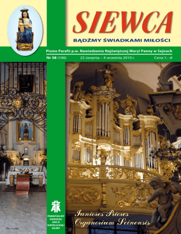 BĄDŹMY ŚWIADKAMI MIŁOŚCI Pismo Parafii p.w. Nawiedzenia Najświętszej Maryi Panny w Sejnach Nr 38 (106) Fot.: J. Lupo PARAFIALNY ODDZIAŁ AKCJI KATOLICKIEJ SEJNY 22 sierpnia – 4 września 2010 r. Cena 1,- zł MOC SŁOWA Niedziela XXI Zwykła – 22.08.2010 Łk 13,22–30 Niedziela XXII Zwykła – 29.08.2010 Łk 14,1.7-14 J G ezus nauczając, szedł przez miasta i wsie, i odbywał swą podróż do Jerozolimy. Raz ktoś Go zapytał: „Panie, czy tylko nieliczni będą zbawieni?”. On rzekł do nich: „Usiłujcie wejść przez ciasne drzwi; gdyż wielu, powiadam wam, będzie chciało wejść, a nie będą mogli. Skoro Pan domu wstanie i drzwi zamknie, wówczas stojąc na dworze, zaczniecie kołatać do drzwi i wołać: »Panie, otwórz nam«; lecz On wam odpowie: »Nie wiem, skąd jesteście«. Wtedy zaczniecie mówić: »Przecież jadaliśmy i piliśmy z Tobą, i na ulicach naszych nauczałeś«. Lecz On rzecze: »Powiadam wam, nie wiem, skąd jesteście. Odstąpcie ode Mnie wszyscy dopuszczający się niesprawiedliwości«. Tam będzie płacz i zgrzytanie zębów, gdy ujrzycie Abrahama, Izaaka i Jakuba, i wszystkich proroków w królestwie Bożym, a siebie samych precz wyrzuconych. Przyjdą ze wschodu i zachodu, z północy i południa i siądą za stołem w królestwie Bożym. Tak oto są ostatni, którzy będą pierwszymi, i są pierwsi, którzy będą ostatnimi”. Refleksja niedzielna: Co mamy robić, żeby wejść do nieba? Tak pyta wielu. Pytali o to Jezusa Jego uczniowie i przypadkowo napotkani ludzie. Zapewne też każdy z nas w cichości pyta naszego Pana: Czy tylko nieliczni będą zbawieni? Co mam więc robić, aby wejść do nieba? A Jezus nie zwleka z odpowiedzią. Mówi: Usiłujcie z wszystkich sit wejść przez ciasne drzwi. Ale czymże są owe ciasne drzwi? Jak wyglądają? Ciasne drzwi są niewygodne. To pewne! Droga do nieba nie jest wygodna. Miłość nie jest wygodna. Zwłaszcza wtedy, gdy się przeciw niej buntuję. Tego mam kochać? Tę mam kochać? Wtedy właśnie staję przed ciasnymi drzwiami. Buntuję się; coś buntuje się we mnie. W takich chwilach muszę siebie pytać: Czy to nie są właśnie owe ciasne drzwi, przez które powinienem starać się wejść z wszystkich sił? Czy w takich chwilach nie zaczyna się właśnie coś takiego jak niebo? Tak, wtedy się zaczyna! Akurat tam, gdzie miłość chce czegoś innego niż moje wygodne „ja”. To są owe ciasne drzwi. Pojawiają się nagle tam, gdzie wszyscy inni mi mówią: „Zostaw to! Szkoda czasu i atłasu! Wtedy ciasne drzwi troszeczkę się uchylają. Co wzbrania mi przez nie przejść? dy Jezus przyszedł do domu pewnego przywódcy faryzeuszów, aby w szabat spożyć posiłek, oni Go śledzili. I opowiedział zaproszonym przypowieść, gdy zauważył, jak sobie wybierali pierwsze miejsca. Tak mówił do nich: ”Jeśli cię kto zaprosi na ucztę, nie zajmuj pierwszego miejsca, by czasem ktoś znakomitszy od ciebie nie był zaproszony przez niego. Wówczas przyjdzie ten, kto was obu zaprosił, i powie ci: »Ustąp temu miejsca«; i musiałbyś ze wstydem zająć ostatnie miejsce. Lecz gdy będziesz zaproszony, idź i usiądź na ostatnim miejscu. Wtedy przyjdzie gospodarz i powie ci: »Przyjacielu, przesiądź się wyżej«; i spotka cię zaszczyt wobec wszystkich współbiesiadników. Każdy bowiem, kto się wywyższa, będzie poniżony, a kto się poniża, będzie wywyższony”. Do tego zaś, który Go zaprosił, rzekł: ”Gdy wydajesz obiad albo wieczerzę, nie zapraszaj swoich przyjaciół ani braci, ani krewnych, ani zamożnych sąsiadów, aby cię i oni nawzajem nie zaprosili, i miałbyś odpłatę. Lecz kiedy urządzasz przyjęcie, zaproś ubogich, ułomnych, chromych i niewidomych. A będziesz szczęśliwy, ponieważ nie mają czym tobie się odwdzięczyć; odpłatę bowiem otrzymasz przy zmartwychwstaniu sprawiedliwych”. Refleksja niedzielna: Słowa Jezusa, żeby nie gonić za najwyższymi miejscami, wywołują we mnie wspomnienia: Wspomnienie pierwsze: Pewna siostra zakonna, pracująca w Brazylii, powiedziała, że zdecydowała się nie pokazywać się w habicie. „Było mi bardzo przykro, gdy starsze ode mnie, niekiedy znacznie starsze, obładowane zakupami kobiety wstawały, żeby w autobusie zrobić mi miejsce”. Wspomnienie drugie: Wprawie pustym kościele przez nieuwagę usiadłam na miejscu, które było zarezerwowane dla lektora – zupełnie z przodu. Wtem usłyszałam syk lektora, pełniącego służbę głosiciela słowa Bożego: „To miejsce jest moje! Nie umie pani czytać?!” Wspomnienie trzecie: Layal jest dumna, że może pomagać przy rozdzielaniu Komunii Świętej. Już z daleka jednak rzuca się w oczy jej kalectwo: jest niska i nieco garbata, na każdej dłoni ma tylko trzy palce. Pewnego dnia pani, która uczestniczyła w Mszy Świętej, z oburzeniem zwróciła się do celebransa: „To jest bezczelność! Jest przecież wiele innych, któSIEWCA rzy mogliby rozdzielać Komunię Świętą! Czy akurat musi to robić ona?!” Jezus nie jest autorem żadnego podręcznika savoir–vivre’u, ale podał kilka zasad właściwego zachowania się, obowiązujących we wspólnotach chrześcijańskich. Powinniśmy zatem umieć się zachować, będąc zaproszonymi na Jego ucztę i w niej uczestnicząc. A co konkretnie mogłoby to oznaczać? Po pierwsze, ze służby Bożej nie robić występu. Po drugie, zaprosić tych, którzy właściwie nie wydają się zbyt „godni”. Po trzecie, cieszyć się zaproszeniem, a nie składać obowiązkowej wizyty, l czwarte, nie uważać się za lepszych od innych. Któż bowiem wie, kto na końcu będzie pierwszy? Santiago de Compostela Obecny Rok Jubileuszowy św. Jakuba jest 119, od momentu ustanowienia tej tradycji w XII wieku. 1 stycznia br. dostojnicy kościelni uroczyście otworzyli w hiszpańskim sanktuarium w Santiago de Compostela Święte Drzwi, tzw. Drzwi Przebaczenia. Święty Jakub bardzo dosłownie potraktował sł