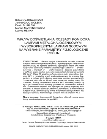 Katarzyna KOWALCZYK Janina GAJC-WOLSKA Dawid BUJALSKI Monika MARCINKOWSKA Lucyna HEMKA WPŁYW DOŚWIETLANIA ROZSADY POMIDORA LAMPAMI METALOHALOGENKOWYMI I WYSOKOPRĘŻNYMI LAMPAMI SODOWYMI NA WYBRANE PARAMETRY FIZJOLOGICZNE ROŚLIN STRESZCZENIE Badano wpływ doświetlania rozsady pomidora lampami metalohalogenkowymi (MH) i wysokoprężnymi lampami sodowymi (WLS) na wybrane parametry fizjologiczne roślin. Do badań wzięto dwie odmiany pomidora szklarniowego: Admiro F1 – średnioowocowa i Starbuck F1 – wielkoowocowa. Badania prowadzono w szklarni, gdzie średnia suma dobowej radiacji słonecznej wynosiła 305 J.cm-2. Przez 16 godzin na dobę połowę roślin doświetlano lampami MH, o rozkładzie emisji zoptymalizowanym do procesu fotosyntezy, a połowę WLS. Badano parametry wymiany gazowej roślin i zawartość chlorofilu w liściach oraz zawartość suchej masy liści pomidora. Rośliny doświetlane lampami WLS charakteryzowały się wyższymi wskaźnikami wymiany gazowej niż doświetlane lampami MH. Doświetlanie lampami MH wpłynęło na syntezę większej ilości chlorofilu w liściach odmiany Admiro w porównaniu z doświetlaniem lampami WLS. Istotnie więcej suchej masy miały liście pomidora, obu badanych odmian, doświetlanego lampami MH niż lampami WLS. Słowa kluczowe: intensywność fotosyntezy, chlorofil, sucha masa, lampy metalohalogenkowe, lampy WLS dr Katarzyna KOWALCZYK, dr hab. Janina GAJC-WOLSKA, prof. SGGW mgr inż. Dawid BUJALSKI, mgr inż. Monika MARCINKOWSKA e-mail: [email protected], [email protected] Katedra Roślin Warzywnych i Leczniczych Szkoła Główna Gospodarstwa Wiejskiego w Warszawie dr Lucyna HEMKA e-mail: [email protected] Zakład Techniki Świetlnej i Promieniowania Optycznego, Instytut Elektrotechniki PRACE INSTYTUTU ELEKTROTECHNIKI, zeszyt 256, 2012 312 K. Kowalczyk, J. Gajc-Wolska, D. Bujalski, M. Marcinkowska, L. Hemka 1. WSTĘP Uprawa roślin pod osłonami, dzięki nowoczesnym technologiom, jest możliwa przez cały rok. Problemem, jeszcze do końca nie rozwiązanym, jest zbyt niska intensywności napromienienia w okresie jesienno-zimowym. W ostatnich latach w wielu ośrodkach badawczo-naukowych prowadzone są prace nad udoskonalaniem doświetlania roślin. Dotyczą one badań nowych lub modernizowania używanych w ogrodnictwie sztucznych źródeł światła. Ważne zagadnienia, wymagające badań i rozwiązań, to większa sprawność, wydajność lamp oraz ich skład spektralny, co pozwoli efektywnie wpływać na rozwój roślin i zmniejszyć koszty doświetlanej uprawy. To zagadnienie szczególnie dotyczy roślin o wysokich wymaganiach świetlnych, uprawianych w okresach, gdy energii słonecznej mamy w Polsce mało. Wymagania świetlne pomidora są wysokie. Przy produkcji rozsady, pomidor do prawidłowego wzrostu potrzebuje natężenia oświetlenia około 4 tys. lx, a najlepiej rośnie i plonuje przy 14-16 tys. lx, co odpowiada natężeniu napromieniowania kwantowego dla światła typu dziennego około 252-288 µmol m-2 s-1 (PAR) według [1]. W okresie letnim, w godzinach południowych, rośliny otrzymują światło nawet o natężeniu 100 tys. lx. Odpowiada to natężeniu napromieniowania kwantowego z zakresu PAR wielkości 1800 µmol m-2 s-1 (PAR). Doświetlanie pomidora zaleca się głównie przy produkcji rozsad i w przypadku prowadzenia uprawy w miesiącach jesienno-zimowych. W pochmurne dni listopada, w wielu rejonach Polski, w południe, pada na rośliny światło o natężeniu nieprzekraczającym 1500 lx, w grudniu – 600 lx, w styczniu – 1100 lx; dopiero w lutym (w pierwszej połowie miesiąca) 3000-5000 lx [4]. Rano i po południu natężenie oświetlenia jest dużo niższe. W tym okresie doświetlanie pomidora jest więc konieczne. Trzeba je stosować łącznie z naturalnym dniem przez 16 godzin na dobę, ponieważ roślinom należy zapewnić w ciągu doby ośmiogodzinną przerwę [2]. W procesie fotosyntezy jest wykorzystywana jedynie mała część spektrum promieniowania elektromagnetycznego, o zakresie długości fali 400-700 nm, w ekofizjologii roślin nazywana promieniowaniem fotosyntetycznie czynnym (PAR). Na przebieg fotosyntezy ma wpływ natężenie promieniowania, czyli gęstość strumienia fotosyntetycznych fotonów (PPFD) oraz spektralny rozkład strumienia fotonów [1]. Światło (PPFD) jest najważniejszym czynnikiem produktywności pomidora pod osłonami [9]. Obniżenie PPFD i długości okresu oświetlenia, co dotyczy zmian sezonowych, wpływa na obniżenie plonu owoców pomidora. Wzrost i plonowanie warzyw pod osłonami może być zwiększone przez doświetlanie [3]. Wpływ doświetlania rozsady pomidora lampami metalohalogenkowymi … 313 Celem badań było sprawdzenie efektywności doświetlania rozsady pomidora zmodernizowanymi lampami MH w porównaniu do standardowych lamp WLS. 2. MATERIAŁ I METODYKA BADAŃ Badania przeprowadzono w Szklarniowym Ośrodku Doświadczalnym SGGW w Warszawie. Do badań wzięto dwie odmiany pomidora szklarniowego: Admiro F1 – średnioowocowa i Starbuck F1 – wielkoowocowa firmy nasiennej De Ruiter Seeds. Nasiona wysiano 5 listopada 2010 r., doświadczenie zakończono 27 grudnia 2010 r. Rozsadę produkowano w kostkach z wełny mineralnej. Pożywka do fertygacji roślin zawierała (mg dm-3): N-NO3– 210, P – 60, K – 340, Mg – 50, Ca – 200, Fe – 2, Mn – 0.6, B – 0.3, Cu – 0.15, Zn – 0.3, Mo – 0.05. W kamerze szklarniowej, w której rosły rośliny (od siewu do zakończenia doświadczenia), średnia dzienna temperatura po skiełkowaniu nasion wynosiła 22,1°C, a nocna 20,1°C, stężenie CO2 średnio 420 ppm, a średnie dobowe sumy radiacji 305 J cm-2 (rys. 1). Połowę roślin doświetlano przez 16 godzin na dobę lampami metalohalogenkowymi o natężeniu napromieniowania 221 μmol m-2 s-1, a połowę lampami sodowymi o natężeniu napromieniowania 250 μmol m-2 s-1. W każdej kombinacji doświetlano 50 sztuk roślin. Do badań wykorzystano wysokoprę