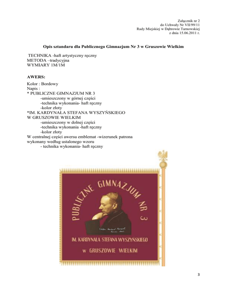 Załącznik nr 2 do Uchwały Nr VII/99/11 Rady Miejskiej w Dąbrowie Tarnowskiej z dnia 15.06.2011 r. Opis sztandaru dla Publicznego Gimnazjum r 3 w Gruszowie Wielkim TECHNIKA -haft artystyczny ręczny METODA –tradycyjna WYMIARY 1M/1M AWERS: Kolor : Bordowy Napis : * PUBLICZNE GIMNAZJUM NR 3 -umieszczony w górnej części -technika wykonania- haft ręczny -kolor złoty *IM. KARDYNAŁA STEFANA WYSZYŃSKIEGO W GRUSZOWIE WIELKIM -umieszczony w dolnej części -technika wykonania -haft ręczny -kolor złoty W centralnej części awersu emblemat -wizerunek patrona wykonany według ustalonego wzoru - technika wykonania- haft ręczny 3 REWERS: Kolor : czerwony Napis : * BÓG HONOR MĄDROŚĆ 2011 -umieszczony w dolnej części -technika wykonania- haft ręczny -kolor złoty W centralnej części rewersu emblemat - orzeł biały - wykonany według opisu zawartego w konstytucji RP - haft wypukły - kolor biały Wykończenia sztandaru : złote frędzle i szamerunki (taśmy) Drzewiec 4. Długość 2,55 m złożony z dwóch części, składany w środkowej. 5. Rodzaj drzewa - sosna. 6. Kolor –buk. 4