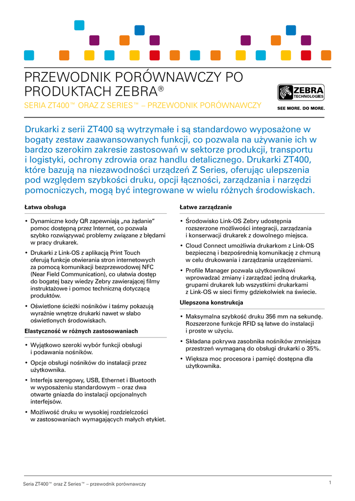 PRZEWODNIK PORÓWNAWCZY PO PRODUKTACH ZEBRA® SERIA ZT400™ ORAZ Z SERIES™ – PRZEWODNIK PORÓWNAWCZY Drukarki z serii ZT400 są wytrzymałe i są standardowo wyposażone w bogaty zestaw zaawansowanych funkcji, co pozwala na używanie ich w bardzo szerokim zakresie zastosowań w sektorze produkcji, transportu i logistyki, ochrony zdrowia oraz handlu detalicznego. Drukarki ZT400, które bazują na niezawodności urządzeń Z Series, oferując ulepszenia pod względem szybkości druku, opcji łączności, zarządzania i narzędzi pomocniczych, mogą być integrowane w wielu różnych środowiskach. Łatwa obsługa Łatwe zarządzanie • Dynamiczne kody QR zapewniają „na żądanie” pomoc dostępną przez Internet, co pozwala szybko rozwiązywać problemy związane z błędami w pracy drukarek. • Środowisko Link-OS Zebry udostępnia rozszerzone możliwości integracji, zarządzania i konserwacji drukarek z dowolnego miejsca. • Drukarki z Link-OS z aplikacją Print Touch oferują funkcje otwierania stron internetowych za pomocą komunikacji bezprzewodowej NFC (Near Field Communication), co ułatwia dostęp do bogatej bazy wiedzy Zebry zawierającej filmy instruktażowe i pomoc techniczną dotyczącą produktów. • Oświetlone ścieżki nośników i taśmy pokazują wyraźnie wnętrze drukarki nawet w słabo oświetlonych środowiskach. Elastyczność w różnych zastosowaniach • Wyjątkowo szeroki wybór funkcji obsługi i podawania nośników. • Opcje obsługi nośników do instalacji przez użytkownika. • Cloud Connect umożliwia drukarkom z Link-OS bezpieczną i bezpośrednią komunikację z chmurą w celu drukowania i zarządzania urządzeniami. • Profile Manager pozwala użytkownikowi wprowadzać zmiany i zarządzać jedną drukarką, grupami drukarek lub wszystkimi drukarkami z Link-OS w sieci firmy gdziekolwiek na świecie. Ulepszona konstrukcja • Maksymalna szybkość druku 356 mm na sekundę. Rozszerzone funkcje RFID są łatwe do instalacji i proste w użyciu. • Składana pokrywa zasobnika nośników zmniejsza przestrzeń wymaganą do obsługi drukarki o 35%. • Większa moc procesora i pamięć dostępna dla użytkownika. • Interfejs szeregowy, USB, Ethernet i Bluetooth w wyposażeniu standardowym – oraz dwa otwarte gniazda do instalacji opcjonalnych interfejsów. • Możliwość druku w wysokiej rozdzielczości w zastosowaniach wymagających małych etykiet. Seria ZT400™ oraz Z Series™ – przewodnik porównawczy 1 SERIA ZT400™ ORAZ Z SERIES™ – PRZEWODNIK PORÓWNAWCZY ZT410™ MAKS. SZYBKOŚĆ DRUKU ZM400™ 203 dpi 356 mm/s 203 dpi 254 mm/s 300 dpi 254 mm/s 300 dpi 203 mm/s 600 dpi 102 mm/s 600 dpi 102 mm/s MAKS. SZEROKOŚĆ DRUKU 104 mm INTERFEJSY STANDARDOWE Ethernet, szeregowy, USB 2.0, Bluetooth 2.1, USB Host, dwa otwarte gniazda na interfejsy USB 2.0, szeregowy i równoległy INTERFEJSY OPCJONALNE Równoległy, bezprzewodowy 802.11 a/b/g/n Ethernet, bezprzewodowy 802.11 b/g STANDARDOWA PAMIĘĆ RAM RAM 256 MB (4 MB dla użytkownika) SDRAM 16 MB STANDARDOWA PAMIĘĆ FLASH Flash 512 MB (64 MB dla użytkownika) Flash 8 MB (2 MB dla użytkownika) PAMIĘĆ OPCJONALNA nie dot. Flash 64 MB (58 MB dla użytkownika) PROCESOR 32-bitowy, 400 MHz 32-bitowy INTERFEJS UŻYTKOWNIKA Podświetlany, kilkuwierszowy wyświetlacz graficzny LCD Podświetlany, kilkuwierszowy wyświetlacz graficzny LCD OBSŁUGA LINK-OS® Tak Nie KONFIGURACJA I KONSERWACJA PRZEZ UŻYTKOWNIKA Print Touch Dynamiczne kody QR Brak JAKOŚĆ DRUKU Głowica cienkowarstwowa z systemem E3™ (Element Energy Equalizer™) Głowica cienkowarstwowa z systemem E3™ (Element Energy Equalizer™) ZT420™ ZM600™ MAKS. SZYBKOŚĆ DRUKU 104 mm ® 203 dpi 305 mm/s 203 dpi 254 mm/s 300 dpi 254 mm/s 300 dpi 203 mm/s MAKS. SZEROKOŚĆ DRUKU 168 mm 168 mm INTERFEJSY STANDARDOWE Ethernet, szeregowy, USB 2.0, Bluetooth 2.1, USB Host, dwa otwarte gniazda na interfejsy USB 2.0, szeregowy i równoległy INTERFEJSY OPCJONALNE Równoległy, bezprzewodowy 802.11 a/b/g/n Ethernet, bezprzewodowy 802.11 b/g STANDARDOWA PAMIĘĆ RAM RAM 256 MB (4 MB dla użytkownika) SDRAM 16 MB STANDARDOWA PAMIĘĆ FLASH Flash 512 MB (64 MB dla użytkownika) Flash 8 MB (2 MB dla użytkownika) PAMIĘĆ OPCJONALNA nie dot. Flash 64 MB (58 MB dla użytkownika) PROCESOR 32-bitowy, 400 MHz 32-bitowy INTERFEJS UŻYTKOWNIKA Podświetlany, kilkuwierszowy wyświetlacz graficzny LCD Podświetlany, kilkuwierszowy wyświetlacz graficzny LCD OBSŁUGA LINK-OS® Tak Nie KONFIGURACJA I KONSERWACJA PRZEZ UŻYTKOWNIKA Print Touch Dynamiczne kody QR Brak JAKOŚĆ DRUKU Głowica cienkowarstwowa z systemem E3™ (Element Energy Equalizer™) Głowica cienkowarstwowa z systemem E3™ (Element Energy Equalizer™) ® Regionalne biuro handlowe dla Europy Środkowo-Wschodniej ul. Annopol 4a, 03-236 Warszawa, Polska Telefon: +48 22 38 01 900 Faks: +48 22 38 01 901 E-mail: [email protected] Internet: www.zebra.com Inne placówki w regionie EMEA Centrala EMEA: Wielka Brytania Europa: Francja, Hiszpania, Holandia, Niemcy, Rosja, Szwecja, Turcja, Włochy Bliski Wschód i Afryka: Dubaj, RPA ©2014 ZIH Corp. Wszystkie nazwy i numery produktów są znakami handlowymi Zebra, a Zebra i obraz głowy Zebry są zarejestrowanymi znakami handlowymi firmy ZIH Corp. Wszelkie prawa zastrzeżone. Wszystkie pozostałe znaki handlowe należą do odpowiednich właścicieli. Nie wyrzucaj – oddaj na makulaturę! (4/14)