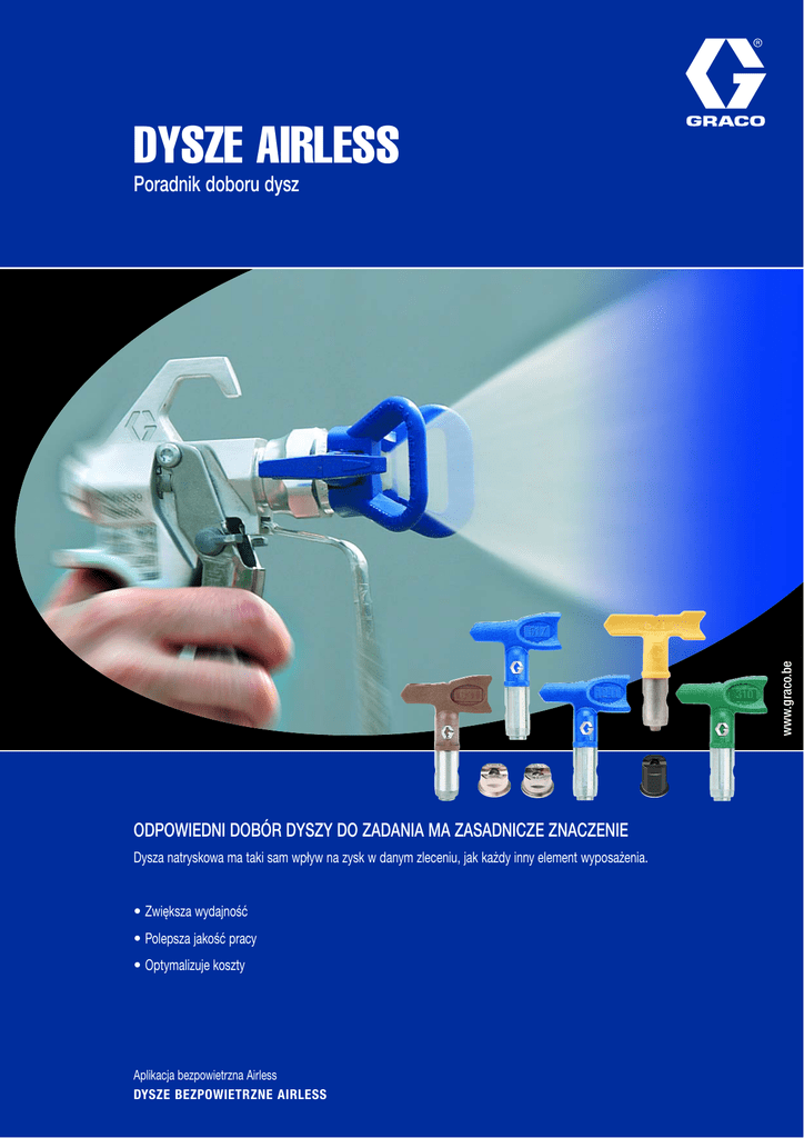 DYSZE AIRLESS www.graco.be Poradnik doboru dysz ODPOWIEDNI DOBÓR DYSZY DO ZADANIA MA ZASADNICZE ZNACZENIE Dysza natryskowa ma taki sam wpływ na zysk w danym zleceniu, jak każdy inny element wyposażenia. • Zwiększa wydajność • Polepsza jakość pracy • Optymalizuje koszty Aplikacja bezpowietrzna Airless DYSZE BEZPOWIETRZNE AIRLESS JAK DZIAŁAJĄ DYSZE? • Urządzenie do aplikacji hydrodynamicznej pompuje i spręża farbę bez użycia powietrza. Pompa utrzymuje: • przepływ farby • ciśnienie farby • Następnie farba jest przetłaczana przez niewielki otwór dyszy pod wysokim ciśnieniem (do 350 bar). • Proces ten rozpyla farbę w strumień o kontrolowanej szerokości i prędkości przepływu (podobnie, jak po przyłożeniu palca do końcówki węża ogrodowego). Dysza określa: • kąt natryskiwania • ilość natryskiwanej farby Rozmiar dyszy informuje pompę, z jaką wydajnoscią musi pracować, aby utrzymać żądane ciśnienie. DLACZEGO JEST TAK WIELE RÓŻNYCH DYSZ I ROZMIARÓW? Wybór dyszy można porównać do wyboru właściwego wiertła do wiertarki elektrycznej. Są wiertła do drewna, do metalu i do betonu. Każde wiertło do danego rodzaju materiału występuje w różnych rozmiarach. Użycie niewłaściwego wiertła do danej powierzchni źle się skończy. W przypadku dysz bezpowietrznych jest bardzo podobnie. WYBÓR ODPOWIEDNIEJ DYSZY • • • • • zmniejsza straty podczas aplikacji zapewnia lepszą kontrolę skraca czas wykonania zadania zmniejsza zużycie farby zwiększa zysk JAK WYBRAĆ WŁAŚCIWĄ DYSZĘ? Optymalne wykorzystanie dyszy natryskowej zależy od kilku czynników: • SZEROKOŚCI STRUMIENIA DYSZY • WIELKOŚCI OTWORU DYSZY • MAKSYMALNEJ WYDAJNOŚCI POMPY • TYPU NATRYSKIWANEJ FARBY • RODZAJU MALOWANEJ POWIERZCHNI • ZUŻYCIA DYSZY SZEROKOŚĆ STRUMIENIA dyszy jest określona przez kąt natryskiwania w odległości 30 cm od powierzchni. Kąt jest podawany za pomocą jednej wartości: • w tym przypadku cyfra 5 odpowiada kątowi 50°. Aby uzyskać szerokość strumienia, należy pomnożyć wartość kąta przez 5: • 5 x 5 = 25 cm szerokości strumienia. SZEROKIE DYSZE – WIDE RAC® Im szerszy jest strumień dyszy, tym szybciej można pomalować powierzchnię. Szerszy natrysk znacznie poprawia wydajność. 30 s z WA Jednak szerszy natrysk trudniej jest kontrolować, a dysze do szerokiego natrysku nie występują we wszystkich rozmiarach. Graco posiada wyjątkową serię dysz RAC X™, WAxxxx, specjalnie przystosowanych, aby zapewnić doskonały rezultat przy szerokim kącie, pomagając oszczędzić czas. 3 przejścia 1 min. 6 przejść z dyszą standardową WIELKOŚĆ OTWORU określa ilość farby, która wypływa przez dyszę. Wielkość otworu opisana jest przez dwie ostatnie cyfry: • w tym przypadku 17 odpowiada otworowi wielkości 0,017 cala, czyli 0,43 mm. Rzeczywista prędkość przepływu zależy od ciśnienia natryskiwania i używanej farby: wyższe ciśnienie oznacza większy przepływ; cięższe farby oznaczają mniejszy przepływ. KAŻDA POMPA MA OKREŚLONĄ MAKSYMALNĄ WYDAJNOŚĆ. Ważne jest, aby nigdy nie przekroczyć maksymalnej wielkości dyszy natryskowej, obsługiwanej przez urządzenie. Przykład: jeśli wymagany jest przepływ 4,4 l/min., najmniejszą zalecaną pompą będzie Ultra®Max II 1095. cale mm l/min 0.007 0.009 0.011 0.18 0.23 0.28 0.2 0.3 0.5 SERIA MODEL ST MAX™ 395 495 595 695 795 1095 V ST MAX™ II ULTRA®MAX II MARK X GMAX™ EH GH GH GH ROOFING 0.013 0.015 0.017 0.3302 0.38 0.43 0.7 0.9 1.2 0.019 0.48 1.5 0.021 0.023 0.025 0.027 0.029 0.031 0.033 0.035 0.037 0.039 0.041 0.043 0.045 0.047 0.53 0.58 0.64 0.69 0.74 0.79 0.84 0.89 0.94 0.99 1.04 1.09 1.14 1.19 1.8 2.2 2.5 3.0 3.4 3.9 4.4 5 5.6 6.2 6.8 7.5 8.2 9 farba szpachla farba szpachla 3900 5900 HD 7900 200 200 230 300 833 5030 3640 2560 2075 1015 Precyzyjne prace wykończeniowe Profesjonalne prace budowlane Do zastosowań specjalnych RODZAJ FARBY i MALOWANEJ POWIERZCHNI określa rodzaj używanej dyszy. Poniższa tabela podaje zalecane dysze i wielkości dla różnych zastosowań i materiałów. KOŃCÓWKI DO WYKAŃCZANIA RAC X™ FFAxxx Płaska srebrna 163xxx Typowe zastosowania Materiały Meblarstwo, obróbka drewna, metalu i precyzyjne prace wykończeniowe Pigmenty Tusz Bejce Lakiery Oleje Emalie Uretany Materiały wykończeniowe 008 - 010 010 - 012 012 - 014 012 - 014 012 - 014 012 - 014 012 - 014 008 - 014 Lateks Akryle Wielokolorowe Emulsje Szpachle blokowe Silikon 015 - 019 015 - 019 023 - 025 017 - 021 023 - 025 021 - 025 Hydroizolatory Zabezpieczenia ognioochronne Szpachle Elastomery Mastyki Materiały epoksydowe Inne gęste materiały Asfalt Silikat/mineralne Kleje kontaktowe 027 - 031 Parkingi, drogi, posadzki magazynowe, skrzyżowania i obiekty sportowe. Bezpowietrzne malowanie pasów 013 - 055 Idealne do zmniejszania strat podczas natryskiwania. Ostre krawędzie linii. Równomierne nakładanie farby na całej linii. Farby zewnętrzne 015 - 021 Płaska czarna 163xxx Zalecane rozmiary dysz Odpowiednie osłony RAC X™ 246215 Dysza płaska 220251 Dysza płaska 220247 PROFESJONALNE KOŃCÓWKI BEZPOWIETRZNE RAC X™ PAAxxx Płaska budowlana 269xxx Obiekty mieszkaniowe, handlowe lub przemysłowe. Do wewnątrz i na zewnątrz. Płaska srebrna 163xxx RAC X™ 246215 Dysza płaska 220251 Dysza płaska 220251 KOŃCÓWKI DO TRYDNYCH PRAC RAC X™ HDAxxx WAxxxx Płaska srebrna 163xxx Wysoka wydajność, duże powierzchnie. Obiekty mieszkaniowe, handlowe lub przemysłowe. Do wewnątrz, a także na zewnątrz do zastosowania bezpowietrznego. RAC X™ 246215 029 - 035 029 - 041 027 - 033 041 - 047 043 - 061 047 - 053 031 - 071 027 - 033 - Dysza płaska 220251 KOŃCÓWKI DO BEZPOWIETRZNEGO MALOWANIA PASÓW RAC® 5 LineLazer LL5xxx RAC® 5 243161 108 208 308 FFA-XXX 110 112 210 212 310 312 410 412 510 512 612 214 314 414 514 614 217 317 417 517 617 219 319 419 519 619 NOWA ZUŻYTA 1 cyfra X5 Pora na = szerokość wymianę! strumienia* Ma