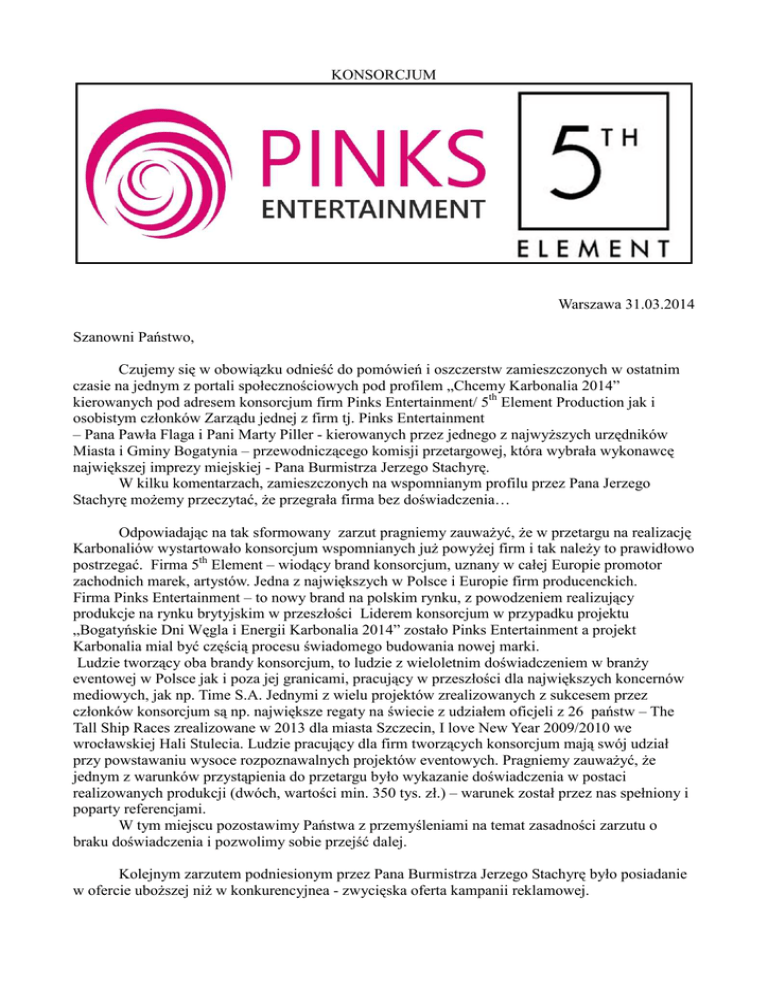 KONSORCJUM Warszawa 31.03.2014 Szanowni Państwo, Czujemy się w obowiązku odnieść do pomówień i oszczerstw zamieszczonych w ostatnim czasie na jednym z portali społecznościowych pod profilem „Chcemy Karbonalia 2014” kierowanych pod adresem konsorcjum firm Pinks Entertainment/ 5th Element Production jak i osobistym członków Zarządu jednej z firm tj. Pinks Entertainment – Pana Pawła Flaga i Pani Marty Piller - kierowanych przez jednego z najwyŜszych urzędników Miasta i Gminy Bogatynia – przewodniczącego komisji przetargowej, która wybrała wykonawcę największej imprezy miejskiej - Pana Burmistrza Jerzego Stachyrę. W kilku komentarzach, zamieszczonych na wspomnianym profilu przez Pana Jerzego Stachyrę moŜemy przeczytać, Ŝe przegrała firma bez doświadczenia… Odpowiadając na tak sformowany zarzut pragniemy zauwaŜyć, Ŝe w przetargu na realizację Karbonaliów wystartowało konsorcjum wspomnianych juŜ powyŜej firm i tak naleŜy to prawidłowo postrzegać. Firma 5th Element – wiodący brand konsorcjum, uznany w całej Europie promotor zachodnich marek, artystów. Jedna z największych w Polsce i Europie firm producenckich. Firma Pinks Entertainment – to nowy brand na polskim rynku, z powodzeniem realizujący produkcje na rynku brytyjskim w przeszłości Liderem konsorcjum w przypadku projektu „Bogatyńskie Dni Węgla i Energii Karbonalia 2014” zostało Pinks Entertainment a projekt Karbonalia mial być częścią procesu świadomego budowania nowej marki. Ludzie tworzący oba brandy konsorcjum, to ludzie z wieloletnim doświadczeniem w branŜy eventowej w Polsce jak i poza jej granicami, pracujący w przeszłości dla największych koncernów mediowych, jak np. Time S.A. Jednymi z wielu projektów zrealizowanych z sukcesem przez członków konsorcjum są np. największe regaty na świecie z udziałem oficjeli z 26 państw – The Tall Ship Races zrealizowane w 2013 dla miasta Szczecin, I love New Year 2009/2010 we wrocławskiej Hali Stulecia. Ludzie pracujący dla firm tworzących konsorcjum mają swój udział przy powstawaniu wysoce rozpoznawalnych projektów eventowych. Pragniemy zauwaŜyć, Ŝe jednym z warunków przystąpienia do przetargu było wykazanie doświadczenia w postaci realizowanych produkcji (dwóch, wartości min. 350 tys. zł.) – warunek został przez nas spełniony i poparty referencjami. W tym miejscu pozostawimy Państwa z przemyśleniami na temat zasadności zarzutu o braku doświadczenia i pozwolimy sobie przejść dalej. Kolejnym zarzutem podniesionym przez Pana Burmistrza Jerzego Stachyrę było posiadanie w ofercie uboŜszej niŜ w konkurencyjnea - zwycięska oferta kampanii reklamowej. KONSORCJUM W przedstawionej przez konsorcjum ofercie, korzystając z wieloletnich doświadczeń w największych polskich koncernach mediowych zaproponowaliśmy udział na szeroką skalę kilku telewizji o zasięgu ogólnopolskim. Mamy tutaj na myśli: Telewizję TVN oraz Telewizję Polską. Nie bez znaczenia pozostawał fakt szerokiej promocji wydarzenia w mediach lokalnych w tym przez kanał telewizyjny TV Vectra o zasięgu ogólnopolskim, dostępny równieŜ w Bogatyni. Kierując się zasadą elastyczności oferty i dopasowania jej w sposób jak najbardziej adekwatny do potrzeb Klienta – Gminy i Miasta Bogatynia - to właśnie Władzom Miasta Bogatynia pozostawiliśmy ostateczny wybór wiodącej telewizji jak i zakresu i formy świadczeń. Podobnie sprawa miała się z wyborem wiodącej rozgłośni radiowej. W naszej ofercie zaproponowaliśmy Klientowi świadczenia do indywidualnego ustalenia ze strony największych rozgłośni radiowych w Polsce tj. RMF MAXX, Radio ZET, Radio ESKA. Po raz pierwszy w historii imprezy Karbonalia miały szansę być wiodącą imprezą promowaną przez jeden z największych portali internetowych na polskim rynku – Wirtualna Polska. TakŜe w tym miejscu pozostawiliśmy moŜliwość współtworzenia szczegółów kampanii wraz z władzami Miasta i Gminy w sposób najbardziej adekwatny. Pozostałymi portalami były Eska.pl oraz portal społecznościowy Facebook. Mając na uwadze środowisko naturalne zaproponowaliśmy ponadto zastąpienie tradycyjnej formy plakatu - nowoczesną formą Outdoor opierającą się o telebimy w aŜ sześciu głównych lokalizacjach Dolnego Śląska – Bogatyni, Zgorzelcu, Lubaniu Śląskim, Bolesławcu, Jeleniej Górze i Wrocławiu. Ta forma kampanii oprócz niebywałych zalet proekologicznych ma jeszcze jedną niewątpliwą zaletę – zasięg. Przez minimum 14 dni zaproponowanej kampanii na telebimach reklamę imprezy miało szansę zobaczyć blisko 4 mln osób. Ostatnim wymiernym świadczeniem reklamowym zaproponowanym w naszej ofercie były dwustronne, kolorowe ulotki z programem imprezy kolportowane na terenie miasta Bogatynia, powiatu zgorzeleckiego i powiatów ościennych. Naszym celem było jedynie pokazanie miasta z dobrej strony i realna promocja jego na zewnątrz w skali ogólnopolskiej. Nie ujętym w oferie świadczeniem będącym opcją po podpisaniu ewentualnego kontraktu była moŜliwość wykorzystania posiadanego przez nas jednego z najnowocześniejszych wozów transmisyjnych na polskim rynku i produkcja na potrzeby dokumentacji wydarzenia. Pozostawiamy Państwa i w tym miejscu z przemyśleniami, czy oby świadczenia reklamowe zaproponowane w ofercie, jak teŜ ich skala była uboŜsza niŜ oferta firmy, która zdobyła kontrakt na realizację imprezy. My osobiście czekamy, czy świadczenia reklamowe zaproponowane przez firmę Pianoforte - będą jakkolwiek mocniejsze, tak jak twierdził w swoich pomówieniach Pan Jerzy Stachyra? Kolejnym z serii zarzutów jest zaoferowanie przez konsorcjum mniejszej ilości atrakcji w stosunku do oferty zwycięskiej. Pragniemy zauwaŜyć, Ŝe w ramach oferty, oprócz koncertów 12 gwiazd o ugruntowanej KONSORCJUM pozycji, 7 innych artystów oraz wybitnego prowadzącego w osobie Krzysztofa Jankowskiego „Jankesss” (Radi