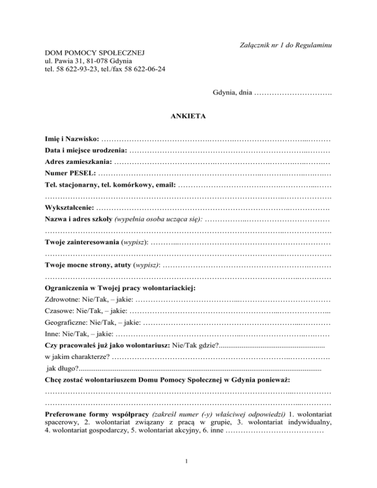 Załącznik nr 1 do Regulaminu DOM POMOCY SPOŁECZNEJ ul. Pawia 31, 81-078 Gdynia tel. 58 622-93-23, tel./fax 58 622-06-24 Gdynia, dnia …………………………. ANKIETA Imię i Nazwisko: …………………………………….……….………………………...……… Data i miejsce urodzenia: ……………………………………………………………..……… Adres zamieszkania: ………………………………….………………….……….…..…….… Numer PESEL: ………………………………………………………..……….……..….….… Tel. stacjonarny, tel. komórkowy, email: …………………………….…….…………...…… …………………………………………………………………………………..………………. Wykształcenie: …………………………………………………………………..……………. Nazwa i adres szkoły (wypełnia osoba ucząca się): ……………..…………………………… …………………………………………………………………………………..………………. Twoje zainteresowania (wypisz): ………...…………………………………………………… …………………………………………………………………………………..………………. Twoje mocne strony, atuty (wypisz): ………………………………………………….……… ………………………………………………………………………………………..…….…… Ograniczenia w Twojej pracy wolontariackiej: Zdrowotne: Nie/Tak, – jakie: …………………………………...……………………………… Czasowe: Nie/Tak, – jakie: …………………………………………………...………………... Geograficzne: Nie/Tak, – jakie: ……………………………………………………...………… Inne: Nie/Tak, – jakie: …………………………………………..……………………..….…… Czy pracowałeś już jako wolontariusz: Nie/Tak gdzie?........................................................ w jakim charakterze? ……………………………………………………………..……………. jak długo?................................................................................................................................ Chcę zostać wolontariuszem Domu Pomocy Społecznej w Gdynia ponieważ: ……………………………………………………………………………………...…………… ………………………………………………………………………………………...………… Preferowane formy współpracy (zakreśl numer (-y) właściwej odpowiedzi) 1. wolontariat spacerowy, 2. wolontariat związany z pracą w grupie, 3. wolontariat indywidualny, 4. wolontariat gospodarczy, 5. wolontariat akcyjny, 6. inne ………………………………… 1 Załącznik nr 2 do Regulaminu DOM POMOCY SPOŁECZNEJ ul. Pawia 31, 81-078 Gdynia tel. 58 622-93-23, tel./fax 58 622-06-24 Gdynia, dnia …………………………. POROZUMIENIE O WYKONYWANIU ŚWIADCZEŃ WOLONTARYSTYCZNYCH NR …………… Zawarte w dniu …..…………. w Gdyni pomiędzy Domem Pomocy Społecznej w Gdyni, reprezentowanym przez Dyrektora Panią Liliannę Szewczuk-Putrym, zwaną dalej Korzystającym, Panią/Panem ………………….....……………………………………………………………… legitymującą/cym się dowodem osobistym seria …………………………………………. PESEL ………………………………….. zamieszkałą/łym w ………………………………….. …………………………………………………………………………………………………... Zwaną/nym dalej Wolontariuszem. Korzystający oświadcza, że jest podmiotem na rzecz, którego zgodnie z art. 42 ust. 1 Ustawy z dnia 23 kwietnia 2003 r o działalności pożytku publicznego i o wolontariacie ( Dz. U. nr 96, poz. 873) mogą być wykonywane świadczenia przez wolontariuszy. Mając na względzie ideę wolontariatu, u podstaw której stoi dobrowolne i bezpłatne wykonywanie świadczeń, a i uzupełniający charakter także biorąc wykonywanych pod uwagę przez charytatywny, pomocniczy wolontariuszy świadczeń strony porozumienia uzgadniają co następuje: §1 1. Korzystający powierza wykonywanie Wolontariuszowi a Wolontariusz dobrowolnie podejmuje się wykonania na rzecz Korzystającego następujących świadczeń: ………………………………………………………………………………………..……… ………………………………………………………………………………………..……… ………………………………………………………………………………………..……… ………………………………………………………………………………………..……… 2 2. Przedstawicielem Korzystającego, upoważniony do przekazywania Wolontariuszowi i odbioru świadczeń objętych porozumieniem, a także nadzorowania ich wykonania jest Koordynator do spraw wolontariatu. 3. Wolontariusz oświadcza, że posiada kwalifikacje i spełnia wymagania odpowiednie do rodzaju i zakresu przyjętych zadań. §2 1. Strony porozumienia uzgadniają, że świadczenia określone w § 1 będą wykonywane w okresie od dnia ………………….. na czas określony do ……………..…………...…… 2. Miejscem wykonywania świadczeń będzie siedziba Korzystającego przy ulicy Pawiej 31, 81-078 Gdynia. §3 Z uwagi na charakter i ideę wolontariatu: 1. Wolontariusz jest zobowiązany wykonywać uzgodnione świadczenia osobiście i z należytą starannością. 2. Wolontariusz za swoje świadczenia nie otrzyma wynagrodzenia. 3. W związku z wykonywaniem fotografii mieszkańcom Domu Pomo
