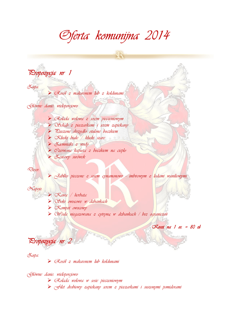 Oferta komunijna 2014 Propozycja nr 1 Zupa: Rosół z makaronem lub z kołdunami Główne danie: wieloporcjowo Deser: Rolada wołowa z sosem pieczeniowym Schab z pieczarkami i serem zapiekany Pieczone skrzydło otulone boczkiem Kluski białe / kluski szare Ziemniaki z wody Czerwona kapusta z boczkiem na ciepło Zestawy surówek Jabłko pieczone z sosem cynamonowo - imbirowym z lodami waniliowymi Napoje: Kawa / herbata Soki owocowe w dzbankach Kompot owocowy Woda niegazowana z cytryną w dzbankach – bez ograniczeń Koszt na 1 os. = 80 zł Propozycja nr 2 Zupa: Rosół z makaronem lub kołdunami Główne danie: wieloporcjowo Rolada wołowa w sosie pieczeniowym Filet drobiowy zapiekany serem z pieczarkami i suszonymi pomidorami Deser: Napoje: Schab panierowany Kluski białe/ kluski szare Ziemniaki z wody Kapusta biała zasmażana Zestaw surówek Puchar lodów waniliowych na prażonych jabłkach Kawa / herbata Soki owocowe w dzbankach Kompot owocowy Woda niegazowana z cytryną w dzbankach – bez ograniczeń Koszt na 1 os. = 85 zł Propozycja nr 3 Zupa: Rosół z makaronem lub kołdunami Główne danie: wieloporcjowo Rolada wołowa w sosie pieczeniowym Pieczone skrzydło z indyka otulone boczkiem Kotlet de volaille Polędwiczki wieprzowe z sosem borowikowym Kluski białe/ kluski szare Ziemniaki z wody Sałatka z buraczków Zestaw surówek Deser: Puchar lodowy z bitą śmietaną i owocami Napoje: Kawa / herbata Soki owocowe w dzbankach Kompot owocowy Woda niegazowana z cytryną w dzbankach – bez ograniczeń Koszt na 1 os. = 90 zł Propozycja nr 4 Zupa: Rosół z makaronem lub z kołdunami Główne danie: wieloporcjowo Deser: Rolada wołowa z sosem pieczeniowym Schab z pieczarkami i serem zapiekany Pieczone skrzydło otulone boczkiem Kluski białe / kluski szare Ziemniaki z wody Czerwona kapusta z boczkiem na ciepło Zestawy surówek Jabłko pieczone z sosem cynamonowo - imbirowym z lodami waniliowymi Napoje i owoce: Kawa / herbata Soki owocowe w dzbankach – 0,5l/os. Woda niegazowana z cytryną w dzbankach – bez ograniczeń Owoce sezonowe Zimna płyta: Półmiski mięs pieczonych o Schab pieczony ze śliwką/ z morelą o Schab nadziewany kiełbasą o Polędwiczki wieprzowe na ostro o Pierś z kurczaka faszerowana szpinakiem o Karkówka pieczona Dechy serów z bakaliami Pasztety swojskie Tymbaliki drobiowe Jaja faszerowane trzema pastami Trio śledziowe o Śledzie w śmietanie z jabłkiem o Śledzie w oleju marynowane z cebulką o Śledzie po mazursku Sałatka ryżowa z kurczakiem Sałatka Akropol (z serem feta) Pieczywo Koszt na 1 os. = 135 zł Propozycja nr 5 Zupa: Rosół z makaronem lub kołdunami Główne danie: wieloporcjowo Rolada wołowa w sosie pieczeniowym Filet drobiowy zapiekany serem z pieczarkami i suszonymi pomidorami Schab panierowany Kluski białe/ kluski szare Ziemniaki z wody Kapusta biała zasmażana Zestaw surówek Deser: Puchar lodów waniliowych na prażonych jabłkach Napoje i owoce: Kawa / herbata Soki owocowe w dzbankach – 0,5l/os. Woda niegazowana z cytryną w dzbankach – bez ograniczeń Owoce sezonowe Zimna płyta: Półmiski mięs pieczonych o Schab pieczony ze śliwką/ z morelą o Schab nadziewany kiełbasą o Polędwiczki wieprzowe na ostro o Pierś z kurczaka faszerowana szpinakiem o Karkówka pieczona Dechy serów z bakaliami Pasztety swojskie Tymbaliki drobiowe Jaja faszerowane trzema pastami Trio śledziowe o Śledzie w śmietanie z jabłkiem o Śledzie w oleju marynowane z cebulką o Śledzie po mazursku Sałatka ryżowa z kurczakiem Sałatka Akropol (z serem feta) Pieczywo Koszt na 1 os. = 130 zł Propozycja nr 6 Zupa: Rosół z makaronem lub kołdunami Główne danie: wieloporcjowo Rolada wołowa w sosie pieczeniowym Pieczone skrzydło z indyka otulone boczkiem Kotlet de volaille Polędwiczki wieprzowe z sosem borowikowym Kluski białe/ kluski szare Ziemniaki z wody Sałatka z buraczków Zestaw surówek Deser: Puchar lodowy z bitą śmietaną i owocami Napoje i owoce: Kawa / herbata Soki owocowe w dzbankach 0,5l/os. Woda niegazowana z cytryną w dzbankach – bez ograniczeń Owoce sezonowe Zimna płyta: Półmiski mięs pieczonych o Schab pieczony ze śliwką/ z morelą o Schab nadziewany kiełbasą o Polędwiczki wieprzowe na ostro o Pierś z kurczaka faszerowana szpinakiem o Karkówka pieczona Dechy serów z bakaliami Pasztety swojskie Tymbaliki drobiowe Jaja faszerowane trzema pastami Trio śledziowe o Śledzie w śmietanie z jabłkiem o Śledzie w oleju marynowane z cebulką o Śledzie po mazursku Sałatka ryżowa z kurczakiem Sałatka Akropol (z serem feta) Pieczywo Koszt na 1 os. = 145 zł Propozycja nr 7 Zupa: Rosół z makaronem lub z kołdunami Główne danie: wieloporcjowo Rolada wołowa z sosem pieczeniowym Schab z pieczarkami i serem zapiekany Pieczone skrzydło otulone boczkiem Kluski białe / kluski szare Ziemniaki z wody Czerwona kapusta z boczkiem na ciepło Zestawy surówek Deser: Jabłko pieczone z sosem cynamonowo - imbirowym z lodami waniliowymi Napoje i owoce: Kawa / herbata Soki owocowe w dzbankach – 0,5l/os. Woda niegazowana z cytryną w dzbankach – bez ograniczeń Owoce sezonowe Zimna płyta: Półmiski mięs pieczonych o Schab pieczony ze śliwką/ z morelą o Schab nadziewany kiełbasą o Polędwiczki wieprzowe na ostro o Pierś z kurczaka faszerowana szpinakiem o Karkówka pieczona Dechy serów z bakaliami Pasztety swojskie Tymbaliki drobiowe Jaja faszerowane trzema pastami Trio śledziowe o Śledzie w śmietanie z jabłkiem o Śledzie w oleju marynowane z cebulką o Śledzie po mazursku Sałatka ryżowa z kurczakiem Sałatka Akropol (z serem feta) Pieczywo Kolacja: Barszcz czerwony z uszkami Koszt na 1 os. = 145 zł Propozycja nr 8 Zupa: Rosół z makaronem lub kołdunami Główne danie: wieloporcjowo Rolada wołowa w sosie pieczeniowym Filet drobiowy zapiekany serem z pieczarkami i suszonymi pomidorami Schab panierowany Kluski białe/ kluski szare Ziemniaki z wody Kapusta biała zasmażana Zestaw surówek Deser: