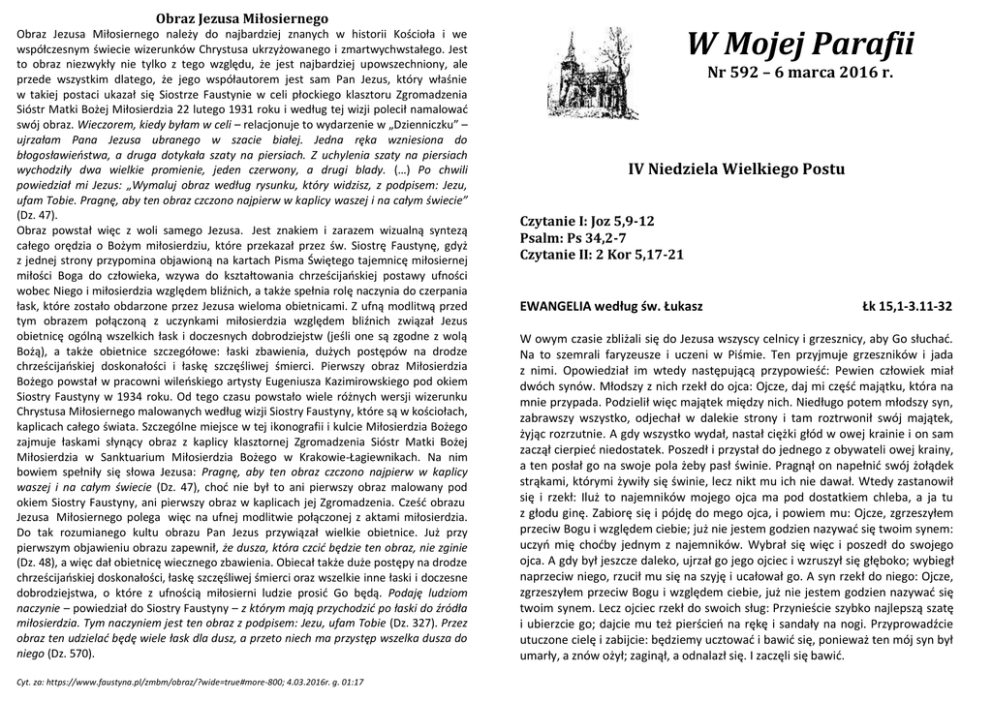 Obraz Jezusa Miłosiernego Obraz Jezusa Miłosiernego należy do najbardziej znanych w historii Kościoła i we współczesnym świecie wizerunków Chrystusa ukrzyżowanego i zmartwychwstałego. Jest to obraz niezwykły nie tylko z tego względu, że jest najbardziej upowszechniony, ale przede wszystkim dlatego, że jego współautorem jest sam Pan Jezus, który właśnie w takiej postaci ukazał się Siostrze Faustynie w celi płockiego klasztoru Zgromadzenia Sióstr Matki Bożej Miłosierdzia 22 lutego 1931 roku i według tej wizji polecił namalować swój obraz. Wieczorem, kiedy byłam w celi – relacjonuje to wydarzenie w „Dzienniczku” – ujrzałam Pana Jezusa ubranego w szacie białej. Jedna ręka wzniesiona do błogosławieństwa, a druga dotykała szaty na piersiach. Z uchylenia szaty na piersiach wychodziły dwa wielkie promienie, jeden czerwony, a drugi blady. (…) Po chwili powiedział mi Jezus: „Wymaluj obraz według rysunku, który widzisz, z podpisem: Jezu, ufam Tobie. Pragnę, aby ten obraz czczono najpierw w kaplicy waszej i na całym świecie” (Dz. 47). Obraz powstał więc z woli samego Jezusa. Jest znakiem i zarazem wizualną syntezą całego orędzia o Bożym miłosierdziu, które przekazał przez św. Siostrę Faustynę, gdyż z jednej strony przypomina objawioną na kartach Pisma Świętego tajemnicę miłosiernej miłości Boga do człowieka, wzywa do kształtowania chrześcijańskiej postawy ufności wobec Niego i miłosierdzia względem bliźnich, a także spełnia rolę naczynia do czerpania łask, które zostało obdarzone przez Jezusa wieloma obietnicami. Z ufną modlitwą przed tym obrazem połączoną z uczynkami miłosierdzia względem bliźnich związał Jezus obietnicę ogólną wszelkich łask i doczesnych dobrodziejstw (jeśli one są zgodne z wolą Bożą), a także obietnice szczegółowe: łaski zbawienia, dużych postępów na drodze chrześcijańskiej doskonałości i łaskę szczęśliwej śmierci. Pierwszy obraz Miłosierdzia Bożego powstał w pracowni wileńskiego artysty Eugeniusza Kazimirowskiego pod okiem Siostry Faustyny w 1934 roku. Od tego czasu powstało wiele różnych wersji wizerunku Chrystusa Miłosiernego malowanych według wizji Siostry Faustyny, które są w kościołach, kaplicach całego świata. Szczególne miejsce w tej ikonografii i kulcie Miłosierdzia Bożego zajmuje łaskami słynący obraz z kaplicy klasztornej Zgromadzenia Sióstr Matki Bożej Miłosierdzia w Sanktuarium Miłosierdzia Bożego w Krakowie-Łagiewnikach. Na nim bowiem spełniły się słowa Jezusa: Pragnę, aby ten obraz czczono najpierw w kaplicy waszej i na całym świecie (Dz. 47), choć nie był to ani pierwszy obraz malowany pod okiem Siostry Faustyny, ani pierwszy obraz w kaplicach jej Zgromadzenia. Cześć obrazu Jezusa Miłosiernego polega więc na ufnej modlitwie połączonej z aktami miłosierdzia. Do tak rozumianego kultu obrazu Pan Jezus przywiązał wielkie obietnice. Już przy pierwszym objawieniu obrazu zapewnił, że dusza, która czcić będzie ten obraz, nie zginie (Dz. 48), a więc dał obietnicę wiecznego zbawienia. Obiecał także duże postępy na drodze chrześcijańskiej doskonałości, łaskę szczęśliwej śmierci oraz wszelkie inne łaski i doczesne dobrodziejstwa, o które z ufnością miłosierni ludzie prosić Go będą. Podaję ludziom naczynie – powiedział do Siostry Faustyny – z którym mają przychodzić po łaski do źródła miłosierdzia. Tym naczyniem jest ten obraz z podpisem: Jezu, ufam Tobie (Dz. 327). Przez obraz ten udzielać będę wiele łask dla dusz, a przeto niech ma przystęp wszelka dusza do niego (Dz. 570). Cyt. za: https://www.faustyna.pl/zmbm/obraz/?wide=true#more-800; 4.03.2016r. g. 01:17 W Mojej Parafii Nr 592 – 6 marca 2016 r. IV Niedziela Wielkiego Postu Czytanie I: Joz 5,9-12 Psalm: Ps 34,2-7 Czytanie II: 2 Kor 5,17-21 EWANGELIA według św. Łukasz Łk 15,1-3.11-32 W owym czasie zbliżali się do Jezusa wszyscy celnicy i grzesznicy, aby Go słuchać. Na to szemrali faryzeusze i uczeni w Piśmie. Ten przyjmuje grzeszników i jada z nimi. Opowiedział im wtedy następującą przypowieść: Pewien człowiek miał dwóch synów. Młodszy z nich rzekł do ojca: Ojcze, daj mi część majątku, która na mnie przypada. Podzielił więc majątek między nich. Niedługo potem młodszy syn, zabrawszy wszystko, odjechał w dalekie strony i tam roztrwonił swój majątek, żyjąc rozrzutnie. A gdy wszystko wydał, nastał ciężki głód w owej krainie i on sam zaczął cierpieć niedostatek. Poszedł i przystał do jednego z obywateli owej krainy, a ten posłał go na swoje pola żeby pasł świnie. Pragnął on napełnić swój żołądek strąkami, którymi żywiły się świnie, lecz nikt mu ich nie dawał. Wtedy zastanowił się i rzekł: Iluż to najemników mojego ojca ma pod dostatkiem chleba, a ja tu z głodu ginę. Zabiorę się i pójdę do mego ojca, i powiem mu: Ojcze, zgrzeszyłem przeciw Bogu i względem ciebie; już nie jestem godzien nazywać się twoim synem: uczyń mię choćby jednym z najemników. Wybrał się więc i poszedł do swojego ojca. A gdy był jeszcze daleko, ujrzał go jego ojciec i wzruszył się głęboko; wybiegł naprzeciw niego, rzucił mu się na szyję i ucałował go. A syn rzekł do niego: Ojcze, zgrzeszyłem przeciw Bogu i względem ciebie, już nie jestem godzien nazywać się twoim synem. Lecz ojciec rzekł do swoich sług: Przynieście szybko najlepszą szatę i ubierzcie go; dajcie mu też pierścień na rękę i sandały na nogi. Przyprowadźcie utuczone cielę i zabijcie: będziemy ucztować i bawić się, ponieważ ten mój syn był umarły, a znów ożył; zaginął, a odnalazł się. I zaczęli się bawić. Intencje mszalne Poniedziałek 7.03.2016 Wtorek 8.03.2016 Św. Perpetuy i Felicyty 8:00 O zdrowie i Boże błogosławieństwo w leczeniu dla Edmunda 17:00 + Marian Kurdykowski i zm. z rodz. Kurdykowskich i Januchowskich 17:00 + Anna Les