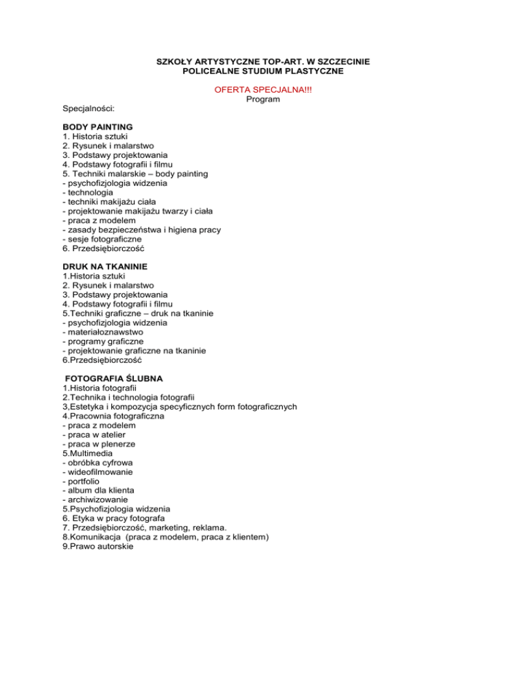 SZKOŁY ARTYSTYCZNE TOP-ART. W SZCZECINIE POLICEALNE STUDIUM PLASTYCZNE OFERTA SPECJALNA!!! Program Specjalności: BODY PAINTING 1. Historia sztuki 2. Rysunek i malarstwo 3. Podstawy projektowania 4. Podstawy fotografii i filmu 5. Techniki malarskie – body painting - psychofizjologia widzenia - technologia - techniki makijaŜu ciała - projektowanie makijaŜu twarzy i ciała - praca z modelem - zasady bezpieczeństwa i higiena pracy - sesje fotograficzne 6. Przedsiębiorczość DRUK NA TKANINIE 1.Historia sztuki 2. Rysunek i malarstwo 3. Podstawy projektowania 4. Podstawy fotografii i filmu 5.Techniki graficzne – druk na tkaninie - psychofizjologia widzenia - materiałoznawstwo - programy graficzne - projektowanie graficzne na tkaninie 6.Przedsiębiorczość FOTOGRAFIA ŚLUBNA 1.Historia fotografii 2.Technika i technologia fotografii 3,Estetyka i kompozycja specyficznych form fotograficznych 4.Pracownia fotograficzna - praca z modelem - praca w atelier - praca w plenerze 5.Multimedia - obróbka cyfrowa - wideofilmowanie - portfolio - album dla klienta - archiwizowanie 5.Psychofizjologia widzenia 6. Etyka w pracy fotografa 7. Przedsiębiorczość, marketing, reklama. 8.Komunikacja (praca z modelem, praca z klientem) 9.Prawo autorskie
