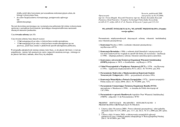 32 • źródła, jeżeli takie korzystanie jest uzasadnione niekomercyjnym celem, do którego wykorzystano bazę, do celów bezpieczeństwa wewnętrznego, postępowania sądowego lub administracyjnego. Nie jest dozwolone powtarzające się i systematyczne pobieranie lub wtórne wykorzystanie sprzeczne z normalnym korzystaniem i powodujące nieusprawiedliwione naruszenie słusznych interesów producenta. 1 Szczecin, październik.2006 Opracowanie stan prawny na 03.10.2006r. mgr inż. Teresa Biegała Rzecznik Patentowy mgr inż. Renata Zawadzka Rzecznik Patentowy Dział Patentów i Transferu Technologii Politechnika Szczecińska tel.449 43 57, tel/fax 449 41 47 Al. Piastów 48 Szczecin V piętro pok 515-514 WŁASNOŚĆ INTELEKTUALNA, WŁASNOŚĆ PRZEMYSŁOWA (Notatkiwersja ogólna ) Czas trwania ochrony (art.10) Czas trwania ochrony bazy danych wynosi • 15 lat następujących po roku, w którym baza została sporządzona, • 15 lat następujących po roku, w którym baza została udostępniona po raz pierwszy, jeżeli baza została w jakikolwiek sposób udostępniona publicznie, W przypadku jakiejkolwiek istotnej zmiany treści bazy, co do jakości lub ilości, w tym jej uzupełnienia , zmiany lub usunięcia jej części, mających znamiona nowego , istotnego co do jakości lub ilości, nakładu, okres liczy się odrębnie. Porozumienia międzynarodowych dotyczących ochrony własności intelektualnej oraz własności przemysłowej: 1. Konwencja Paryska z 1883r. o ochronie własności przemysłowej ratyfikowana wl975r. 2. Konwencja Berneńska z 1886r. o ochronie dzieł literackich i artystycznych (w tym dziel naukowych bez względu na sposób lub formę ich wyrażenia) - ratyfikacja w 1990r. - obejmuje podstawy ochrony własności autorskiej (prawa autorskie). 3. Konwencja o utworzeniu Światowej Organizacji Własności Intelektualnej (OMPI) podpisana w 1967r. w Sztokholmie - ratyfikacja w 1975r. 4. Układ Waszyngtoński o Współpracy Patentowej (PCT) z 1970r. - ratyfikowany w 1991r. - (zgłoszenie międzynarodowe PCT). (Dz.U. Nr 70/1991r. poz.303) 5. Porozumienie Madryckie o Międzynarodowej Rejestracji Znaków Towarowych i Usługowych z 1891r. - przynależność od marca 1991r. 6. Konwencja Monachijska o Patencie Europejskim z 1973r. - (patent europejski) Polska należy od 1 marca 2004r. (Dz.U. Nr 79/2004r. poz. 737) 7. Porozumienie Ustanawiające Światową Organizacje Handlu (WTO) sporządzone w Marakeszu w 1994r. - w stosunku do Polski obowiązuje od 1.07.1995r. 8. Porozumienie w sprawie Handlowych Aspektów Praw Własności Intelektualnej (TRIPS) - załącznik 1 C do Porozumienia o WTO PRZEPISY DOTYCZĄCE WŁASNOŚCI INTELEKTUALNEJ PRZEMYSŁOWEJ OBOWIĄZUJĄCE W POLSCE: I 1. Ustawa z dnia 30 czerwca 2000 r. Prawo własności przemysłowej - tekst jednolity Dziennik Ustaw Nr 119 z 2003r. poz. 1117, zm. Dz.U. Nr 33 z 2004r poz.286 i późn. zm. 2. Ustawa z dnia 14 marca 2003r. o dokonywaniu europejskich zgłoszeń patentowych oraz o skutkach patentu europejskiego w Rzeczypospolitej Polskiej (Dz.U. Nr 65/2003r. poz. 598) 2 3. Ustawa o rzecznikach patentowych z dnia 11 kwietnia 2001r. - Dz.U. Nr 49 z 2001 r. poz.509 4. Rozporządzenie Rady Ministrów z dnia 29.08.2001 w sprawie opłat związanych z ochroną wynalazków , wzorów użytkowych, wzorów przemysłowych, znaków towarowych, oznaczeń geograficznych i topografii układów scalonych. (Dz.U. 35 z 2004r poz.309). 5. Rozporządzenie Rady Ministrów z dnia 30.08.2001 w sprawie postępowania spornego przed Urzędem Patentowym RP (Dz.U. 92 z 2001r. poz. 1018) 6. Rozporządzenie Ministra Finansów z dnia 21.08.2001 r w sprawie warunków obowiązkowego ubezpieczenia od odpowiedzialności cywilnej rzeczników patentowych (Dz.U.220 z 2003r poz.2175) 7. Rozporządzenie Prezesa Rady Ministrów z dnia 17.09.200Ir. w sprawie nadania statusu Urzędowi Patentowemu Rzeczypospolitej Polskiej (Dz.U. 101 z 200Ir. poz. 1092) 8. Rozporządzenie Prezesa Rady Ministrów z dnia 17.09.2001r. w sprawie dokonywania i rozpatrywania zgłoszeń wynalazków i wzorów użytkowych. (Dz.U.102 z 2001r poz.l 119, zm. Dz.U.109z2005r.poz.910) 9. Rozporządzenie Prezesa Rady Ministrów z dnia 19.10.2001r. w sprawie dokonywania i rozpatrywania zgłoszeń topografii układów scalonych (Dz.U. Nr 128 z 2001r. poz. 1413) 10. Rozporządzenie Prezesa Rady Ministrów z dnia 30. 01.2002r. w sprawie dokonywania i rozpatrywania zgłoszeń wzorów przemysłowych (Dz.U. 40 z 2002r. poz. 358, zm. Dz.U. 106 z 2005 r. poz.893) 11. Rozporządzenie Prezesa Rady Ministrów z dnia 25.04.2002r. w sprawie dokonywania i rozpatrywania zgłoszeń oznaczeń geograficznych (Dz.U. 63 z 2002r.poz.570) 12. Rozporządzenie Prezesa Rady Ministrów z dnia 6.06.2002r.r. w sprawie rejestrów prowadzonych przez Urząd Patentowy Rzeczypospolitej Polskiej (Dz.U. 80 z 2002r. poz.723, zm. Dz.U. 109 z 2005r. poz. 912) 13. Rozporządzenie Prezesa Rady Ministrów z dnia 8.07.2002r. w sprawie dokonywania i rozpatrywania zgłoszeń znaków towarowych (Dz.U. 115 z 2002r. poz.998, zm. Dz.U, 109 z 2005 r. poz. 911). 14. Ustawa z dn. 16 kwietnia 1993r. o zwalczaniu nieuczciwej konkurencji - tekst jednolity Dz.U. 153/03 poz.1503 zpożn. zm.) 15. Ustawa z dn. 4 lutego 1994r. o prawie autorskim i prawach pokrewnych (tekst jednolity Dz.U. Nr 90 z 2006 r. poz. 631, sprost. Dz.U 121/06 poz. 843) 16. Kodeks Celny z dn. 9 stycznia 1997r. (Dz.U. Nr 23 poz. 117) 17. Rozporządzenia Rady Ministrów z dn. 19 grudnia 1997r. w sprawie sposobu i trybu postępowania organów celnych przy zatrzymaniu towarów w wypadku podejrzenia naruszenia przepisów dotyczących ochrony własności intelektualnej, handlowej i przemysłowej zdn. 19.12.1997r. (Dz.U. Nr 158 poz. 1049, zm. Dz.U. Nr 16 z 1999r. poz.141) 18. Ustawa z dn.15 grudnia 2000r o ochronie konkurencji i konsumentów (Dz. U. Nr 122 poz. 1319) 19. Ustawa z dn. 27 lipca 2001 r. o ochronie baz danych (Dz.U.Nr 128 poz. 1402) 20. Ustawa z dnia 17 grudnia 2004r. o rejestracji i o