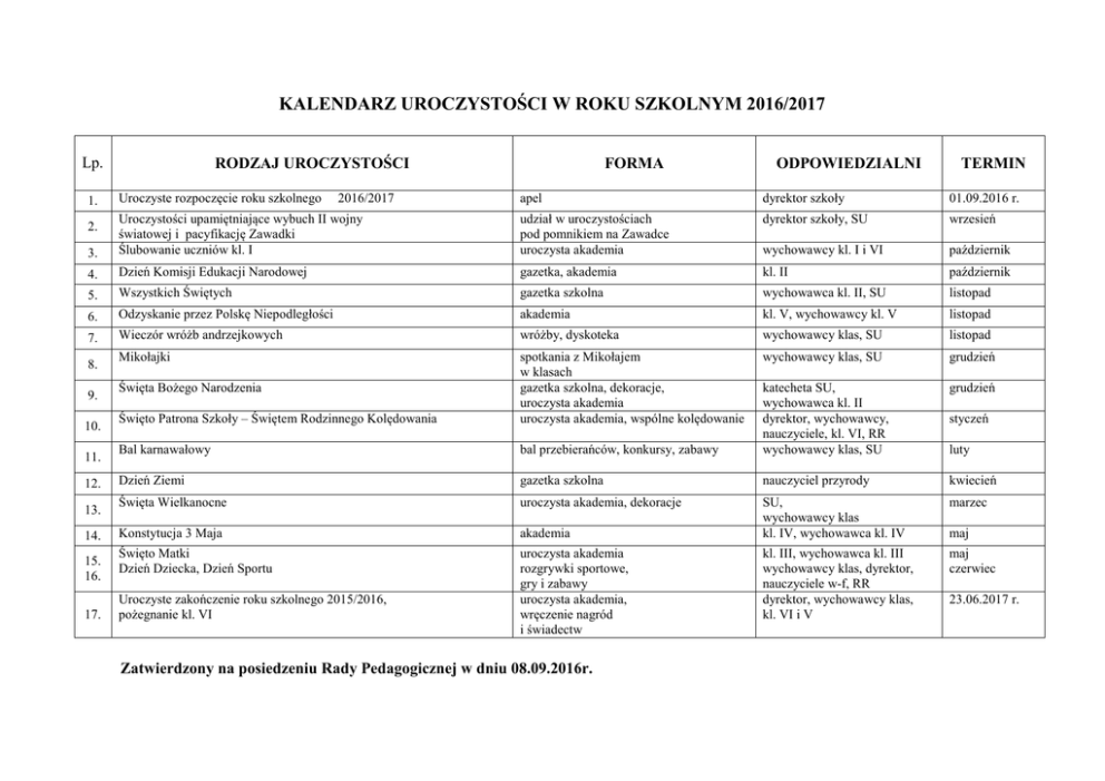 KALENDARZ UROCZYSTOŚCI W ROKU SZKOLNYM 2016/2017