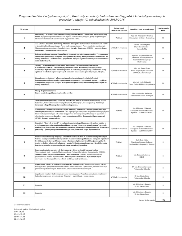 Program Studiów Podyplomowych pt. „Kontrakty na roboty budowlane według polskich i międzynarodowych procedur”, edycja VI, rok akademicki 2015/2016 Nr zjazdu 1 2 3 4 5 6 Nazwa przedmiotu Dokumenty i Warunki Kontraktowe według procedur FIDIC - omówienie Klauzul i intencji FIDIC. Ryzyko i odpowiedzialność. Siła wyższa. Zakończenie, przejęcie, próby eksploatacyjne. Płatności w kontraktach realizowanych wg procedur FIDIC. Akt Umowy. Załącznik do Umowy. Warunki Szczególne do Warunków Kontraktowych FIDIC w kontekście Kodeksu cywilnego, Prawa budowlanego i ustawy Prawo zamówień publicznych. Międzynarodowe procedury wyboru Inżyniera. Inżynier Kontraktu (FIDIC) i jego rola. Prawo budowlane. Ubezpieczenia w kontraktach. Dokumentacja przetargowa (Specyfikacja istotnych warunków zamówienia). Przygotowanie zamówienia publicznego. Program funkcjonalno-użytkowy. Opis przedmiotu zamówienia na roboty budowlane – dokumentacja projektowa. Specyfikacje techniczne wykonania i odbioru robót budowlanych. Metody i procedura rozliczania robót. Świadectwo Płatności według Warunków Kontraktowych FIDIC. Metodologia planowania robót. Harmonogramy (przykłady warsztaty). Wykorzystanie harmonogramów w realizacji przedsięwzięć. Możliwości oceny opóźnień w robotach i przewidywanych terminów zakończenia przedsięwzięcia. Ryzyka. Zarządzanie projektami – planowanie, realizacja zadań, zasoby, jakość, budżet, harmonogram, dokumentacja, raportowanie, organizacja i zarządzanie ludźmi i ryzykiem. Zarządzanie projektami (Project Management) - prezentacja zastosowań praktycznych na roboty budowlane. Wstęp do prawoznawstwa Prawo zamówień publicznych a kodeks cywilny Rodzaj zajęć (wykład, ćwiczenia) Wykłady Wykłady + ćwiczenia Nazwisko i imię prowadzącego Mgr inż. Mieczysław Grabiec Mieczysław Grabiec - Konsulting Dr inż. Janusz Rybka Biuro Inwestorskie Janusz Rybka Liczba godzin zajęć 16 16 Wykłady Mgr inż. Krzysztof Błachut „IBTECH” Przedsiębiorstwo Techniki Instalacyjnej i Budowlanej 16 Wykłady + ćwiczenia Mgr inż. Paweł Zejer Biuro Inżynieryjno-Doradcze EKODORA Paweł Zejer 16 Wykłady + ćwiczenia Mgr inż. Lech Zioberski Firma Zioberski Biuro Inżynierskie 16 Wykłady + ćwiczenia Mec. Agnieszka Suchecka Kancelaria Radców Prawnych 16 Wykłady Inż. Zbigniew J. Boczek Europejski Instytut Ekonomiki Rynków - EUROINSTYTUT 16 Wykłady + ćwiczenia Inż. Zbigniew J. Boczek Europejski Instytut Ekonomiki Rynków - EUROINSTYTUT 16 Wykłady Dr Sylwia Mróz Narodowy Fundusz Ochrony Środowiska i Gospodarki Wodnej 8 Wykłady Inż. Tomasz Latawiec SIDiR 8 Wykłady Dr inż. Dariusz Kowalski Politechnika Gdańska 8 Wykłady + ćwiczenia Dr inż. Beata Grzyl Politechnika Gdańska 8 Międzynarodowe procedury realizacji inwestycji a polskie prawo - Kodeks cywilny, Prawo budowlane, Ustawa Prawo zamówień publicznych, Dyrektywy Unii Europejskiej. Realizacja inwestycji celu publicznego i uwarunkowania prawne. 7 8 9 9 10 10 Zarządzanie kontraktami inwestycyjnymi na roboty budowlane - według prawa polskiego oraz międzynarodowych standardów – Na czym polega zarządzanie projektami inwestycyjnymi? Etapy realizacji inwestycji. Jak należy przygotować inwestycję celu publicznego w zgodności z obowiązującym prawem. Zasady wyceny przedmiaru robót w dokumentacji przetargowej (SIWZ). Systemy wynagrodzeń. Przykłady "dobrych praktyk" w realizacji zamówienia publicznego. Jak unikać błędów w trakcie przygotowania zamówienia publicznego, oraz "nieprzestrzegania prawa" na etapie realizacji - wykonawstwa. Orzecznictwo w realizacji inwestycji celu publicznego. Warsztaty przykłady i sposób podejścia oraz rozwiązywania problemów etapu wykonawstwa. Podstawowe dokumenty dotyczące kwalifikowania wydatków w zamówieniach publicznych. Główne zasady kwalifikowania wydatków w zamówieniach publicznych. Kategorie wydatków kwalifikujące się do współfinansowania z Funduszu Spójności. Kwalifikacja szczególnych typów wydatków z kategorii „Budowa i montaż”. Opłaty administracyjne . Kwalifikowanie kosztów/wydatków na poszczególnych etapach realizacji projektu. Prezentacja międzynarodowych doświadczeń – dobre praktyki, kierunki zmian. Wprowadzenie (rola i zadania Międzynarodowej Federacji Inżynierów Konsultantów (FIDIC), Stowarzyszenia Inżynierów Doradców i Rzeczoznawców (SIDiR), omówienie realizacji przykładowych budów, wydawnictwa). Rola inżyniera konsultanta w przedsięwzięciu, omówienie popełnianych błędów, dobrych praktyk, porady praktyczne. Zapewnienie jakości w realizacji przedsięwzięć budowlanych. Współczesne systemy jakości, koszty jakości. Specyfika zapewnienia jakości w budownictwie. Zapewnienie jakości w realizacji przedsięwzięć budowlanych. Zapewnienie jakości materiałów budowlanych. Zagadnienie ryzyka w budowlanym procesie inwestycyjnym. Procedura zarządzania ryzykiem w budowlanym procesie inwestycyjnym. Warsztaty - identyfikacja i ocena ryzyka. 11 Egzamin Inż. Zbigniew J. Boczek, Dr inż. Beata Grzyl 8 12 Egzamin Inż. Zbigniew J. Boczek, Dr inż. Beata Grzyl 8 łaczna liczba godzin: Godziny wykładów: Sobota - 8 godzin, Niedziela - 8 godzin 9.00 - 10.30 10.45 - 12.15 13.00 - 14.30 14.45 - 16.15 176