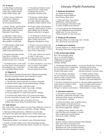 14. Te Deum 1. Ciebie Boga wysławiamy, Tobie Panu wieczna chwała, Ciebie Ojca, niebios bramy, Ciebie wielbi ziemia cała. 8. Tyś pokruszył śmierci wrota; starł jej oścień w męki dobie I rajskiego kraj żywota, otworzyłeś wiernym sobie. 2. Tobie wszyscy Aniołowie, Tobie Moce i Niebiosy, Cheruby, Serafinowie, ślą wieczystej pieśni głosy. 9. Po prawicy siedzisz Boga, w chwale Ojca, Syn Jedyny, Lecz gdy zagrzmi trąba sroga, przyjdziesz sądzić ludzkie czyny. 3. Święty, Święty, nad Świętymi, Bóg Zastępów, Król łaskawy, Pełne niebo z kręgiem ziemi, Majestatu Twojej sławy. 10. Prosim, słudzy łask niegodni, wspomóż, obmyj grzech co plami, Gdyś odkupił nas od zbrodni Drogiej swojej Krwi strugami. 4. Apostołów Tobie rzesza, chór Proroków pełen chwały, Tobie hołdy nieść pośpiesza Męczenników orszak biały. 11. Ze Świętymi w blaskach mocy, wiecznej chwały zlej nam zdroje: Zbaw o Panie, lud sierocy, Błogosław dziedzictwo swoje. 5. Ciebie poprzez okrąg ziemi, z głębi serca ile zdoła, Głosy ludów zgodzonymi, wielbi święta pieśń Kościoła. 12. Rządź je, broń po wszystkie lata, prowadź w niebios błogie bramy, My w dzień każdy, Władco co świata, Imię Twoje wysławiamy. 6. Niezmierzonej Ojca chwały, 13. Po wiek wieków nie ustanie, Syna Słowo wiekuiste, co sławi Twoje czyny, Z Duchem wszechświat wielbi cały O w dniu onym racz nas Panie Królem chwały Tyś, o Chryste. od wszelakiej ustrzec winy. 7. Tyś Rodzica Syn z wiek wieka, by świat zbawić swoim zgonem, Przyoblókłszy się w człowieka, nie wzgardziłeś Panny łonem. 14. Zjaw swą litość w życiu całym tym, co żebrzą Twej opieki: w Tobie Panie zaufałem, Nie zawstydzę się na wieki. 15. Regnavit Ref. Zmartwychwstał Chrystus Król, Zakrólował nam Bóg, Śmiercią zwyciężył śmierć, Życie nam dał na wieki! 16. Chrystus Pan zmartwychwstał 1. Chrystus Pan zmartwychwstał, zwycięstwo otrzymał; bo zburzył śmierć srogą, Swoją śmiercią drogą. Alleluja. 2. Zwalczył czarta złego i starł głowę jego: człowieka grzesznego wydarł z mocy jego. Alleluja. 3. Śmierć srodze poraził, a moc czarta skaził, żywot nasz naprawił, to z łaski Swej sprawił. Alleluja. 4. O Chryste nasz Panie! Przez Twe zmartwychwstanie, daj nam z grzechów powstać, łaski Twojej dostać. Alleluja. 5. A po tym kłopocie, daj w wiecznym żywocie, widzieć Ojca swego, Boga Wszechmocnego. Alleluja. 17. Cała Ziemio Ref. Cała ziemio wołaj z radości na cześć Pana, Raduj się, wesel się. Cała ziemio wołaj z radości na cześć Pana, Alleluja, Alleluja. 1. Śpiewajcie Panu pieśń nową, Albowiem uczynił cuda. Zwycięstwo Mu zgotowała Jego prawica i święte ramię Jego. 2. Pan okazał swoje zbawienie, Na oczach pogan objawił swą sprawiedliwość. Wspomniał na dobroć i na wierność swoją, Dla domu Izraela. 3. Ujrzały wszystkie krańce ziemi, Zbawienie Boga naszego. Wołaj z radości na cześć Pana cała ziemio, Cieszcie się, weselcie i grajcie. 4 Liturgia Wigilii Paschalnej 1. Radosna Światłości Ant. Radosna Światłości, Prawdziwa Jedyna Mądrości Jezu Chryste, Panie nasz! 1. Tobie śpiewamy, Synu Maryi, Oblubienicy wolnej od skazy, żeś raczył przyjąć człowiecze ciało, Ty, który źródłem jesteś Jasności. 2. Tyś jest odwiecznie Jednorodzony, Tyś jest Odblaskiem Ojca Światłości, udrękę nocy Ty z nas usuwasz i dusze świętych Ty sam oświecasz. 2. Psalm po III czytaniu Śpiewajcie Panu, bo wielka Jego moc i chwała, On z niewoli zła swój lud ocala 3. Psalm po V czytaniu Czerpać będziecie ze zdrojów zbawienia, Wzywajcie Pana sławcie jego imię. 2x 4. Oto są baranki młode Ref.: Oto są baranki młode oto ci, co zawołali alleluja! Dopiero przyszli do zdrojów, światłością się napełnili, Alleluja, alleluja! 1. Na Baranka Pańskich godach, 4. Już nam Paschą Tyś, oChryste W szat świątecznych czystej bieli, Wielkanocną też ofiarą, Po krwawego morza wodach, Tyś przaśniki nasze czyste, Nieśmy Panu pieśń weseli. Dla dusz prostych z szczerą wiarą 2. W swej miłości wiekuistej On nas swoją Krwią częstuje, Nam też Ciało swe przeczyste, Chrystus kapłan ofiaruje. 5. O Ofiaro niebios święta, Ty moc piekła pokonywasz, Zrywasz ciężkie śmierci pęta, Wieniec życia nam zdobywasz. 3. Na drzwi świętą Krwią skropione 6. Chrystus piekło pogromiwszy, Anioł mściciel z lękiem wziera, Swój zwycięski znak roztacza, Pędzi morze rozdzielone, Niebo ludziom otworzywszy, Wrogów w nurtach swych pożera. Króla mroków w więzy wtłacza. 5. Zwycięzca śmierci 1. Zwycięzca śmierci piekła i szatana Wychodzi z grobu dnia trzeciego z rana Naród niewierny trwoży się przestrasza Na cud Jonasza - Alleluja! 2. Ziemia się trzęsie, straż się grobu miesza, Anioł zstępuje, niewiasty pociesza; Patrzcie mówi im, grób ten próżny został, Pan zmartwychpowstał .Alleluja! 3. Ustąpcie od nas, smutki i trosk żale, Gdy Pan Zbawiciel triumfuje w chwale. Ojcu swojemu już uczynił zadość, Nam niesie radość. Alleluja! 6. Sanctus, Sanctus, Sanctus, Sanctus Dominus Deus Sabaoth. Pleni sunt coeli et terra gloria Tua, Hosanna in excelsis, Hosanna in excelsis Benedictus qui venit in nomine Domini. Hosanna in excelsis, Hosanna in excelsis 1 7. Agnus Dei Agnus Dei qui tollis peccata mundi, Miserere, miserere nobis. 2x Agnus Dei qui tollis peccata mundi, Dona nobis, Dona nobis pacem. 8. O Filii et Filiae 1. O dzieci Boże dosyć łez, bo Chrystus dziś zmartwychwstan jest, Król życia, wiecznej chwały Król Alleluja! 2. I w ranny brzask pierwszego dnia Do pustego grobu Pana Przyszli zdumieni uczniowie, Alleluja! 3. Lecz w jasnej bieli Anioł tam, Nad grobem zadumany sam, Rzekł: ”w Galilei jest wasz Pan”, Alleluja! 4. Do zgromadzonych uczniów swych Wszedł Chrystus przez zamknięte drzwi I rzekł: „Przynoszę pokój wam”, Alleluja! 5. W ten Zmartwychwstania jasny dzień Smętny zwątpienia okrył cień Serce Tomasza