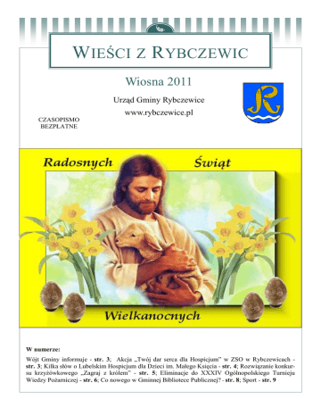 WIEŚCI Z RYBCZEWIC Wiosna 2011 Urząd Gminy Rybczewice www.rybczewice.pl CZASOPISMO BEZPŁATNE W numerze: Wójt Gminy informuje - str. 3; Akcja „Twój dar serca dla Hospicjum” w ZSO w Rybczewicach str. 3; Kilka słów o Lubelskim Hospicjum dla Dzieci im. Małego Księcia - str. 4; Rozwiązanie konkursu krzyżówkowego „Zagraj z królem” - str. 5; Eliminacje do XXXIV Ogólnopolskiego Turnieju Wiedzy Pożarniczej - str. 6; Co nowego w Gminnej Bibliotece Publicznej? - str. 8; Sport - str. 9 Str. 2 Wieści z Rybczewic Wiosna 2011 Z okazji Wielkanocy najlepsze wiosenne życzenia: Niech Zmartwychwstały Chrystus wspiera Was swymi łaskami i da Wam moc pokonywania codziennych trudności życia. Wydawca: Siły i mądrości płynącej z Tajemnicy Zmartwychwstania Pańskiego, Urząd Gminy Rybczewice zdrowych i pełnych spokoju Rybczewice Drugie 119 Świąt Wielkanocnych życzą 21-065 Rybczewice Pracownicy Urzędu Gminy Rybczewice tel.: (081) 584 44 60 fax.: (081) 584 44 74 e-mail: [email protected] www.rybczewice.pl mgr Anna Kowalczyk Podinspektor ds. promocji i rozwoju gminy. tel.: 58 44 467 fax: 58 44474 e-mail: [email protected] Wieści z Rybczewic Wiosna 2011 Str. 3 Wójt Gminy informuje Szanowni Państwo Mieszkańcy Gminy Rybczewice Od momentu, kiedy ponownie obdarzyliście mnie zaufaniem i dzięki wam po raz kolejny zostałem Wójtem Gminy Rybczewice minęło kilka miesięcy. W trakcie tych kilku miesięcy wraz z pracownikami nie szczędziłem sił i czasu, by jak najlepiej wykonywać powierzoną funkcję. Po blisko 16 latach uda nam się dokończyć budowę szkoły w Rybczewicach. Wykonawca zakończy prace w szkole tak, aby nasz młodzież mogła od nowego roku szkolnego uczyć się w nowej szkole. Cała inwestycja będzie kosztowała około 3, 4 mln zł. Od września w nowym budynku będzie siedziba Zespołu Szkół w Rybczewicach od Szkoły Podstawowej przez Gimnazjum do Liceum. W nowej szkole uczniowie będą mieli do dyspozycji przestronne sale lekcyjne z pełnym wyposażeniem, bibliotekę, czytelnię oraz stołówkę z jadalnią. W przyszłym roku przy szkole powstanie boisko typu Orlik. My wszyscy, a w szczególności uczniowie już nie mogą doczekać się przeprowadzki. Inwestycje drogowe w Gminie Rybczewice 2011. Gmina Rybczewice w styczniu br. przeprowadziła przetarg na dostawą 1500 ton kruszywa drogowego dolomitowego z przeznaczeniem na remonty dróg gminnych. Przetarg wygrała firma Przedsiębiorstwo Usługowo Handlowe „MIREX” Mirosław Kwapiński. Akcja „Twój dar serca dla Hospicjum” w ZSO w Rybczewicach Już od kilku lat uczniowie ZSO w Rybczewicach organizują różnorakie działania, których celem jest materialne wsparcie Hospicjum im. Małego Księcia w Lublinie. Dodatkowo w ubiegłym roku nasi uczniowie chętnie przyłączyli się do akcji zbierania nakrętek, która trwa nadal. W tym roku akcja „Twój dar serca dla Hospicjum” prowadzona jest przez kl. II a w ramach gimnazjalnego projektu edukacyjnego. Drugoklasiści włączyli do swoich działań także pozostałych uczniów ZSO, nauczycieli oraz swoich rodziców. Pierwszym działaniem był kiermasz ciast na terenie szkoły, który trwał od 30 marca do 15 kwietnia. Uczniowie poszczególnych klasy, a także nauczyciele, zgodnie z przyjętym harmonogramem, przynosili do szkoły ciasto. Jego sprzedażą zajmowała się młodzież z II a. Drugoklasiści rozprowadzali ciasto także w Urzędzie Gminy, Banku i GS-ie. Str. 4 Wieści z Rybczewic Wiosna 2011 20 kwietnia odbędzie się w szkole spotkanie dzieci i młodzieży z prezesem Hospicjum o. Filipem Buczyńskim. Jego celem jest przybliżenie działalności hospicjum naszym uczniom, a także uwrażliwienie ich na potrzeby drugiego człowieka. Na 29 kwietnia zaplanowany jest charytatywny koncert, który będzie miał miejsce przy budynku Urzędu Gminy w Rybczewicach. Zagra na nim hiphopowy zespół Full Power Spirit, koncertujący nie tylko na terenie Polski, ale także poza jej granicami. Piosenka tego zespołu -„Nieśmiertelni” promowała znany wszystkim film „Popiełuszko – wolność jest w nas”. Na koncercie zagrają także inni wykonawcy. Ponadto w maju w Kościele parafialnym w Częstoborowicach odbędzie się koncert pieśni religijnych w wykonaniu chóru z Miejskiego Centrum Kultury w Piaskach. W czasie koncertów będzie można wesprzeć Hospicjum, kupując symboliczną cegiełkę. Serdecznie dziękujemy za pomoc Wójtowi Gminy Rybczewice oraz rodzicom uczniów kl. II a. Bardzo serdecznie zapraszamy wszystkich mieszkańców Gminy Rybczewice do włączenia się w nasze działania, szczególnie poprzez udział w koncertach. Pamiętajmy, że większa radość płynie z dawania niż z brania. Koordynatorki gimnazjalnego projektu edukacyjnego realizowanego przez kl. II a Kilka słów o Lubelskim Hospicjum dla Dzieci im. Małego Księcia Lubelskie Hospicjum dla Dzieci im. Małego Księcia funkcjonuje od 1997 roku. Założycielem, pomysłodawcą i prezesem Hospicjum jest o. Filip Buczyński. Jest to jedyne w Polsce południowo-wschodniej domowe hospicjum dla dzieci. Zostało ono powołane, aby objąć domową opieką dzieci i młodzież z chorobami nowotworowymi oraz innymi nieuleczalnymi i postępującymi schorzeniami. Głównym celem Hospicjum jest poprawa jakości życia Podopiecznych. Dzięki tej opiece dzieci mogą spędzić ostatnie dni swego życia w domu, a nie w szpitalu. Hospicjum organizuje pomoc medyczną i psychologiczną swoim pacjentom w ich domach. Obecnie obejmuje opieką 52 (pięćdziesiąt dwoje) nieuleczalnie chorych dzieci oraz ich rodziny na terenie całej Lubelszczyzny. Dyżur Hospicjum trwa 24 godziny na dobę, przez 7 dni w tygodniu. W każdej chwili zespół medyczny gotowy jest służyć pomocą. Hospicjum opłaca zakup leków oraz specjalistycznego sprzętu medycznego (m. in.: koncentratorów tlenu, pulsoksymetrów, pomp infuzyjnych, ssaków, inhalatorów, itp.), który na co dzień funkcjonuje w domach Pacjent
