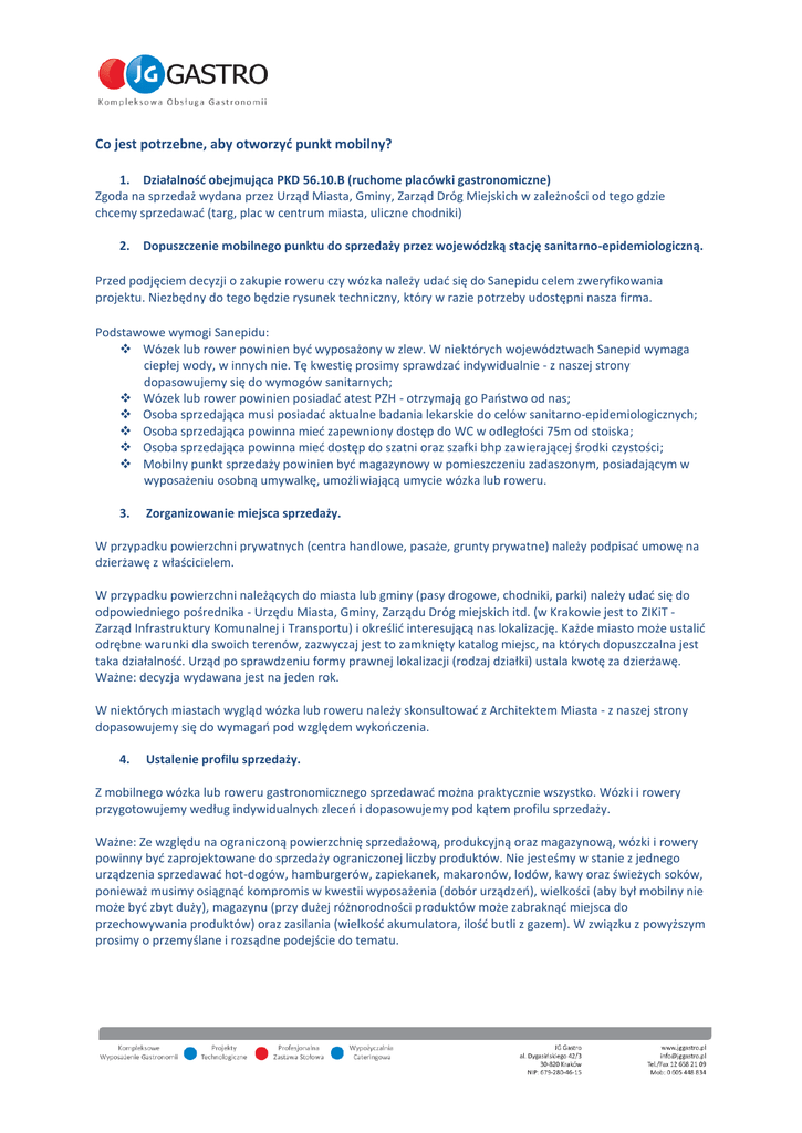 Co jest potrzebne, aby otworzyć punkt mobilny? 1. Działalność obejmująca PKD 56.10.B (ruchome placówki gastronomiczne) Zgoda na sprzedaż wydana przez Urząd Miasta, Gminy, Zarząd Dróg Miejskich w zależności od tego gdzie chcemy sprzedawać (targ, plac w centrum miasta, uliczne chodniki) 2. Dopuszczenie mobilnego punktu do sprzedaży przez wojewódzką stację sanitarno-epidemiologiczną. Przed podjęciem decyzji o zakupie roweru czy wózka należy udać się do Sanepidu celem zweryfikowania projektu. Niezbędny do tego będzie rysunek techniczny, który w razie potrzeby udostępni nasza firma. Podstawowe wymogi Sanepidu: Wózek lub rower powinien być wyposażony w zlew. W niektórych województwach Sanepid wymaga ciepłej wody, w innych nie. Tę kwestię prosimy sprawdzać indywidualnie - z naszej strony dopasowujemy się do wymogów sanitarnych; Wózek lub rower powinien posiadać atest PZH - otrzymają go Państwo od nas; Osoba sprzedająca musi posiadać aktualne badania lekarskie do celów sanitarno-epidemiologicznych; Osoba sprzedająca powinna mieć zapewniony dostęp do WC w odległości 75m od stoiska; Osoba sprzedająca powinna mieć dostęp do szatni oraz szafki bhp zawierającej środki czystości; Mobilny punkt sprzedaży powinien być magazynowy w pomieszczeniu zadaszonym, posiadającym w wyposażeniu osobną umywalkę, umożliwiającą umycie wózka lub roweru. 3. Zorganizowanie miejsca sprzedaży. W przypadku powierzchni prywatnych (centra handlowe, pasaże, grunty prywatne) należy podpisać umowę na dzierżawę z właścicielem. W przypadku powierzchni należących do miasta lub gminy (pasy drogowe, chodniki, parki) należy udać się do odpowiedniego pośrednika - Urzędu Miasta, Gminy, Zarządu Dróg miejskich itd. (w Krakowie jest to ZIKiT Zarząd Infrastruktury Komunalnej i Transportu) i określić interesującą nas lokalizację. Każde miasto może ustalić odrębne warunki dla swoich terenów, zazwyczaj jest to zamknięty katalog miejsc, na których dopuszczalna jest taka działalność. Urząd po sprawdzeniu formy prawnej lokalizacji (rodzaj działki) ustala kwotę za dzierżawę. Ważne: decyzja wydawana jest na jeden rok. W niektórych miastach wygląd wózka lub roweru należy skonsultować z Architektem Miasta - z naszej strony dopasowujemy się do wymagań pod względem wykończenia. 4. Ustalenie profilu sprzedaży. Z mobilnego wózka lub roweru gastronomicznego sprzedawać można praktycznie wszystko. Wózki i rowery przygotowujemy według indywidualnych zleceń i dopasowujemy pod kątem profilu sprzedaży. Ważne: Ze względu na ograniczoną powierzchnię sprzedażową, produkcyjną oraz magazynową, wózki i rowery powinny być zaprojektowane do sprzedaży ograniczonej liczby produktów. Nie jesteśmy w stanie z jednego urządzenia sprzedawać hot-dogów, hamburgerów, zapiekanek, makaronów, lodów, kawy oraz świeżych soków, ponieważ musimy osiągnąć kompromis w kwestii wyposażenia (dobór urządzeń), wielkości (aby był mobilny nie może być zbyt duży), magazynu (przy dużej różnorodności produktów może zabraknąć miejsca do przechowywania produktów) oraz zasilania (wielkość akumulatora, ilość butli z gazem). W związku z powyższym prosimy o przemyślane i rozsądne podejście do tematu.