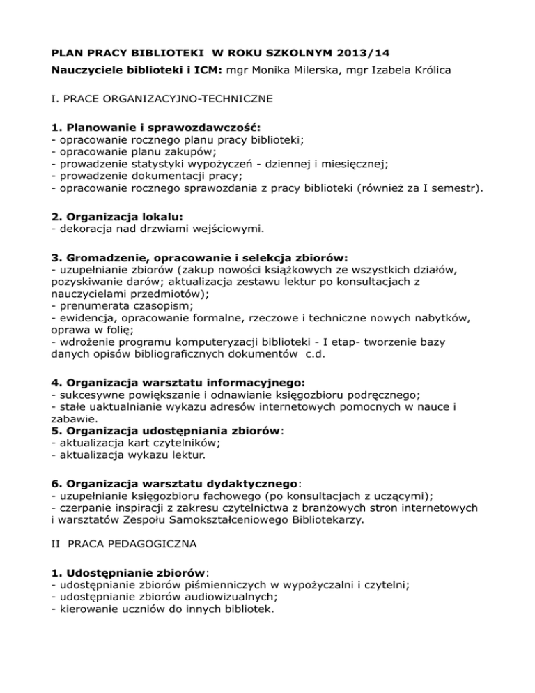 PLAN PRACY BIBLIOTEKI W ROKU SZKOLNYM 2013/14 Nauczyciele biblioteki i ICM: mgr Monika Milerska, mgr Izabela Królica I. PRACE ORGANIZACYJNO-TECHNICZNE 1. Planowanie i sprawozdawczość: - opracowanie rocznego planu pracy biblioteki; - opracowanie planu zakupów; - prowadzenie statystyki wypożyczeń - dziennej i miesięcznej; - prowadzenie dokumentacji pracy; - opracowanie rocznego sprawozdania z pracy biblioteki (również za I semestr). 2. Organizacja lokalu: - dekoracja nad drzwiami wejściowymi. 3. Gromadzenie, opracowanie i selekcja zbiorów: - uzupełnianie zbiorów (zakup nowości książkowych ze wszystkich działów, pozyskiwanie darów; aktualizacja zestawu lektur po konsultacjach z nauczycielami przedmiotów); - prenumerata czasopism; - ewidencja, opracowanie formalne, rzeczowe i techniczne nowych nabytków, oprawa w folię; - wdrożenie programu komputeryzacji biblioteki - I etap- tworzenie bazy danych opisów bibliograficznych dokumentów c.d. 4. Organizacja warsztatu informacyjnego: - sukcesywne powiększanie i odnawianie księgozbioru podręcznego; - stałe uaktualnianie wykazu adresów internetowych pomocnych w nauce i zabawie. 5. Organizacja udostępniania zbiorów: - aktualizacja kart czytelników; - aktualizacja wykazu lektur. 6. Organizacja warsztatu dydaktycznego: - uzupełnianie księgozbioru fachowego (po konsultacjach z uczącymi); - czerpanie inspiracji z zakresu czytelnictwa z branżowych stron internetowych i warsztatów Zespołu Samokształceniowego Bibliotekarzy. II PRACA PEDAGOGICZNA 1. Udostępnianie zbiorów: - udostępnianie zbiorów piśmienniczych w wypożyczalni i czytelni; - udostępnianie zbiorów audiowizualnych; - kierowanie uczniów do innych bibliotek. 2. Działalność informacyjna i poradnictwo w wyborach czytelniczych: - udzielanie informacji bibliotecznych, bibliograficznych, tekstowych i rzeczowych; - szkolenie uczniów w wyszukiwaniu informacji w komputerze, internecie; - udzielanie porad w wyborach czytelniczych; - propagowanie biblioteki i książek; - gazetka biblioteczna, wykaz nowości; - prace nad dostosowaniem oferty czytelniczej dla najmłodszych uczniów, zgodnie z nową podstawą programową. 3. Przysposobienie czytelnicze i informacyjne, edukacja medialna: - przeprowadzenie lekcji bibliotecznej w każdej klasie; - instruktaż indywidualny na bieżąco według potrzeb. 4. Rozwijanie kultury czytelniczej i kultury żywego słowa wśród uczniów: - przeprowadzenie konkursu plastyczno-czytelniczego; - praca indywidualna z czytelnikami - rozmowy nt. zainteresowań, potrzeb, osiągnięć i trudności, pomoc w doborze odpowiedniej literatury; - korelacja czytelnictwa z twórczością plastyczną dzieci. 5. Współpraca ze środowiskiem szkolnym i pozaszkolnym: - współpraca z nauczycielami przedmiotów w ustalaniu planu zakupów; - współpraca z pedagogiem szkolnym w poznaniu uczniów i ich aktywacji czytelniczej; - współpraca z dziecięcą biblioteką publiczną i biblioteką w Karwinie (RC) konkurs plastyczny, organizacja wystawy; - współpraca z bibliotekami powiatu w ramach Zespołu Samokształceniowego Bibliotekarzy Szkolnych wymiana doświadczeń, warsztaty metodyczne, prowadzenie zajęć w ramach wsparcia metodycznego dla nauczycieli bibliotekarzy powiatu cieszyńskiego; - organizowanie kiermaszu używanych podręczników; - przygotowywanie spisu podręczników na następny rok szkolny. 6. Działalność ICIM Biblioteczne Centrum Informacji Multimedialnej - korzystanie przez uczniów ze stron internetowych wyszukiwanie informacji na tematy lekcyjne, naukowe, kulturalne, turystyczne itp., samodzielne lub z pomocą nauczyciela bibliotekarza; - korzystanie przez uczniów ze stron internetowych zawierających gry edukacyjne, gry logiczne, zagadki, krzyżówki z różnych dziedzin wiedzy przeznaczonych dla dzieci młodszych (zestaw gier do wglądu w bibliotece szkolnej); - korzystanie z centrum przez nauczycieli - opracowywanie materiałów edukacyjnych i informacyjnych (konkursy); - korzystanie z centrum w ramach działalności Koła Komputerowego oraz Koła Dziennikarskiego.