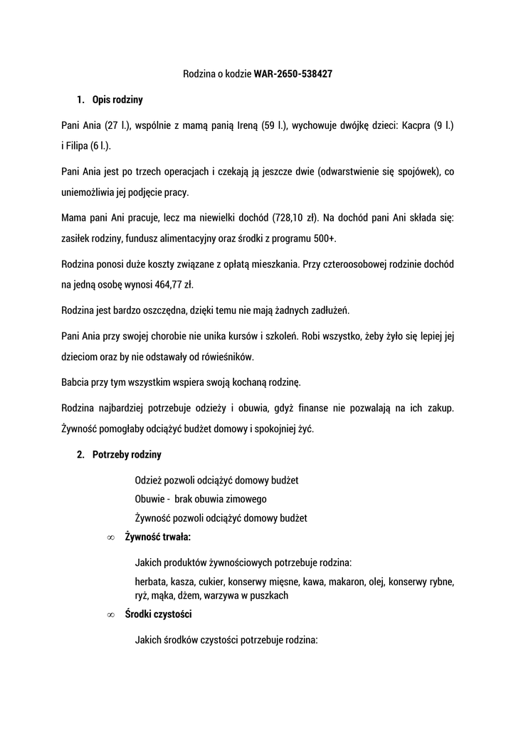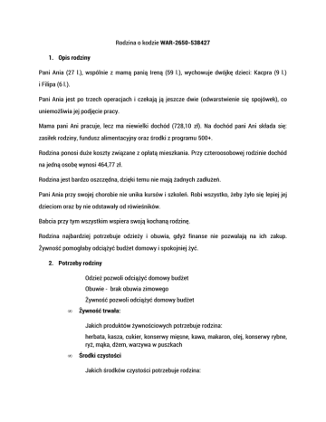 Rodzina o kodzie WAR-2650-538427 1. Opis rodziny Pani Ania (27 l.), wspólnie z mamą panią Ireną (59 l.), wychowuje dwójkę dzieci: Kacpra (9 l.) i Filipa (6 l.). Pani Ania jest po trzech operacjach i czekają ją jeszcze dwie (odwarstwienie się spojówek), co uniemożliwia jej podjęcie pracy. Mama pani Ani pracuje, lecz ma niewielki dochód (728,10 zł). Na dochód pani Ani składa się: zasiłek rodziny, fundusz alimentacyjny oraz środki z programu 500+. Rodzina ponosi duże koszty związane z opłatą mieszkania. Przy czteroosobowej rodzinie dochód na jedną osobę wynosi 464,77 zł. Rodzina jest bardzo oszczędna, dzięki temu nie mają żadnych zadłużeń. Pani Ania przy swojej chorobie nie unika kursów i szkoleń. Robi wszystko, żeby żyło się lepiej jej dzieciom oraz by nie odstawały od rówieśników. Babcia przy tym wszystkim wspiera swoją kochaną rodzinę. Rodzina najbardziej potrzebuje odzieży i obuwia, gdyż finanse nie pozwalają na ich zakup. Żywność pomogłaby odciążyć budżet domowy i spokojniej żyć. 2. Potrzeby rodziny Odzież pozwoli odciążyć domowy budżet Obuwie - brak obuwia zimowego Żywność pozwoli odciążyć domowy budżet • Żywność trwała: Jakich produktów żywnościowych potrzebuje rodzina: herbata, kasza, cukier, konserwy mięsne, kawa, makaron, olej, konserwy rybne, ryż, mąka, dżem, warzywa w puszkach • Środki czystości Jakich środków czystości potrzebuje rodzina: proszek do prania, płyn do mycia naczyń, mydło/żel myjący, pasta do zębów, płyny czyszczące, szampon, szczoteczka do zębów • Odzież Anna Rodzaj odzieży: zimowe Kategoria: kurtka Rozmiar: 155/M Filip Rodzaj odzieży: przejściowe Kategoria: spodnie dresowe Rozmiar: 120 Filip Rodzaj odzieży: zimowe Kategoria: rękawice Kacper Rodzaj odzieży: przejściowe Kategoria: spodnie dresowe Rozmiar: 130 • Obuwie Filip Rodzaj obuwia: zimowe Kategoria: buty Rozmiar: 31 Kacper Rodzaj obuwia: zimowe Kategoria: buty Rozmiar: 33/34 Anna Rodzaj obuwia: zimowe Kategoria: buty Rozmiar: 36 Uwagi: buty moro timberki fuego • - Wyposażenie mieszkania Jakiego wyposażenia mieszkania potrzebuje rodzina: Kołdra, Poduszka Inne: Dwie kołdry dla dzieci 90x200 i dwie poduszki. • - Specjalne upominki Filip klocki lego ninjago i kredki grube bambino. Kacper telefon. Pani Irena suszarkę do włosów. Pani Anna kosmetyki.
