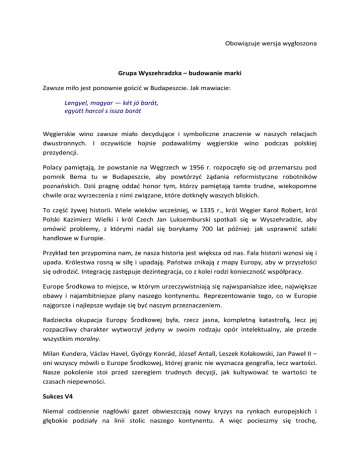 Obowiązuje wersja wygłoszona Grupa Wyszehradzka – budowanie marki Zawsze miło jest ponownie gościć w Budapeszcie. Jak mawiacie: Lengyel, magyar — két jó barát, együtt harcol s issza borát Węgierskie wino zawsze miało decydujące i symboliczne znaczenie w naszych relacjach dwustronnych. I oczywiście hojnie podawaliśmy węgierskie wino podczas polskiej prezydencji. Polacy pamiętają, że powstanie na Węgrzech w 1956 r. rozpoczęło się od przemarszu pod pomnik Bema tu w Budapeszcie, aby powtórzyć żądania reformistyczne robotników poznańskich. Dziś pragnę oddać honor tym, którzy pamiętają tamte trudne, wiekopomne chwile oraz wyrzeczenia z nimi związane, które dotknęły waszych bliskich. To część żywej historii. Wiele wieków wcześniej, w 1335 r., król Węgier Karol Robert, król Polski Kazimierz Wielki i król Czech Jan Luksemburski spotkali się w Wyszehradzie, aby omówić problemy, z którymi nadal się borykamy 700 lat później: jak usprawnić szlaki handlowe w Europie. Przykład ten przypomina nam, że nasza historia jest większa od nas. Fala historii wznosi się i upada. Królestwa rosną w siłę i upadają. Państwa znikają z mapy Europy, aby w przyszłości się odrodzić. Integrację zastępuje dezintegracja, co z kolei rodzi konieczność współpracy. Europe Środkowa to miejsce, w którym urzeczywistniają się najwspanialsze idee, największe obawy i najambitniejsze plany naszego kontynentu. Reprezentowanie tego, co w Europie najgorsze i najlepsze wydaje się być naszym przeznaczeniem. Radziecka okupacja Europy Środkowej była, rzecz jasna, kompletną katastrofą, lecz jej rozpaczliwy charakter wytworzył jedyny w swoim rodzaju opór intelektualny, ale przede wszystkim moralny. Milan Kundera, Václav Havel, György Konrád, József Antall, Leszek Kołakowski, Jan Paweł II – oni wszyscy mówili o Europe Środkowej, której granic nie wyznacza geografia, lecz wartości. Nasze pokolenie stoi przed szeregiem trudnych decyzji, jak kultywować te wartości te czasach niepewności. Sukces V4 Niemal codziennie nagłówki gazet obwieszczają nowy kryzys na rynkach europejskich i głębokie podziały na linii stolic naszego kontynentu. A więc pocieszmy się trochę, przypominając sobie jak ten europejski sukces wygląda. To znaczy, jak wygląda z naszej perspektywy! W połowie lat 90. skonsolidowane PKB naszych krajów wynosiło ok. 260 mld USD. Dziś jest ponad cztery razy większe – wynosi bilion USD – i jest większe niż PKB Turcji. Wymiana handlowa Niemiec z państwami V4 jest większa niż z ich najważniejszym partnerem handlowym – Francją. I prawie trzy razy większa niż z Rosją. Gdybyśmy byli jednym państwem, swobodnie weszlibyśmy do grona dwudziestu największych gospodarek światowych. Jako V4 plasujemy się na 15. miejscu pod kątem parytetu siły nabywczej, wyprzedzając Indonezję, Turcję, Iran, Australię i Tajwan. Handel między naszymi państwami prężnie się rozwija. Wymiana handlowa Polski z Węgrami, Czechami i Słowacją dwukrotnie przewyższa naszą wymianę handlową z Francją. Dzieje się tak z dwóch powodów. Na własnej skórze przekonaliśmy się, że najlepszym sposobem wygenerowania bogactwa jest umożliwienie ludziom, aby pracowali i tworzyli na własną korzyść. Na własnej skórze przekonaliśmy się, że rządy nie mogą żyć ponad stan. Tu nie chodzi o ‘oszczędności’, lecz o bycie mądrym i odpowiedzialnym. Dług publiczny USA wynosi ok. 103% PKB. Uśrednione zadłużenie publiczne w strefie euro w 2011 r. wynosiło 87% PKB. Tymczasem średnia V4 to 55%. Jakie są konsekwencje tej twardej samodyscypliny gospodarczej? Nasze gospodarki rosną, podczas gdy w większości państw europejskich nastąpiło spowolnienie, a miejscami wręcz zatrzymanie, wzrostu gospodarczego. W 2011 r. średni wzrost PKB w V4 wynosił, bagatela, 2.7%. Powiedzmy to wyraźnie: gdyby nie nasz bezustanny wysiłek i rozważne decyzje naszych środkowoeuropejskich państw, reszta UE byłaby w znacznie większych tarapatach. Nasz sukces jest z jednej strony rezultatem naszych własnych działań. W zeszłym roku – w apogeum kryzysu – Polska przewodniczyła Unii. Udało nam się przeforsować „sześciopak” zainicjowany podczas prezydencji węgierskiej. Jest to pakiet, który ma na celu powstrzymanie kryzysu i wprowadzenie polityki oszczędnościowej. Z drugiej jednak strony – przyznajmy to szczerze – nasi unijni partnerzy odegrali ważną rolę w sukcesie naszych państw. Do regionu spływają liczne inwestycje prywatnych firm z całej Europy; odczuwamy także hojne wsparcie unijne na rzecz wielu różnych projektów i inicjatyw. Energia środkowoeuropejska jest bardzo potrzebna – nie tylko po to, by Europa mogła wyjść z kryzysu gospodarczego, ale także po to, by wzmocnić Unię, oraz ONZ i inne instytucje międzynarodowe. Wspólne doświadczenia historyczne znajdują odzwierciedlenie we wspólnym postrzeganiu bezpieczeństwa. Jesteśmy ważnymi partnerami w NATO: choćby w siłach KFOR w Kosowie partnerzy wyszehradzcy stanowią 13% wszystkich żołnierzy. Większość naszych wojsk stacjonujących poza granicami to uczestnicy misji natowskich. Wyraźnie przyczyniliśmy się do powstanie Nowej Koncepcji Strategicznej NATO. Mamy wspólny pogląd, jeśli chodzi o znaczenie artykułu V. Podobnie postrzegamy proces planowania obronnego. Bezpieczeństwo stanowi więc jeden z priorytetów prezydencji V4. Będziemy wspierali działania służące powstaniu Grupy Bojowej V4, która powinna osiągnąć pełną zdolność operacyjną w 2016 roku. Jednostka ta będzie się składać z 3 tys. żołnierzy ze wszystkich państw V4. Już obecnie mamy wspólny udział w unijnych misjach wojskowych na poziomie 22%. Spośród wszystkich państw, które są zarówno członkami UE, jak i NATO, to my jako V4 musimy być tymi, którzy najbardziej wspierają wspólną transatlantycką tożsamość obronną – i d