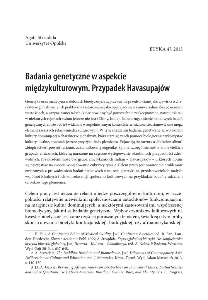 Agata Strządała Uniwersytet Opolski ETYKA 47, 2013 Badania genetyczne w aspekcie międzykulturowym. Przypadek Havasupajów Genetyka oraz medycyna w debatach bioetycznych są przeważnie przedstawiane jako zjawiska o charakterze globalnym, a ich praktyczne zastosowania jako opierające się na uniwersalnie akceptowanych wartościach, a przynajmniej takich, które powinny być powszechnie zaakceptowane, nawet jeśli tak w niektórych rejonach świata jeszcze nie jest (Chiny, Indie). Jednak zagadnienie naukowych badań genetycznych może być też widziane w zupełnie innym kontekście, a mianowicie, stanowić one mogą element szerszych relacji międzykulturowych. W tym znaczeniu badania genetyczne są wytworem kultury dominującej o charakterze globalnym, która stara się za ich pomocą biologicznie wykorzystać kultury lokalne, pozostałe jeszcze przy życiu ludy plemienne. Pojawiają się zarzuty o „biokolonializm”, „biopiractwo”, powrót rasizmu, zakamuflowaną eugenikę. Są one szczególnie nośne w niewielkich grupach etnicznych, które są narażone na częstsze występowanie określonych przypadłości zdrowotnych. Przykładem może być grupa amerykańskich Indian – Havasupajów – u których notuje się najczęstsze na świecie występowanie cukrzycy typu 2. Celem pracy jest omówienie problemów związanych z prowadzaniem badań naukowych z zakresu genetyki na przedstawicielach małych wspólnot lokalnych i ich konsekwencji społeczno‑kulturowych na przykładzie badań z udziałem członków tego plemienia. Celem pracy jest ukazanie relacji między poszczególnymi kulturami, w szczególności relatywnie niewielkimi społecznościami autochtonów funkcjonującymi na marginesie kultur dominujących, a niektórymi zastosowaniami współczesnej biomedycyny, jakimi są badania genetyczne. Wpływ czynników kulturowych na kwestie bioetyczne jest coraz częściej poruszanym tematem, świadczą o tym próby skonstruowania bioetyki konfucjańskiej1, buddyjskiej2 czy afroamerykańskiej3. 1 E. Hui, A Confucian Ethics of Medical Futility, [w:] Confucian Bioethics, ed. R. Fan, London‑Dordercht, Kluwer Academic Publ. 1999; A. Strządała, Kryzys globalnej bioetyki. Neokonfucjańska krytyka bioetyki globalnej, [w:] Historia – Kultura – Globalizacja, red. A. Nobis, P. Badyna, Wrocław, Wyd. Gajt 2013, s. 637‑648. 2 A. Strządała, The Buddhist Bioethics and Biomedicine, [w:] Dilemmas of Contemporary Asia. Deliberation on Culture and Education, red. J. Marszałek‑Kawa, Toruń, Wyd. Adam Marszałek 2013, s. 110‑130. 3 J.L.A. Garcia, Revisiting African American Perspectives on Biomedical Ethics: Distinctiveness and Other Questions, [w:] Africa American Bioethics. Culture, Race, and Identity, eds. L. Prograis, BADANIA GENETYCZNE W ASPEKCIE MIĘDZYKULTUROWYM… 85 Niezamierzonym efektem prowadzenia naukowych i medycznych badań genetycznych często staje się redefinicja tożsamości kulturowej. Redefinicja ta czasami prowadzi do umocnienia tożsamości kulturowej określonych grup, jak w przypadku bioetyki neokonfucjańskiej. W innych przypadkach badania genetyczne traktowane są jako poważne zagrożenie dla tożsamości kulturowej, a nawet dla egzystencji tychże grup, co dzieje się przez podważenie kulturowych narracji dotyczących mitów założycielskich społeczności czy przez podważenie kulturowych koncepcji pokrewieństwa. Z tą drugą sytuacją mamy do czynienia w przypadku Havasupajów, na których przykładzie się skoncentruję, choć w celach porównawczych odwoływać się będę także do przypadku innych kultur. W pierwszej części artykułu przedstawię historię badań prowadzonych na Havasupajach, uwzględniając ich własne potoczne narracje4 na ten temat (rzutować to będzie na sposób prowadzenia narracji zastosowany w moim tekście), a także wypowiedzi badaczy zebrane z wywiadów, raportów i doniesień prasowych. Następnie, przejdę do analizy tego przypadku, konfrontując go z przypadkami podobnych badań z udziałem przedstawicieli społeczności autochtonicznych, w szczególności Hawajczyków, oraz odwołując się do dwóch paradygmatów prowadzenia badań na małych społecznościach plemiennych opisanych przez Lorrie Anne Santos (community‑based participatory research vs. helicopter research). Przy użyciu tych koncepcji zdiagnozuję sprawę badań na Havasupajach. Na koniec przedstawię recepcję historii Havasupajów w antropologii i próby sformułowania doskonalszego, wzorcowego modelu prowadzenia badań naukowych w społecznościach plemiennych, który charakteryzowałby się większą kulturową i etyczną wrażliwością. 1. Historia badań genetycznych na członkach plemienia Havasupajów Havasupajowie to mała, odizolowana grupa północnoamerykańskich Indian, licząca dziś niespełna 1000 członków. Havasupai dosłownie znaczy „Niebiescy/ Zieloni Wodni Ludzie”. Ahá oznacza wodę, vasú to kolor niebieski i/lub zielony (w niektórych językach nie ma bowiem rozróżnienia między tymi barwami), a pai to tyle, co ludzie. Pod względem etnicznym „Havasupajowie należą do większej grupy Yuman Górnych, w której skład oprócz samych Havasupai zaliczamy także Walapai, Yavapai. Podstawą ich gospodarki było myślistwo i zbieractwo, choć dorywczo podejmowali się także kopieniactwa. Zajmowali wyżynne obszary zachodniej i północnej Arizony”5. Te trudno dostępne tereny sprawiły, że długo unikali oni kontaktu z Hiszpanami i Meksykanami, a potem Amerykanami, dzięki E.D. Pellegrino, Washington, George University Press 2007, s. 4‑13; S. Gbadegesin, Moral Wight of Culture in Ethics, [w:] Africa American Bioethics. Culture, Race, and Identity, eds. L. Prograis, E.D. Pellegrino, Washington, George University Press 2007, s. 25‑46. 4 K. Biskupska, Pamięć społeczna w zwierciadle języka. Analiza dyskursu pokolenia przełomu, Opole, Wyd. Uniwersytetu Opolskiego 2011, s. 31‑42. 5 C.F. Taylor, W.C. Sturtev