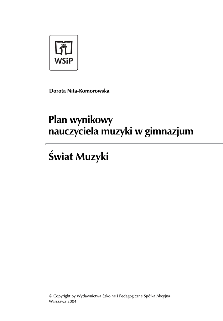 WST¢P Plan zapoczątkowany przez nauczyciela daje wyczucie kierunku zarówno uczniom jak i jemu samemu... R. Arends Prezentowany w tej publikacji plan wynikowy jest częścią „przedmiotowego systemu oceniania”. Precyzuje wymagania, które umożliwiają ocenę wiadomości i umiejętności ucznia oraz obejmuje materiał nauczania realizowany na kolejnych lekcjach. Ze względu na specyfikę przedmiotu muzyka jest to zadanie bardzo trudne. Nauczanie muzyki w gimnazjum ma przede wszystkim przygotować młodzież do świadomego odbioru sztuki. Zadanie nauczyciela jest więc szczególne. Na lekcjach powinien on starać się stworzyć atmosferę radości, swobody i tolerancji. Dobre doświadczenia zebrane w czasie takich lekcji będą pozytywnie wpływać na późniejsze wybory uczniów, zachęcać do słuchania trudniejszej muzyki, aktywnego i kulturalnego spędzania wolnego czasu. W muzyce tkwią głębokie wartości humanistyczne, a obcowanie z nią rozwija intelektualnie i emocjonalnie. Zajęcia muzyczne są także wspaniałą lekcją patriotyzmu, na której uczniowie poznają swą odrębność etniczno-narodową. W świecie, stającym się globalną wioską, wielkie znaczenie ma znajomość własnej kultury, rodzimego folkloru i wybitnych postaci ze świata muzyki. Takie nazwiska jak Chopin, Szymanowski czy Lutosławski powinny być znane każdemu Polakowi. Do gimnazjum trafia młodzież z różnych szkół, o różnych predyspozycjach, uzdolnieniach, niejednolitym poziomie wiedzy i umiejętności, której należy stworzyć odpowiednie warunki rozwoju. Innym problemem pojawiającym się tylko na lekcjach muzyki są zmiany zachodzące w obrębie aparatu głosowego dorastającej młodzieży. Śpiew w tym wieku może sprawiać liczne trudności natury wokalnej i psychicznej. Dlatego też podstawę oceny powinny stanowić obserwowane postępy ucznia, jego zaangażowanie w pracę na lekcji, wysiłek wkładany w osiągnięcie celów i indywidualne zainteresowania muzyczne. Niniejsza praca dotyczy wymagań stawianych uczniom, wynikających bezpośrednio z realizacji programu nauczania muzyki w gimnazjum, autorstwa Doroty Krawczyk (numer w wykazie MENiS: DKW-4014174/99) realizowanego w pracy z cyklem Świat muzyki. W skład tego cyklu wchodzą: – podręcznik i zeszyt ćwiczeń Wacława Panka – przewodnik dla nauczyciela Danuty Więckowskiej i Andrzeja Rękasa – kaseta magnetofonowa z utworami do słuchania. Zaplanowałam w gimnazjum 68 jednostek tematycznych pogłębiających wiedzę z zakresu kultury muzycznej. Zajęcia nie powinny być zdominowane przez teorię, dlatego propozycja obejmuje także bogaty repertuar piosenek i utworów do grania na instrumentach. Ta różnorodność pomoże nauczycielowi zaktywizować wszystkich uczniów w klasie, jak również dostosować materiał do poziomu ich możliwości oraz zainteresowań. Zestaw utworów zaproponowanych do słuchania można rozszerzyć o utwory poznane podczas nauki w szkole podstawowej, gdyż wielokrotne słuchanie tych samych dzieł pozwala na lepsze ich zapamiętanie i zrozumienie. Proponowane przeze mnie utwory dodatkowe pochodzą głównie z płyt przygotowanych przez WSiP do cyklu Muzyka i my. Wiele tematów zawartych w tym opracowaniu można z powodzeniem rozszerzyć, np. poświęcić więcej czasu na naukę ważnych pieśni lub realizację tematyki ścieżek edukacyjnych. Opracowując zestaw wymagań, podzieliłam je na dwa poziomy: – podstawowy – ponadpodstawowy. Uczeń spełniający wymagania podstawowe w pełnym zakresie otrzyma ocenę dostateczną, a w niepełnym – dopuszczającą. Uczeń, który w pełnym zakresie opanował materiał podstawowy i ponadpodstawowy otrzyma ocenę celującą. Nauczyciele sami ustalają wymagania na poszczególne stopnie szkolne, kierując się przede wszystkim zaangażowaniem ucznia oraz wysiłkiem wkładanym przez niego w osiągnięcie celów. Z oczywistych względów nie jest możliwe stworzenie uniwersalnego planu wynikowego (systemu oceniania) dla wszystkich uczniów i nauczycieli. Opracowany przeze mnie Plan wynikowy – muzyka w gimnazjum jest propozycją, którą należy dostosować do potrzeb własnej szkoły. Będzie mi miło, jeśli znajdziecie Państwo w nim coś dla siebie. Dorota Nita-Komorowska 2 Wyjaśnienie skrótów: P – podręcznik ucznia Świat muzyki ZĆ – zeszyt ćwiczeń Świat muzyki PM – przewodnik metodyczny nauczyciela MC – kaseta magnetofonowa Świat muzyki PLAN WYNIKOWY – MUZYKA W GIMNAZJUM Nr Temat MUZYKA W DZIEJACH KULTURY 1 DLACZEGO NARODZIŁA SIĘ MUZYKA? 2 GŁOS – INSTRUMENT NIEZWYKŁY 3 MUZYKA W ŚWIECIE STAROŻYTNYM 4 www.wsip.com.pl Tematyka szczegółowa Materiał do realizacji (środki dydaktyczne) Wymagania podstawowe Wymagania ponadpodstawowe Kolejność epok. Pojęcie czasu historycznego – oś czasu. Logika przemian dziejowych Wybrane utwory muzyczne poznane przez uczniów w czasie nauki w szkole podstawowej. Wybrane ćwiczenia z rozdziału Porozmawiajmy o sztuce [ZĆ s. 3-4] Po przeprowadzeniu lekcji uczeń: • wymieni nazwy epok historycznych Po przeprowadzeniu lekcji uczeń: • poda nazwy epok od najdawniejszej do czasów współczesnych Głos jako pierwszy instrument. Pieśni rytualne. Instrumenty kultur pierwotnych Muzyka z Ghany: Taniec Dugu, Pieśń satyryczna – muzycy z plemienia Kabre płn. Togo. Ilustracja: malowidło paleolityczne z jaskini w Lascaux – Grupa byków [P s. 7]. Ćwiczenia z rozdziału Źródła muzyki [ZĆ s. 5] Po przeprowadzeniu lekcji uczeń: • wymieni nazwy instrumentów muzycznych używanych w omawianej epoce Po przeprowadzeniu lekcji uczeń: • wymieni teorie na temat powstania muzyki • rozpozna na ilustracji dawne instrumenty Budowa aparatu głosowego. Higiena głosu (prawidłowa emisja, rozśpiewanie, dbanie o głos, unikanie krzyku). Różne rodzaje głosu S. Moniuszko Prząśniczka – sopran [MC-B7, PM s. 57], F. Schubert Ave Maria op. 52 nr 6 – baryton [MC-B8, PM s. 58], G. Ver