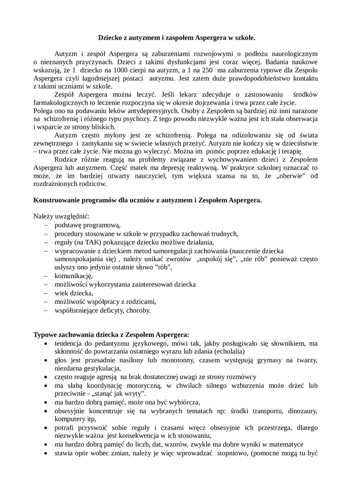 Dziecko z autyzmem i zaspołem Aspergera w szkole. Autyzm i zespół Aspergera są zaburzeniami rozwojowymi o podłożu naurologicznym o nieznanych przyczynach. Dzieci z takimi dysfunkcjami jest coraz więcej. Badania naukowe wskazują, że 1 dziecko na 1000 cierpi na autyzm, a 1 na 250 ma zaburzenia typowe dla Zespołu Aspergera czyli łagodniejszej postaci autyzmu. Jest zatem duże prawdopodobieństwo kontaktu z takimi uczniami w szkole. Zespół Aspergera można leczyć. Jeśli lekarz zdecyduje o zastosowaniu środków farmakologicznych to leczenie rozpoczyna się w okresie dojrzewania i trwa przez całe życie. Polega ono na podawaniu leków antydepresyjnych. Osoby z Zespołem są bardziej niż inni narażone na schizofrenię i różnego typu psychozy. Z tego powodu niezwykle ważna jest ich stała obserwacja i wsparcie ze strony bliskich. Autyzm często mylony jest ze schizofrenią. Polega na odizolowaniu się od świata zewnętrznego i zamykaniu się w świecie własnych przeżyć. Autyzm nie kończy się w dzieciństwie – trwa przez całe życie. Nie można go wyleczyć. Można im pomóc poprzez edukację i terapię. Rodzice różnie reagują na problemy związane z wychowywaniem dzieci z Zespołem Aspergera lub autyzmem. Część matek ma depresję reaktywną. W praktyce szkolnej oznaczać to może, że im bardziej otwarty nauczyciel, tym większa szansa na to, że „oberwie” od rozdrażnionych rodziców. Konstruowanie programów dla uczniów z autyzmem i Zespołem Aspergera. Należy uwzględnić: podstawę programową, procedury stosowane w szkole w przypadku zachowań trudnych, reguły (na TAK) pokazujące dziecku możliwe działania, wypracowanie z dzieckiem metod samoregulacji zachowania (nauczenie dziecka samouspokajania się) , należy unikać zwrotów „uspokój się”, „nie rób” ponieważ często usłyszy ono jedynie ostatnie słowo ”rób”, komunikację, możliwości wykorzystania zainteresowań dziecka wiek dziecka, możliwość współpracy z rodzicami, współistniejące deficyty, choroby. Typowe zachowania dziecka z Zespołem Aspergera: tendencja do pedantyzmu językowego, mówi tak, jakby posługiwało się słownikiem, ma skłonność do powtarzania ostatniego wyrazu lub zdania (echolalia) głos jest przesadnie nasilony lub monotonny, czasem występują grymasy na twarzy, niezdarna gestykulacja, często reaguje agresją na brak dostatecznej uwagi ze strony rozmówcy ma słabą koordynację motoryczną, w chwilach silnego wzburzenia może drżeć lub przeciwnie - „stanąć jak wryty”. ma bardzo dobrą pamięć, może ona być wybiórcza, obsesyjnie koncentruje się na wybranych tematach np: środki transportu, dinozaury, komputery itp, potrafi przyswoić sobie reguły i czasami wręcz obsesyjnie ich przestrzega, dlatego niezwykle ważna jest konsekwencja w ich stosowaniu, ma bardzo dobrą pamięć do liczb, dat, wzorów, zwykle ma dobre wyniki w matematyce stawia opór wobec zmian, należy je więc wprowadzać stopniowo, (pomocne mogą tu być pochwały i możliwość osiagnięcia sukcesu; trzeba jednak pamiętać, że niektórym dzieciom nagrody zupełnie nie odpowiadają), trudno nawiązuje przyjaźnie (przeszkada mu w tym skłonnośc do stereotypii, utrwalone schematy postępowania, impulsywność - te cechy zniechęcają rówieśników do nawiązywania bliższego kontaktu), często unika działania w grupie – izoluje się (jest niezdolne do współdziałania z rówieśnikami, Jak postępować z dziećmi autystycznymi i z Zespołem Aspergera? Można zastosować metody niedyrektywne, w których: są reguły, nie ma kar i nagród, ale są naturalne konsekwencje (np. jeśli rozlałeś zupę, to jej nie ma. Jeśli chcesz ją mieć to musisz podejść i poprosić}, dziecko samo określa, co zrobi po wykonaniu zadania, nie należy przytrzymywać dziecka, nie należy izolować, nie mówimy „popatrz na mnie”, ale jest nauka patrzenia za gestem, nie likwidujemy stereotypów – można je zastąpić innym zachowaniem, niektórym zachowaniom trzeba zapobiegać. Ważne zasady: struktura i organizacja otoczenia, język jasny, zrozumiały, komunikat krótki, ton zdecydowany, jednoznaczny. Błędy popełniane w relacjach z dzieckiem autystycznym i z Zespołem Aspergera: wyręczanie, nieznajomość możliwosci ucznia brak łączenia małych kroków w całość Materiały źródłowe: Czym różni się Zespół Aspergera od autyzmu i jakie istnieją metody leczenia? - Dominika Radecka Uczeń z autyzmem - dr Maria Piszczek (wykład) Trudna sztuka wiązania buta – Anna Ozaist (wykład) Opracowanie: Grażyna Grandys