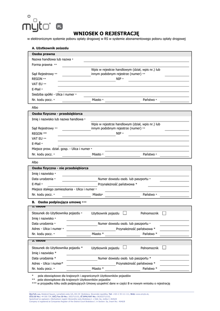 WNIOSEK O REJESTRACJĘ w elektronicznym systemie poboru opłaty drogowej w RS w systemie abonamentowego poboru opłaty drogowej A. UŜytkownik pojazdu Osoba prawna Nazwa handlowa lub nazwa Forma prawna * ** Wpis w rejestrze handlowym (dział, wpis nr.) lub innym podobnym rejestrze (numer) ** Sąd Rejestrowy ** REGON ** VAT EU ** E-Mail NIP * * Siedziba spółki - Ulica i numer Nr. kodu pocz. * Miasto * Państwo * * Albo Osoba fizyczna - przedsiębiorca Imię i nazwisko lub nazwa handlowa * Sąd Rejestrowy Wpis w rejestrze handlowym (dział, wpis nr.) lub innym podobnym rejestrze (numer) ** ** NIP REGON ** VAT EU E-Mail * ** * Miejsce prow. dział. gosp. - Ulica i numer * Nr. kodu pocz. Miasto * Państwo * * Albo Osoba fizyczna - nie przedsiębiorca Imię i nazwisko * Data urodzenia * E-Mail Numer dowodu osob. lub paszportu * PrzynaleŜność państwowa * * Miejsce stałego zamieszkania - Ulica i numer * Nr. kodu pocz. Państwo Miasto* * * B. Osoba podpisująca umowę *** 1. osoba Stosunek do UŜytkownika pojazdu Imię i nazwisko * Data urodzenia * Adres - Ulica i numer Nr. kodu pocz. * UŜytkownik pojazdu Pełnomocnik Numer dowodu osob. lub paszportu * * PrzynaleŜność państwowa * * Miasto * Państwo * 2. osoba Stosunek do UŜytkownika pojazdu * UŜytkownik pojazdu Pełnomocnik Imię i nazwisko * Data urodzenia * Numer dowodu osob. lub paszportu * Adres - Ulica i numer* Nr. kodu pocz. * PrzynaleŜność państwowa * Miasto * Państwo * * pola obowiązkowe dla krajowych i zagranicznych UŜytkowników pojazdów ** pola obowiązkowe dla krajowych UŜytkowników pojazdów *** w przypadku kilku osób podpisujących Umowę uzupełnić dane w części B w nowym wniosku o rejestrację SkyToll, a.s, Westend Square, Lamačská cesta 3/A, 841 04 Bratislava, Slovenská republika, Tel: +421 2 35 111 111, Web: www.emyto.sk, IČO/ID No.: 44 500 734, DIČ/Tax ID No.: 2022712153, IČ DPH/VAT No.: SK2022712153, Spoločnosť je zapísaná v Obchodnom registri Okresného súdu Bratislava I. v Odd.:Sa, vložka č.:4646/B Company is registered at Companies Register of the District Court Bratislava I. in Section: Sa, Insert No.: 4646/B C. Dane do fakturowania Sposób płatności opłaty drogowej * Polecenie zapłaty (Przelew bank.) Sposób płatności za usługi* Za pośrednictwem wystawcy kart paliwowych Polecenie zapłaty (Przelew bank.) Sposób zapłaty za Poręczenie * Gotówka Karta bankowa Kata paliwowa Bank (w przypadku sposobu płatności poleceniem zapłaty wypełnić dane obowiązkowe oznaczone "1" lub "2" ) Nazwa banku * Numer konta IBAN (1) Kod banku (2) Adres banku zagranicznego (1) BIC / SWIFT (2) (2) D. Zabezpieczenie płatności opłaty drogowej Rodzaj zabezpieczenia* Poręczenie bankowe Zabezpieczenie w gotówce Wystawca Karty paliwowej Poręczenie bankowe Bak udzielający gwarancji Data udzielenia Numer poręczenia bankowego Wysokość udzielonej gwarancji Okres waŜności Zabezpieczenie w gotówce Wysokość udzielonego zabezpieczenia Numer dokumentu Wystawca kart paliwowych Wystawca karty E. Adres do przesyłania faktur i korespondencji (w razie nie wypełnienia punktu E uŜyje się adresu z punktu A) Preferowany sposób doręczania faktur i korespondencji Pocztą E-mailem Ulica i numer Nr. kodu pocz. E-mail Państwo Miasto F. Osoba kontaktowa do komunikacji z działem Obsługi klienta (wypełnić przynajmniej jedno z pól 106-108) Imię i nazwisko* Telefon łącznie z nr. kierunkowym Fax (łącznie z nr. kierunkowym) E-mail G. Przedkładane dokumenty do sprawdzenia Zezwolenie na prow. dział. gospodarczej, koncesja lub wypis z Rejestru Handlowego albo inne potwierdzenie o podmiotowości prawnej Dowód osobisty lub paszport Dowód rejestracyjny lub dowód techniczny Dowód rejestracyjny i dowód o przydzieleniu numeru rejestr. Dowód rejestracyjny dla VAT Karty paliwowe Pełnomocnictwo Poręczenie bankowe / Dokument o uiszczeniu zabezpieczenia w gotówce W przypadku innych dokumentów wymienić je Oświadczam, Ŝe wszystkie dane wypełniłem kompletnie i poprawnie. Przez wypełnienie niniejszego wniosku wyraŜam zgodę z tym, Ŝe Administrator Poboru Opłaty Drogowej i/albo inne upowaŜnione przez niego osoby będą moje dane elektroniczne wkładać w celu ich opracowania, uŜywania i rozpatrywania reklamacji. Zgadzam się z ogólnymi warunkami handlowymi Administratora Poboru Opłaty Drogowej, ogólnymi warunkami handlowymi UŜytkownika systemu i taryfikatorem opłat. Niniejszym udzielam pełnomocnictwa Administratorowi Poboru Opłaty Drogowej i UŜytkownikowi systemu, aby płatności wynikające ze stosunku umowy rozliczali według określonego sposobu płatności. Bez określenia jednego z podanych sposobów płatności będzie się wymagać płatności przelewem bankowym w walucie Euro. Zgadzam się z tym, aby Administrator Poboru Opłaty Drogowej i/albo UŜytkownik systemu przesyłał informacje (np. marketingowe lub charakteru eksploatacyjnego) na adres e-mailowy podany w umowie. Zgadzam się Nie zgadzam się WNIOSEK O REJESTRACJĘ POJAZDU w elektronicznym systemie poboru opłaty drogowej w RS w systemie abonamentowego poboru opłaty drogowej L.p. Nr. rej pojazdu * 1 2 3 4 5 6 7 8 9 10 11 12 13 14 15 16 17 18 19 20 Kraj rejestracji Kategoria pojazdu * * Zespół pojazdów ponad 3,5 t Zespół pojazdów ponad 3,5 t Zespół pojazdów ponad 3,5 t Zespół pojazdów ponad 3,5 t Zespół pojazdów ponad 3,5 t Zespół pojazdów ponad 3,5 t Zespół pojazdów ponad 3,5 t Zespół pojazdów ponad 3,5 t Zespół pojazdów ponad 3,5 t Zespół pojazdów ponad 3,5 t Zespół pojazdów ponad 3,5 t Zespół pojazdów ponad 3,5 t Zespół pojazdów ponad 3,5 t Zespół pojazdów ponad 3,5 t Zespół pojazdów ponad 3,5 t Zespół pojazdów ponad 3,5 t Zespół pojazdów ponad 3,5 t Zespół pojazdów ponad 3,5 t Zespół pojazdów ponad 3,5 t Zespół pojazdów ponad 3,5 t Min. liczba osi pojazdu* Klasa emisji * Największa dopuszczalna masa całkowita pojazdu * Największa dopuszczalna masa z