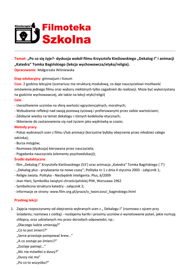 Temat: „Po co się żyje?- dyskusja wokół filmu Krzysztofa Kieślowskiego „Dekalog I” i animacji „Katedra” Tomka Bagińskiego (lekcja wychowawcza/etyka/religia). Opracowanie: Małgorzata Wiśniewska Etap edukacyjny: gimnazjum i liceum Czas: 2 godziny lekcyjne (scenariusz ma strukturę modułową, co daje nauczycielowi możliwość omówienia jednego filmu oraz wyboru niektórych tylko zagadnień do realizacji. Może być wykorzystany na godzinie wychowawczej, ale także na lekcji etyki/religii) Cele: - Uwrażliwienie uczniów na sferę wartości egzystencjalnych, moralnych; - Wzbudzenie refleksji nad swoją postawą życiową i preferowanymi przez siebie wartościami; - Zdobycie wiedzy na temat dekalogu i różnych kodeksów etycznych; - Skłonienie do zastanowienia się nad życiem jako wędrówką w czasie; Metody pracy: - Pokaz wybranych scen z filmu i/lub animacji (korzystne byłoby obejrzenie przez młodzież całego odcinka); - Burza mózgów; - Rozmowa (dyskusja) kierowana przez nauczyciela; - Pogadanka nauczyciela (elementy psychoedukacji); Środki dydaktyczne: - film „Dekalog I” Krzysztofa Kieślowskiego (53’) oraz animacja „Katedra” Tomka Bagińskiego ( 7’) - „Dekalog plus - przykazania na nowe czasy”; Polityka nr 1 z dnia 4 stycznia 2003 - załącznik 1; - Religie świata. Polityka - Niezbędnik inteligenta. Plus, 6/2009 - Jean Hani, Symbolika świątyni chrześcijańskiej PIW, Warszawa 1962 - Symboliczna struktura katedry - załącznik 2; - informacje ze strony: www.film.org.pl/prace/o_tworczosci_baginskiego.html Przebieg lekcji: 1. Zajęcia rozpoczynamy od obejrzenia wybranych scen z „ Dekalogu I” (rozmowa z ojcem przy śniadaniu; rozmowa z ciotką) - rozdajemy kartki i prosimy uczniów o wynotowanie pytań, jakie nurtują chłopca, oraz udzielanych mu przez dorosłych odpowiedzi, np.: „Dlaczego ludzie umierają?” „Co to jest śmierć?” „Serce przestaje pompować krew…” „A co zostaje po śmierci?” „Zostaje pamięć…” „Nic nie mówiłeś o duszy?” „Duszy nie ma” „Po co to wszystko?” „Po co się żyje?” „Życie to dar, prezent od Boga” „A ty wierzysz, że Bóg jest?” „Kim on jest?” „Co teraz czujesz? Kocham cię. Właśnie. I on w tym jest”. 2. Zbieramy odpowiedzi i inicjujemy rozmowę na tematy poruszone w filmie Kieślowskiego, pytając uczniów o charakter pytań zadawanych przez chłopca (są to pytania egzystencjalne: o wartość, sens i cel życia, oraz metafizyczne (eschatologiczne): problem ciała i duszy, życia wiecznego, Boga.) i okoliczności, w jakich rodzą się w nim te refleksje (widok martwego psa, lektura nekrologów w prasie, zdjęcia papieża, ale także wewnętrzny niepokój, ciekawość, wrażliwość i samotność dziecka, wychowywanego przez ojca). Podkreślamy związek między praktycznym, niemal codziennym, życiowym doświadczaniem różnych wymiarów egzystencji (narodzin, śmierci, miłości, cierpienia) a naturalną w człowieku potrzebą jego myślowego zrozumienia i oswojenia (chodzi o to, by uświadomić młodzieży, że nie trzeba być filozofem, uczonym, by zadawać sobie i innym pytania natury filozoficznej). Przechodząc do odpowiedzi, jakich udzielają Pawłowi jego bliscy, zwracamy uwagę na racjonalne, konkretne i rzeczowe podejście ojca, który z pozycji naukowca-ateisty tłumaczy synowi fenomen śmierci i pamięci, która pozostaje po człowieku, oraz religijno-emocjonalne potraktowanie rozterek dziecka przez ciotkę. Jednocześnie wskazujemy na ograniczoność i niewystarczalność naukowych formuł przy próbach zastanowienia się nad sensem, czy celowością życia. Pytania: „Po co to wszystko?”, „Po co się żyje?” wymykają się czysto racjonalnej kalkulacji i otwierają przestrzeń tajemnicy istnienia. Przekonał się o tym boleśnie bohater Kieślowskiego, kiedy w swoich obliczeniach nie wziął pod uwagę przypadku, zbiegu okoliczności, losu…: zaufał maszynie, własnemu doświadczeniu (sprawdził osobiście grubość lodu) i stracił syna. Wnioski: Analiza obu scen powinna prowadzić do stwierdzenia pluralizmu w interpretacji rzeczywistości oraz otwartości na różne światopoglądy.„Dekalog I” nie jest utworem religijnym, ilustrującym boskie przykazania, ale filmem upominającym się o refleksję nad egzystencją, nakręconym w trudnym dla Polaków okresie stanu wojennego: „W kraju panował chaos i bałagan - w każdej dziedzinie, w każdej sprawie i w prawie każdym życiu. Napięcie, poczucie bezsensu i pogarszających się czasów było wyczuwalne. (...) Miałem dojmujące wrażenie, że coraz częściej oglądam ludzi, którzy nie bardzo wiedzą, po co żyją” - komentował ten czas reżyser. Warto zatem uwrażliwić uczniów na potrzebę namysłu nad własnym życiem, kierowania nim w sposób świadomy i odpowiedzialny, według przyjętego systemu wartości. 3. Rozmowę na temat systemu wartości rozpoczynamy od ustalenia, czym był historycznie, a następnie czym jest dla nas dziś Dekalog (pogadanka i dyskusja): Zaczynamy od definicji: „Dekalog (gr. δεκάλογος dekalogos, dziesięć słów) inaczej Dziesięć przykazań (dokładniej Dziesięć Oświadczeń הדברים עשרת, Aseret ha-Dibrot) - to zbiór podstawowych nakazów moralnych, obowiązujących pierwotnie wyznawców judaizmu, a następnie przejęty przez chrześcijan, dla których jest podstawowym kanonem wiary”. W moralnej teologii chrześcijańskiej Dziesięcioro Przykazań wyznacza jakby przestrzeń ludzkiego dobra - wszystko, co jest poza nią, należy do sfery zła. Przykazania są przede wszystkim zakazami. Dekalog stanowi minimum, bo wyznacza dolną granicę ludzkiego postępowania. Nie zabrania czynić więcej niż tylko przestrzegać zakazów. Obecnie, wielu ludziom wydaje się, że dekalog jest utopią, określa górną granicę postępowania, jest czymś w rodzaju kagańca nałożonego naturze ludzkiej. Czy tak jest w istocie