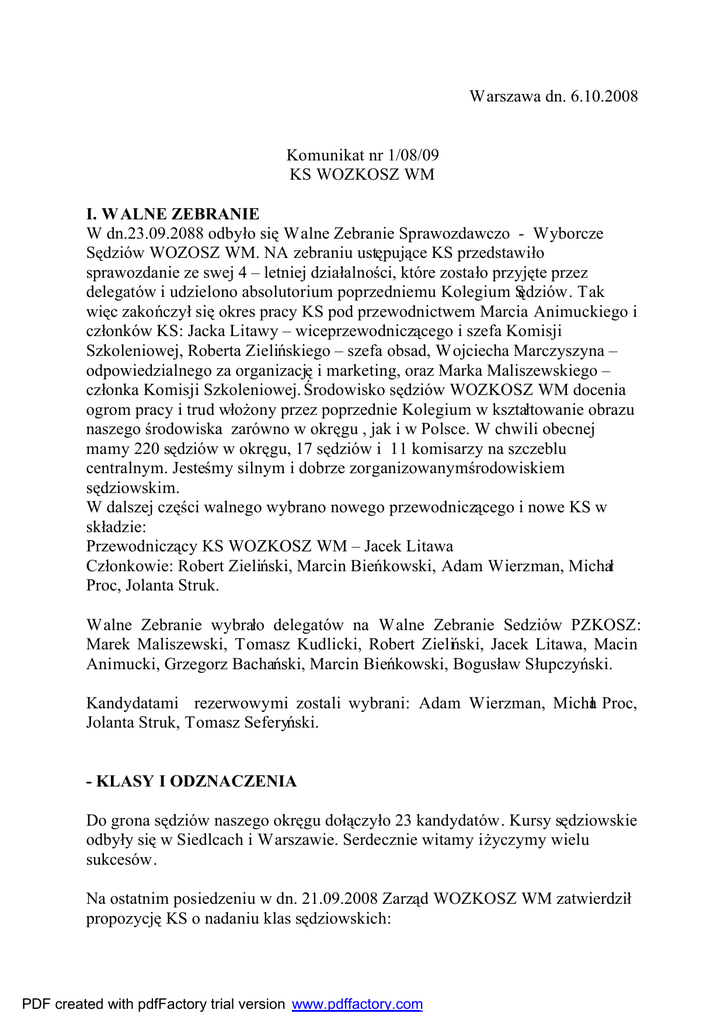 Warszawa dn. 6.10.2008 Komunikat nr 1/08/09 KS WOZKOSZ WM I. W ALNE ZEBRANIE W dn.23.09.2088 odbyło się Walne Zebranie Sprawozdawczo - Wyborcze Sędziów WOZOSZ WM. NA zebraniu ustępujące KS przedstawiło sprawozdanie ze swej 4 – letniej działalności, które zostało przyjęte przez delegatów i udzielono absolutorium poprzedniemu Kolegium Sędziów. Tak więc zakończył się okres pracy KS pod przewodnictwem Marcia Animuckiego i członków KS: Jacka Litawy – wiceprzewodniczącego i szefa Komisji Szkoleniowej, Roberta Zielińskiego – szefa obsad, Wojciecha Marczyszyna – odpowiedzialnego za organizację i marketing, oraz Marka Maliszewskiego – członka Komisji Szkoleniowej. Środowisko sędziów WOZKOSZ WM docenia ogrom pracy i trud włożony przez poprzednie Kolegium w kształtowanie obrazu naszego środowiska zarówno w okręgu , jak i w Polsce. W chwili obecnej mamy 220 sędziów w okręgu, 17 sędziów i 11 komisarzy na szczeblu centralnym. Jesteśmy silnym i dobrze zorganizowanymśrodowiskiem sędziowskim. W dalszej części walnego wybrano nowego przewodniczącego i nowe KS w składzie: Przewodniczący KS WOZKOSZ WM – Jacek Litawa Członkowie: Robert Zieliński, Marcin Bieńkowski, Adam Wierzman, Michał Proc, Jolanta Struk. Walne Zebranie wybrało delegatów na Walne Zebranie Sedziów PZKOSZ: Marek Maliszewski, Tomasz Kudlicki, Robert Zieliński, Jacek Litawa, Macin Animucki, Grzegorz Bachański, Marcin Bieńkowski, Bogusław Słupczyński. Kandydatami rezerwowymi zostali wybrani: Adam Wierzman, Michał Proc, Jolanta Struk, Tomasz Seferyński. - KLASY I ODZNACZENIA Do grona sędziów naszego okręgu dołączyło 23 kandydatów. Kursy sędziowskie odbyły się w Siedlcach i Warszawie. Serdecznie witamy i życzymy wielu sukcesów. Na ostatnim posiedzeniu w dn. 21.09.2008 Zarząd WOZKOSZ WM zatwierdził propozycję KS o nadaniu klas sędziowskich: PDF created with pdfFactory trial version www.pdffactory.com Ignacy Suwała został sędzią honorowym naszego okręgu. I klasę sędziowską otrzymali: Jakub Łukomski, Marek Pastusiak, Marcin Poławski, Bartosz Radkowiak, Jacek Spyt, Jacek Wiśniewski; II klasę sędziowską otrzymali: Tomasz Adamczuk, Paweł Dąbrowski, Wojciech Domański, Krzysztof Faliszewski, Karol Gutkowski, Kacper Guzowski, Piotr Kozioł, Bartłomiej Kucharski, Magdalena Kula, Krzysztof Kulma, Piotr Kwasiborski, Katarzyna Miłobędzka, Artur Misiak, Katarzyna Miturska, Jarosław Muś, Krzysztof Muś, Arkadiusz Osicki, Tomasz Prasolik, Artur Prekurat, Anna Rucińska, Marcin Skarzyński, Michał Sosin, Wiktor Stołowski, Mateusz Szwed, Robert Świesiulski, Lech Treichel, Piotr Wacławek, Robert Walewski, Michał Wistosławski, Justyna Wójcik, Jarosław Wróbel, Michał Wyrzykowski, Dorota Zabłocka. Klasę sędziego kandydata otrzymali kursanci: Patryk Arct, Wojciech Dorobek, Agata Grzegorczyk, Paweł Iwaniuk, Michał Jankowski, Marta Kamiejsa, Małgorzata Krakowska, Daniel Krawiec, Rafał Marcyniuk, Łukasz Marczak, Ireneusz Miroński, Michał Nachtygal, Paweł Ochnik, Jan Płonka, Maciej Romankiewicz, Anna Sejbuk, Krzysztof Skrzyński, Tomasz Słomiński, Agata Szymaniak, Piotr Tomczyk, Robert Treichel, Mariusz Troć, Agnieszka Żochowska. …… Zarząd WOZKOSZ WM nadał na wniosek KS następujące odznaczenia, jako uznanie za pracę włożoną w życie środowiska sędziowskiego i koszykówki w naszym okręgu: Złota Odznaka WOZKOSZ WM: Igor Gulczyński, Arkadiusz Misiak, Marcin Miszkiewicz, Tomasz Seferyński; Srebrna Odznaka WOZKOSZ WM: Jarosław Gadomski, Ilona Kamińska, Katarzyna Kobierska, Przemysław Lesiński, Michał Proc, Jolanta Struk, Adam Wierzman; Brązowa Odznaka WOZKOSZ WM: Ewa Bieńkowska, Julia Dąbrowska, Dariusz Iwańczyk, Maciej Krupiński, Marcin Krysiak, Katarzyna Miłobędzka, Zofia Trawińska, Robert Walewski. II- POSIEDZENIE KS W DN.29.09.2008 Nowowybrane Kolegium ukonstytuowało się na pierwszym posiedzeniu. Dokonano podziału odpowiedzialności i zakresu obowiązków: PDF created with pdfFactory trial version www.pdffactory.com Jacek Litawa - Przewodniczący KS WOZKOSZ WM. Robert Zieliński – Wiceprzewodniczący, Szef obsad, odpowiedzialny za obsady strefowe, stoliki ligowe, Ligę Szkół Średnich oraz weryfikację pracy sędziów i dyscyplinę. Marcin Bieńkowski – obsady okręgowe, Liga Akademicka Krajowa, weryfikacja pracy sędziów i dyscyplina. Adam Wierzman – odpowiedzialny za szkolenie z ramienia KS, członek Komisji Szkoleniowej. Michał Proc – Członek Komisji Szkoleniowej, odpowiedzialny za nabór i kursy sędziowskie. Jolanta Struk – Sekretarz, organizacja i marketing. W celu usprawnienia pracy Kolegium powołało również stałych współpracowników: Maciej Krupiński – organizacja, łącznik z PZKOSZ ( materiały szkoleniowe, interpretacje i pomoce szkoleniowe) Tomasz Seferyński – organizacja imprez. Katarzyna Miłobędzka – weryfikacja pracy sędziów i dyscyplina, współpraca z WGiD. Jarosław Gadomski – szkolenie sędziów stolikowych. Andrey Porokhnenko – fotografia, współpraca przy tworzeniu newsletter’a Julia Dąbrowska i Zofia Trawińska – tworzenie newsletter’a o dotychczasowej nazwie ” ref’s info „. Marcin Krysiak – współpraca w organizacji szkoleń kontakt z ligą UNBA. Życzeniem KS jest , aby całokształt pracy sędziowskiej rozwijał się coraz lepiej i przynosił owoce w postaci coraz wyższego poziomu sędziowania spotkań w okręgu, a tym samym w personalnym rozwoju poszczególnych sędziów. III.SZKOLENIE W trakcie posiedzenia KS wspólnie z powołaną Komisją Szkoleniową w składzie: Przewodniczący Komisji Szkoleniowej – Grzegorz Bachański Członkowie: Marek Maliszewski, Adam Wierzman, Michał Proc, Bogusław Słupczyński wypracowało plan pracy na nadchodzący sezon 08/09. Szkolenie ma odbywać się w następujących grupach: I – RC a) 3 kandydatów na szczebel centralny, którzy uczestniczą bezpośrednio w szkoleniu centralnym. Odp