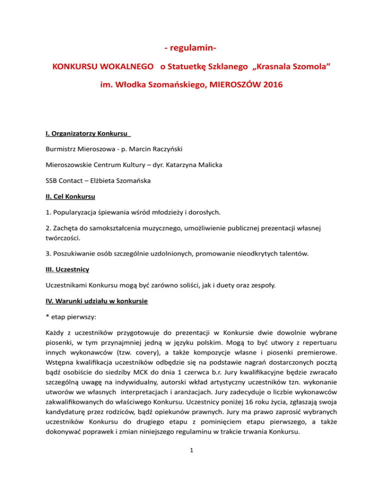 - regulaminKONKURSU WOKALNEGO o Statuetkę Szklanego „Krasnala Szomola” im. Włodka Szomańskiego, MIEROSZÓW 2016 I. Organizatorzy Konkursu Burmistrz Mieroszowa - p. Marcin Raczyński Mieroszowskie Centrum Kultury – dyr. Katarzyna Malicka SSB Contact – Elżbieta Szomańska II. Cel Konkursu 1. Popularyzacja śpiewania wśród młodzieży i dorosłych. 2. Zachęta do samokształcenia muzycznego, umożliwienie publicznej prezentacji własnej twórczości. 3. Poszukiwanie osób szczególnie uzdolnionych, promowanie nieodkrytych talentów. III. Uczestnicy Uczestnikami Konkursu mogą być zarówno soliści, jak i duety oraz zespoły. IV. Warunki udziału w konkursie * etap pierwszy: Każdy z uczestników przygotowuje do prezentacji w Konkursie dwie dowolnie wybrane piosenki, w tym przynajmniej jedną w języku polskim. Mogą to być utwory z repertuaru innych wykonawców (tzw. covery), a także kompozycje własne i piosenki premierowe. Wstępna kwalifikacja uczestników odbędzie się na podstawie nagrań dostarczonych pocztą bądź osobiście do siedziby MCK do dnia 1 czerwca b.r. Jury kwalifikacyjne będzie zwracało szczególną uwagę na indywidualny, autorski wkład artystyczny uczestników tzn. wykonanie utworów we własnych interpretacjach i aranżacjach. Jury zadecyduje o liczbie wykonawców zakwalifikowanych do właściwego Konkursu. Uczestnicy poniżej 16 roku życia, zgłaszają swoja kandydaturę przez rodziców, bądź opiekunów prawnych. Jury ma prawo zaprosić wybranych uczestników Konkursu do drugiego etapu z pominięciem etapu pierwszego, a także dokonywać poprawek i zmian niniejszego regulaminu w trakcie trwania Konkursu. 1 * etap drugi: Osoby zakwalifikowane do udziału w drugim etapie Konkursu otrzymają informację telefoniczną oraz pocztową do dnia 15 czerwca br. Drugi etap Konkursu rozpocznie się w dniu 09 lipca 2015 r. o godz. 11.00 na scenie Mieroszowskiego Centrum Kultury w Mieroszowie. Organizatorzy zapewniają uczestnikom II etapu: zakwaterowanie ze śniadaniem w dniach 0910 lipca 2015 r., a także napoje, kawę, herbatę, przekąski oraz obiado-kolację. Organizatorzy nie zwracają kosztów dojazdu uczestników. Jeżeli uczestnik do prezentacji piosenek zamiast podkładu potrzebuje instrument muzyczny jest zobowiązany do zapewnienie go we własnym zakresie. V Kryteria Jury będzie oceniać: -muzykalność, -aranżację oraz interpretację piosenek, -walory wokalne, -emocję wyrazu i dykcję -ogólny wyraz artystyczny . VI Konkurs Wokalny - 08 lipca, piątek od godz. 15.00 lub 09 lipca, sobota 2016r., do godz.11.00 – przyjazd i zakwaterowanie, - 09 lipca 2016 r., sobota w godz. 11.00-15.00 - warsztaty wokalne, poznanie sceny i warunków akustycznych, indywidualna próba akustyczna, - 09 lipca 2015 r., sobota od godz. 17.00 – otwarte przesłuchania uczestników na scenie MCK, oceniane przez Jury Konkursowe. Przewodnicząca Jury – aktorka Teresa Lipowska. W czasie obrad jury recital laureatki ubiegłorocznego konkursu - Moniki Federyszyn z Twardogóry. - 10 lipca 2015 r., niedziela godz. 17.00 - ogłoszenie wyników i rozdanie nagród, występ laureatów. 2 VII Nagrody - Statuetka Szklanego „Krasnala Szomola” - dwuosobowy wyjazd na weekend do Brukseli - Tygodniowe Wrocławskie Warsztaty Wokalne - nagrody rzeczowe VIII Zgłoszenie kandydata powinno zawierać: - wypełniony formularz Konkursu Wokalnego im. Włodka Szomańskiego - płytę CD/DVD z nagraniem dwóch piosenek oraz (jeśli dotyczy) podkładów muzycznych dwóch zgłoszonych piosenek tzw. pół playback’i - teksty piosenek prezentowanych podczas konkursu - krótkie CV i zdjęcie w wersji elektronicznej Zgłoszenie należy dostarczyć osobiście, albo wysłać pocztą na adres: Konkurs Wokalny – o statuetkę szklanego „Krasnala Szomola” im. Wlodka Szomańskiego Mieroszowskie Centrum Kultury 58-350 Mieroszów, ul. Żeromskiego 28 [email protected] w terminie do 1 czerwca 2016r . Koordynator projektu: Wioleta Kuchta tel.513 444 856, biuro projektu tel./fax 74 880 12 68 Elżbieta Szomańska 660-48-40-50, [email protected] 3 FORMULARZ ZGŁOSZENIOWY KONKURSU WOKALNEGO „Szklany Szomol” im. Włodka Szomańskiego, Mieroszów 08-10 lipca 2016r. Imię i Nazwisko (solisty lub kierownika zespołu) ………………………….................................................……….. Pseudonim artystyczny lub nazwa zespołu (jeśli dotyczy)…………………………………….............................…... Skład zespołu ............................................................................................................................................ …................................................................................................................................................................ Data urodzenia …………………………………….....................................................................………......…………….. Adres zamieszkania……………………..........................................................................……..………………………… …................................................................................................................................................................ Tel. kom...................................................... e-mail……………………………………………………… Piosenki zgłaszane do konkursu: 1) Tytuł .................................................................................................................. Muzyka ……………………………………………………………….. Słowa ……………………………………………………….. 2) Tytuł .................................................................................................................. Muzyka ……………………………………………………………….. Słowa …………………………