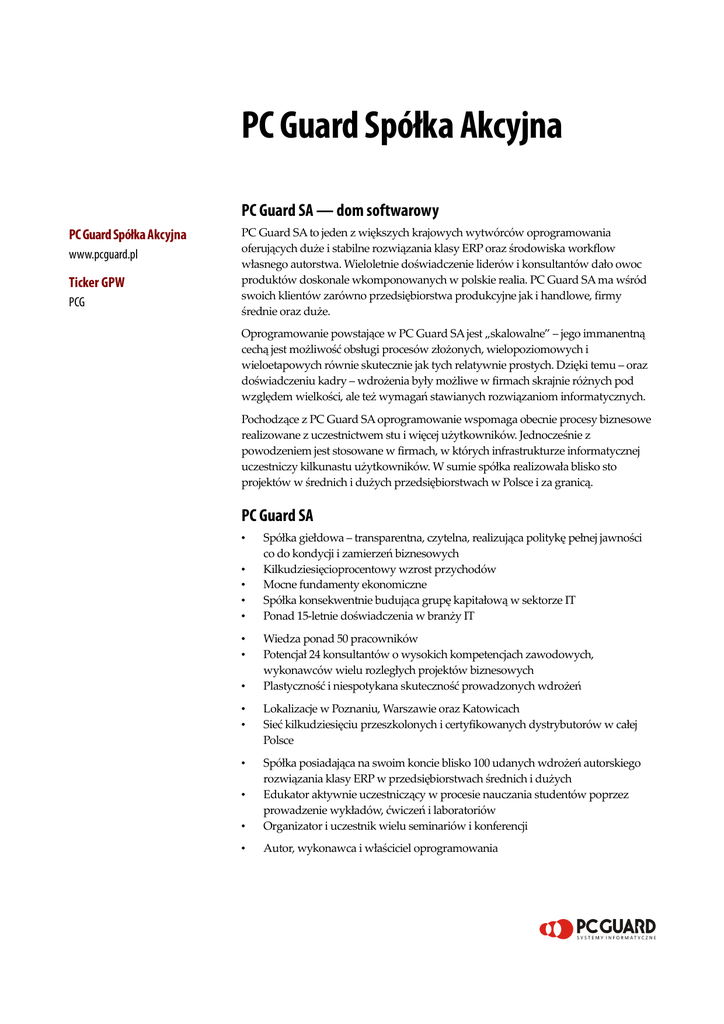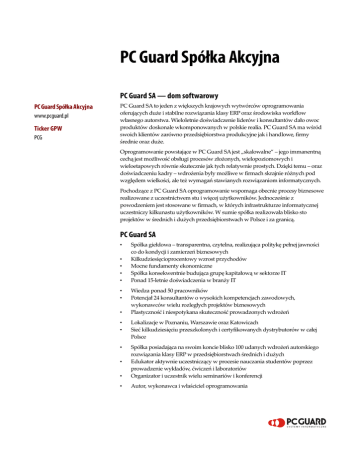 PC Guard Spółka Akcyjna PC Guard SA — dom softwarowy PC Guard Spółka Akcyjna www.pcguard.pl Ticker GPW PCG PC Guard SA to jeden z większych krajowych wytwórców oprogramowania oferujących duże i stabilne rozwiązania klasy ERP oraz środowiska workflow własnego autorstwa. Wieloletnie doświadczenie liderów i konsultantów dało owoc produktów doskonale wkomponowanych w polskie realia. PC Guard SA ma wśród swoich klientów zarówno przedsiębiorstwa produkcyjne jak i handlowe, firmy średnie oraz duże. Oprogramowanie powstające w PC Guard SA jest „skalowalne” – jego immanentną cechą jest możliwość obsługi procesów złożonych, wielopoziomowych i wieloetapowych równie skutecznie jak tych relatywnie prostych. Dzięki temu – oraz doświadczeniu kadry – wdrożenia były możliwe w firmach skrajnie różnych pod względem wielkości, ale też wymagań stawianych rozwiązaniom informatycznych. Pochodzące z PC Guard SA oprogramowanie wspomaga obecnie procesy biznesowe realizowane z uczestnictwem stu i więcej użytkowników. Jednocześnie z powodzeniem jest stosowane w firmach, w których infrastrukturze informatycznej uczestniczy kilkunastu użytkowników. W sumie spółka realizowała blisko sto projektów w średnich i dużych przedsiębiorstwach w Polsce i za granicą. PC Guard SA • • • • • • • • Spółka giełdowa – transparentna, czytelna, realizująca politykę pełnej jawności co do kondycji i zamierzeń biznesowych Kilkudziesięcioprocentowy wzrost przychodów Mocne fundamenty ekonomiczne Spółka konsekwentnie budująca grupę kapitałową w sektorze IT Ponad 15-letnie doświadczenia w branży IT Wiedza ponad 50 pracowników Potencjał 24 konsultantów o wysokich kompetencjach zawodowych, wykonawców wielu rozległych projektów biznesowych Plastyczność i niespotykana skuteczność prowadzonych wdrożeń • • Lokalizacje w Poznaniu, Warszawie oraz Katowicach Sieć kilkudziesięciu przeszkolonych i certyfikowanych dystrybutorów w całej Polsce • • Spółka posiadająca na swoim koncie blisko 100 udanych wdrożeń autorskiego rozwiązania klasy ERP w przedsiębiorstwach średnich i dużych Edukator aktywnie uczestniczący w procesie nauczania studentów poprzez prowadzenie wykładów, ćwiczeń i laboratoriów Organizator i uczestnik wielu seminariów i konferencji • Autor, wykonawca i właściciel oprogramowania • Produkty autorskie Platforma Graffiti.ERP Graffiti — produkt roku 2005 Zintegrowany System Wspomagania Zarządzania Przedsiębiorstwem klasy ERP – duży, funkcjonalny pakiet oprogramowania wspomagający funkcjonowanie i rozwój średnich i dużych przedsiębiorstw produkcyjnych i handlowych. Platforma ASCENT Oprogramowanie, które za pomocą nośnych rozwiązań technologicznych łączy kompetencje workflow – obsługi zadań i procesów, obiegu dokumentów i biblioteki dokumentów; normuje procedury oraz przeprowadza analizę ich efektywności; integruje informacje pochodzące z różnych źródeł (również z systemu lub nawet systemów ERP); steruje przepływem informacji. Rozwiązania dziedzinowe PC Guard SA jest architektem i twórcą oprogramowania. Ścisła współpraca odbiorców, ludzi świata nauki i analityków spółki była motorem powstania dziesiątek zaprojektowanych i przygotowanych przez zespół PC Guard SA modułów dziedzinowych, specjalizowanych, obsługujących peryferyjne względem systemu ERP obszary aktywności gospodarczej. Kompetencje Konsultanci PC Guard SA w swoich karierach zawodowych brali udział w kilkudziesięciu projektach wdrożenia systemów ERP, workflow, obiegu dokumentów oraz rozwiązań dziedzinowych. Wiele z tych przedsięwzięć dotyczyło firm produkcyjnych o dużej liczbie użytkowników. Wszystkie wdrożenia są poprzedzone analizą biznesową i skrupulatną specyfikacją efektów i miar sukcesu. Większość konsultantów PC Guard SA jest aktywna zawodowo od kilkunastu lat. Zdobyte doświadczenie i wiedza są gwarancją udanego przedsięwzięcia. Referencje Posiadamy blisko sto listów referencyjnych. To efekt udanych wdrożeń i długoletniej współpracy z naszymi odbiorcami. Wśród naszych zadowolonych klientów są spółki giełdowe, firmy polskie i spółki z kapitałem zagranicznym. Nagrody Jesteśmy laureatami nagród i wyróżnień. Największą radość sprawił nam wybór kilkusetosobowej publiczności – uczestników konferencji GigaCon 2005 w Warszawie – której werdyktem nadano naszemu systemowi ERP tytułu Produktu Roku 2005. Uczelnie. Edukacja PC Guard SA delegowało swoich konsultantów do uczestnictwa w wykładach i prezentacjach w kilkunastu uczelniach wyższych na terenie całego kraju. Od kilku lat prowadzimy regularne zajęcia prezentując nowoczesne rozwiązania dziedzinowe w sferze logistyczno-produkcyjnej. Od wielu lat publikacje naszych pracowników pojawiają się w prasie branżowej i naukowej. PC Guard SA wspiera i aktywnie współpracuje ze Stowarzyszeniem Księgowych w Polsce. Zarząd To ludzie nieprzypadkowi, związani z branżą informatyczną, z wytwarzaniem oprogramowania oraz projektami wdrożeń rozwiązań biznesowych od początku swojej kariery zawodowej. Dariusz Grześkowiak – Prezes Zarządu PC Guard SA. Absolwent Politechniki Poznańskiej, autor publikacji naukowych i prasowych. Lider projektu budowy oprogramowania ERP, architekt wielu rozwiązań dziedzinowych. Mariusz Bławat – Członek Zarządu PC Guard SA. Wizjoner, twórca wielu koncepcji rozwiązań biznesowych. Uczestnik i kierownik kilkudziesięciu wdrożeń rozległych projektów. PC Guard SA — spółka giełdowa PC Guard SA zadebiutowała na warszawskim parkiecie w październiku 2005 roku. Udany debiut oznaczał dla spółki konieczność sprostania wyzwaniom i nadziejom, jakie pokładali w naszej firmie akcjonariusze. Wysiłek zaowocował niezwykle wysoką oceną wystawioną przez fachowe media. W prestiżowym rankingu gazety PARKIET w marcu 2