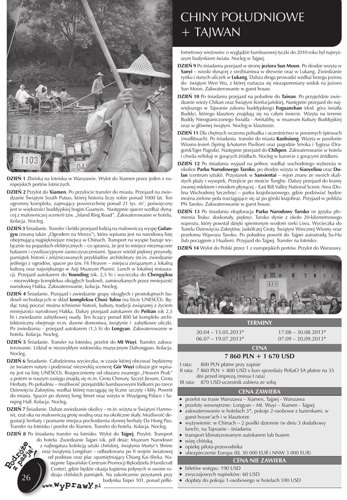 CHINY południowe + Tajwan DZIEŃ 1 Zbiórka na lotnisku w Warszawie. Wylot do Xiamen przez jeden z europejskich portów lotniczych. DZIEŃ 2 Przylot do Xiamen. Po przylocie transfer do miasta. Przejazd na zwiedzanie Świątyni South Putuo, której historia liczy sobie ponad 1000 lat. Ten ogromny kompleks, zajmujący powierzchnię ponad 21 tys. m2, poświęcony jest w większości buddyjskiej bogini Guanyin. Następnie spacer wzdłuż słynącej z malowniczej scenerii tzw. „Island Ring Road”. Zakwaterowanie w hotelu. Kolacja. Nocleg. DZIEŃ 3 Śniadanie. Transfer i krótki przejazd łodzią na malowniczą wyspę Gulangyu (zwaną także „Ogrodem na Morzu”), która wpisana jest na narodową listę obejmującą najpiękniejsze miejsca w Chinach. Transport na wyspie bazuje wyłącznie na pojazdach elektrycznych – co sprawia, że jest to miejsce niezmącone hałasem i cywilizacyjnymi zanieczyszczeniami. Spacer wśród pięknej przyrody, pamiątek historii i zróżnicowanych przykładów architektury (m.in. zwiedzanie jednego z ogrodów, spacer po tzw. Hi Heaven – miejscu związanym z lokalną kulturą oraz największego w Azji Muzeum Pianin). Lunch w lokalnej restauracji. Przejazd autokarem do Younding (ok. 2,5 h) i wycieczka do Chengqilou – niezwykłego kompleksu okrągłych budowli, zamieszkanych przez mniejszość narodową Hakka. Zakwaterowanie, kolacja. Nocleg. DZIEŃ 4 Śniadanie. Przejazd i zwiedzanie grupy okrągłych i prostokątnych budowli wchodzących w skład kompleksu Chuxi Tulou (na liście UNESCO). Będąc tutaj poczuć można tchnienie historii, kultury, tradycji związanej z życiem mniejszości narodowej Hakka. Dalszy przejazd autokarem do Peitian (ok 2,5 h) i zwiedzanie zabytkowej osady. Ten liczący ponad 800 lat kompleks architektoniczny obejmuje m.in. dawne domostwa, świątynie i zabytkowe uliczki. Po zwiedzaniu - przejazd autokarem (1,5 h) do Longyan. Zakwaterowanie w hotelu. Kolacja. Nocleg. DZIEŃ 5 Śniadanie. Transfer na lotnisko, przelot do Mt Wuyi. Transfer, zakwaterowanie. Udział w niezwykłym widowisku muzycznym Dahongpao. Kolacja. Nocleg. DZIEŃ 6 Śniadanie. Całodzienna wycieczka, w czasie której obcować będziemy ze światem natury i podziwiać niezwykłą scenerię Gór Wuyi (obszar gór wpisany jest na listę UNESCO). Rozpoczniemy od obszaru zwanego „Heaven Peak” a potem w naszym zasięgu znajdą się m.in. Grota Chmury, Szczyt Jiesum, Grota Herbaty. Po południu – możliwość przejażdżki bambusowymi łódkami po rzece Dziewięciu Zakrętów, wzdłuż której rozciągają się liczne szczyty i klify. Powrót do miasta. Spacer po słynnej Song Street oraz wizyta w Wuyigong Palace i Sanqing Hall. Kolacja. Nocleg. DZIEŃ 7 Śniadanie. Dalsze zwiedzanie okolicy – m.in. wizyta w Świątyni Harmonii, rzut oka na malowniczą grotę wodną oraz na okoliczne skały. Możliwość degustacji herbaty i poznanie miejsca pochodzenia słynnej herbaty Da Hong Pao. Transfer na lotnisko i przelot do Xiamen. Transfer do hotelu. Kolacja. Nocleg. DZIEŃ 8 Po śniadaniu transfer na lotnisko. Wylot do Tajpej. Przylot. Transport do hotelu. Zwiedzanie Tajpei (ok. pół dnia): Muzeum Narodowe z najbogatsza kolekcją sztuki chińskiej, świątynia Martyr’s Shrine oraz świątynia Longshan – odbudowana po II wojnie światowej od podstaw oraz plac upamiętniający Chiang Kai-Sheka. Następnie Tajwańskie Centrum Promocji Rękodzieła (Handicraft Center), gdzie będzie okazja kupienia jedynych w swoim rodzaju chińskich pamiątek. Na zakończenie przystanek przy budynku Taipei 101, ponad półki- 26 lometrowy wieżowiec o wyglądzie bambusowej tyczki do 2010 roku był najwyższym budynkiem świata. Nocleg w Tajpej. DZIEŃ 9 Po śniadaniu przejazd w stronę jeziora Sun Moon. Po drodze wizyta w Sanyi – wioski słynącej z rzeźbiarstwa w drewnie oraz w Lukang. Zwiedzanie rynku i starych uliczek w Lukang. Dalsza droga prowadzi wzdłuż brzegu jeziora do świątyni Wen Wu, z której roztacza się niezapomniany widok na jezioro Sun Moon. Zakwaterowanie w guest house. DZIEŃ 10 Po śniadaniu przejazd na południe do Tainan. Po przyjeździe zwiedzanie wieży Chikan oraz Świątyni Konfucjańskiej. Następnie przejazd do największego w Tajwanie zakonu buddyjskiego Foguanshan (dosł. góra światła Buddy), którego klasztory znajdują się na całym świecie. Wizyta na terenie Buddy Nieograniczonego Światła - Amitabhy, w muzeum Kultury Buddyjskiej oraz w głównej świątyni. Nocleg w klasztorze. DZIEŃ 11 Dla chętnych wczesna pobudka i uczestnictwo w porannych śpiewach (modlitwach). Po śniadaniu transfer do miasta Kaohsiung. Wizyta w pawilonie Wiosna-Jesień (Spring &Autumn Pavilion) oraz pagodzie Smoka i Tygrysa (Dragon&Tiger Pagoda). Następnie przejazd do Chihpen. Zakwaterowanie w hotelu i chwila refleksji w gorących źródłach. Nocleg w kurorcie z gorącymi źródłami. DZIEŃ 12 Po śniadaniu wyjazd na północ wzdłuż wschodniego wybrzeża w okolice Parku Narodowego Taroko, po drodze wizyta w Siaoyeliou oraz Dulan (centrum sztuki). Przystanek w Sansientai – rejon znany ze swoich skalistych plaży i wysepek. Przejście po moście Tunghe. Dalszy przejazd do krainy zwanej mlekiem i miodem płynącej – East Rift Valley National Scenic Area (Dolina Wschodniej Szczeliny) – parku krajobrazowego, gdzie podziwiać będzie można zielone pola rozciągające się aż po górski krajobraz. Przyjazd w pobliżu PN Taroko. Zakwaterowanie w guest house. DZIEŃ 13 Po śniadaniu eksploracja Parku Narodowy Taroko (w języku plemienia Truku: doskonały, piękny). Taroko słynie z około 20-kilometrowego wąwozu, który powstał dzięki spienionym wodom rzeki Liwu. Wycieczka do Tunelu Dziewięciu Zakrętów, Jaskółczej Groty, Świątyni Wiecznej Wiosny oraz przełomu Wąwozu Taroko. Po południu powrót do Tajpei autostradą Su-Hu (lub pociągiem z Hualien). Przyjazd do Tajpej. Transfer na lotnisko. DZIEŃ 14 Wylot do Polski przez 1 z europejskich portów