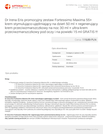 SK-FARM II Sp. z o.o. - Apteka Internetowa ul. Kleeberga 34, Białystok +48 42 279 40 05 Dr Irena Eris promocyjny zestaw Fortessimo Maxima 55+ krem stymulująco-ujędrniający na dzień 50 ml + regenerujący krem przeciwzmarszczkowy na noc 30 ml + ultra-krem przeciwzmarszczkowy pod oczy i na powieki 15 ml GRATIS !!! Cena: 119,89 PLN Opis słownikowy Dostępność Dostępny w aptece w 24h Opakowanie 1 zestaw Postać Kremy Producent DR IRENA ERIS Rodzaj rejestracji Kosmetyk Opis produktu Wstęp Promocyjny zestaw Dr Irena Eris Fortessimo Maxima 55+, w skład którego wchodzą: Dr Irena Eris Fortessimo Maxima 55+ krem stymulująco-ujędrniający na dzień 50 ml, Dr Irena Eris Fortessimo Maxima 55+ regenerujący krem przeciwzmarszczkowy na noc 30 ml, Dr Irena Eris Fortessimo Maxima 55+ ultra-krem przeciwzmarszczkowy pod oczy i na powieki 15 ml. Dodatkowo prezent - voucher rabatowy o wartości 50 zł przy skorzystaniu z zabiegu pielęgnacyjnego na twarz lub ciało za min. 290 zł w Kosmetycznym Instytucie Dr Irena Eris. Szczegółowy regulamin na DrIrenaEris.com. Zestaw dostępny jest do wyczerpania zapasów. Charakterystyka Dr Irena Eris Fortessimo Maxima 55+ krem stymulująco-ujędrniający na dzień - krem ponad dwukrotnie poprawia elastyczność skóry dojrzałej, zmniejszając widoczne skutki upływu czasu oraz wieloletniego niekorzystnego wpływu środowiska na skórę. Składnik kompleksu Algokine-forte® - kinetyna (roślinny hormon wzrostu) pomaga w odnowie starzejących się i uszkodzonych komórek skóry, przywracając im zdolność prawidłowego funkcjonowania. Wyciąg z czerwonych alg oraz masło Shea tworzą ochronny film na skórze, pomagając w przywróceniu jej odpowiedniego nawilżenia, natłuszczenia i gładkości. Wysoki filtr ochronny przeciw promieniowaniu UV (SPF10) zapobiega osłabieniu mechanizmów obronnych skóry oraz zmniejsza prawdopodobieństwo powstawania przebarwień cechujących cerę dojrzałą. Krem polecany do codziennej pielęgnacji cery dojrzałej po 50. roku życia jako krem na dzień. Nadaje się pod makijaż. Dr Irena Eris Fortessimo Maxima 55+ regenerujący krem przeciwzmarszczkowy na noc - regenerujący krem do cery dojrzałej zawiera specjalny kompleks Omega-arbutin-forte, który posiada wybitne właściwości odżywczo - przeciwzmarszczkowe. Składnik kompleksu olej z pestek czarnej porzeczki jest cennym źródłem Niezbędnych Nienasyconych Kwasów Tłuszczowych (zwłaszcza szeregów Plik wygenerowano: 02-03-2017 Oprogramowanie sklepu: AptusShop SK-FARM II Sp. z o.o. - Apteka Internetowa ul. Kleeberga 34, Białystok +48 42 279 40 05 Omega-3 i Omega-6), dzięki czemu uzupełnia ich niedobór w strukturach skóry dojrzałej i pomaga zmniejszyć ilość zmarszczek. Inny składnik kompleksu - arbutyna zmniejsza prawdopodobieństwo powstania przebarwień charakterystycznych dla skóry dojrzałej. Krem w widoczny sposób wpływa na poprawę kondycji cery dojrzałej, pomagając przywrócić jej gładkość, elastyczność i prawidłowy koloryt. Polecany do codziennej pielęgnacji skóry jako krem regenerujący na noc. Do skóry po 50 roku życia. Dr Irena Eris Fortessimo Maxima 55+ ultra-krem przeciwzmarszczkowy pod oczy i na powieki - bogaty w substancje regenerujące krem polecany po 50-55.roku życia do pielęgnacji delikatnej skóry okolic oczu. Unikalny składnik kompleksu Kinecell-forte® - kinetyna (roślinny hormon wzrostu) pomaga w odnowie starzejących się i uszkodzonych komórek skóry, przywracając i przedłużając zdolność ich prawidłowego funkcjonowania. Dzięki zawartości bogatego w Niezbędne Nienasycone Kwasy Tłuszczowe oleju z pestek czarnej porzeczki krem skutecznie wpływa na spłycenie zmarszczek i poprawę jędrności skóry okolic oczu. Ciekłokrystaliczna struktura kremu zapewnia szybkie i długotrwałe działanie substancji aktywnych. Polecany jako krem na dzień i na noc do pielęgnacji wrażliwej skóry w okolicach oczu. Nadaje się pod makijaż. Informacje dodatkowe W razie pytań lub wątpliwości służymy Państwu pomocą pod adresem [email protected]. Plik wygenerowano: 02-03-2017 Powered by TCPDF (www.tcpdf.org) Oprogramowanie sklepu: AptusShop
