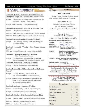 October 2, 2016 Archdiocesan Shrine of The Divine Mercy POLISH MASS + ++ October 1 - (sobota) - Saturday - Saint Therese of the Child Jesus, Virgin and Doctor of the Church Memorial 8:30 am Dziękczynna za 56 lat pożycia małżeńskiego dla Genowefy i Stefana Dybała (Dzieci) 5:00 pm God’s Blessing for the Jagielski family October 2 - (niedz.) - 27TH Sunday in Ordinary Time 8:30 am Holy Rosary Parishioners 10:30 am +Lucyna Sobiecka (Małgorzata i Lawrence Janowsci) 12:30 pm Birthday Blessings for Izabela Janus (Godmother) [[[ October 3 - (poniedziałek) - Monday - Weekday 6:30 pm 75th Birthday Blessings for Hanna Stampone (Szymański family) [[ October 4 - (wtorek) - Tuesday - Saint Francis of Assisi Memorial 6:30 pm +Marie Monczewski (Anthony Monczewski, Jr.) October 5 - (środa) - Wednesday - Weekday Saint Faustina Feast Memorial 6:30 pm God’s Blessings & thanksgiving to God for Hanna Stampone 75th birthday (Szymański family) October 6 - (czwartek) - Thursday - Weekday 6:30 pm +Helena Kozłowska (Halina Miklewska) October 7 - (piątek) - Friday - Our Lady of the Rosary Memorial 3:00 pm ++Msgr. Chester J. Mieczkowski & Rev. Franciszek Okroy (Louis J. Bogdan Sr.) 7:00 pm O Boże Błogosławienstwo i Opieke Boża dla dzieci które w tym roku przyjeły Sacrament Bierzmowanie (rodzice dzieci) Sunday - Alina Cymek & Grzegorz Jamroz Next Sunday - Janina Gradus & Lidia Gajec ENGLISH MASS Saturday 5:00 pm - Luisa DiIorio 8:30 am - Edward Marcinko 12:30 pm - Javier Rivera & Jeannette Król Come & See Vocation Weekend: Exploring Religious Life SPONSER: Sisters of Bon Secours DATES: October 14-16, 2016 ARRIVAL: Friday, 6:00 pm DEPARTURE: Sunday, 1:00 pm (after Sunday Mass and lunch) PLACE: Bon Secours Provincial House, 1525 Marriottsville Rd Marriottsville, MD 21104. CHARGE: NONE Contact: Sr. Pat Dowling, Vocation Director 1-877-742-0277 or 410-442-3172 for more details, visit: http:// www.LifeAsASister.org This Sunday after Holy Communion the second collection is for Archdiocesan Schools Fund. As always, thank you for your generosity. M A S S A T TE N DAN C E Weekend of September 25 - 305 Donations ++ October 8 - (sobota) - Saturday - Weekday Baltimore, MD 1st Collection $ 2,124 Heating & Utility $ 361 5:00 pm +Aniela Wozniak (Halina Miklewska) New Church Roof Fund $ 905 October 9- (niedz.) - 28TH Sunday in Ordinary Time Candles $ 181 8:30 am Poor Box $ 50 Gift shop $ 34 Total $ 8:30 am +Edwin Wolff (Danuta & Zdzisław Krajewscy) +Bruce Smoter (from loving family with Cindy Meyers) 10:30 am +Jadwiga Szyjka (Helena DeAngelis) 12:30 pm +Richard Ruszala (wife & children ) 3,655 October 2, 2016 Archdiocesan Shrine of The Divine Mercy St Faustina, Patron of WYD2016 Feast Day 5 October Sister Mary Faustina, an apostle of the Divine Mercy, belongs today to the group of the most popular and wellknown saints of the Church. Through her the Lord Jesus communicates to the world the great message of God's mercy and reveals the pattern of Christian perfection based on trust in God and on the attitude of mercy toward one's neighbors. She was born with the name Helena on August 25, 1905 in Glogowiec Poland of a poor & religious family of peasants, the third of ten children. At the age of seven she had already felt the first stirrings of a religious vocation. After finishing school, she wanted to enter the convent but her parents would not give her permission. Called during a vision of the Suffering Christ, on August 1, 1925 she entered the Congregation of the Sisters of Our Lady of Mercy and took the name Sister Mary Faustina. She lived in the Congregation for thirteen years and lived in several religious houses. Externally nothing revealed her rich mystical interior life. She zealously performed her tasks and faithfully observed the rule of religious life. She was recollected and at the same time very natural, serene and full of kindness and interested love for her neighbor. Although her life was apparently insignificant, monotonous and dull, she hid within herself an extraordinary union with God. The years she had spent at the convent were filled with extraordinary gifts, such as: revelations, visions, hidden stigmata, participation in the Passion of the Lord, the gift of bilocation, the reading of human souls, the gift of prophecy, or the rare gift of mystical engagement and marriage. The living relationship with God, the Blessed Mother, the Angels, the Saints, the souls in Purgatory with the entire supernatural world — was as equally real for her as was the world she perceived with her senses. The Lord Jesus chose Sr. Mary Faustina as the Apostle and "Secretary" of His Mercy, so that she could tell the world about His great message. In the Old Covenant He said to her — I sent prophets wielding thunderbolts to My people. Today I am sending you with My mercy to the people of the whole world. I do not want to punish aching mankind, but I desire to heal it, pressing it To My Merciful Heart (Diary1588). Sister Mary Faustina, consumed by tuberculosis and by innumerable sufferings which she accepted as a voluntary sacrifice for sinners, died in Krakow at the age of just thirty three on October 5, 1938 with a reputation for spiritual maturity and a mystical union with God. On April 18, 1993 our Holy Father John Paul II raised Sister Faustina, Apostle of Divine Mercy, to the glory of the altars as a Saint. We celebrate her feast day on 5 October. She is the patron saint of World Youth Day as was celebrated 2016 in Krakow! Pray for us. Baltimore, MD Parafialne rekolekcje ze Św. Tereską z Lisieux. „33 DNI DO MIŁOSIERNEJ Na zakończenie Jubileuszowego Roku Miłosierdzia, w naszym kościele odbędą sie rekolekcje. Wraz ze św. Tereską, jedną z naszych najbardziej umiłowanych świętych, zapraszamy do wspólnej podróży ku poznaniu Bożego Miłsierdzia. Przez 6 tygodni będziemy kroczyć jej “Małą Drogą” by w ostatnim dniu Roku Jubileuszowego 20-go listopada ofiarować się tak jak ona Miłości