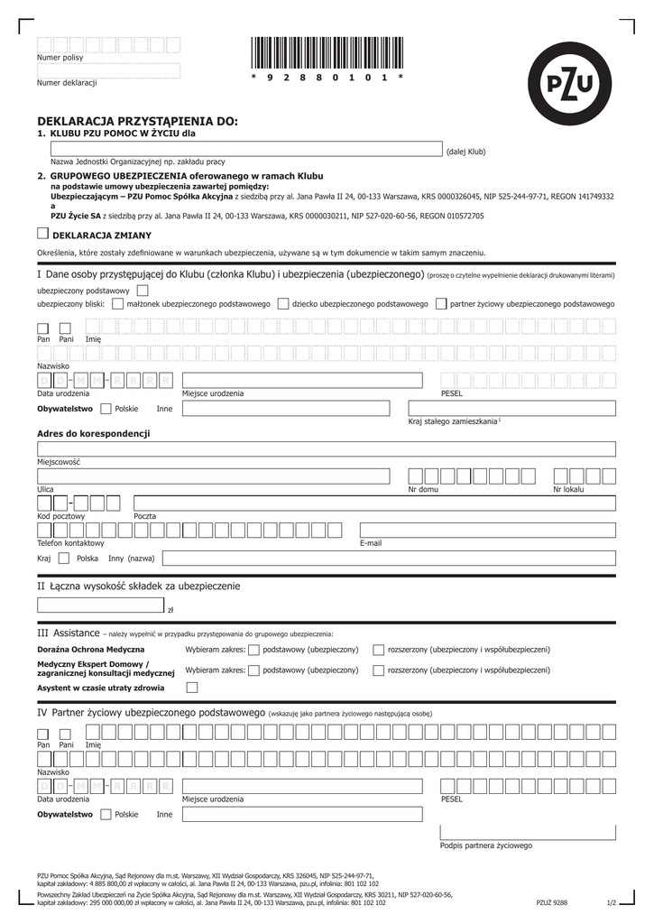 Numer polisy * Numer deklaracji 9 2 8 8 0 1 0 1 * DEKLARACJA PRZYSTĄPIENIA DO: 1. KLUBU PZU POMOC W ŻYCIU dla (dalej Klub) Nazwa Jednostki Organizacyjnej np. zakładu pracy 2. GRUPOWEGO UBEZPIECZENIA oferowanego w ramach Klubu na podstawie umowy ubezpieczenia zawartej pomiędzy: Ubezpieczającym – PZU Pomoc Spółka Akcyjna z siedzibą przy al. Jana Pawła II 24, 00-133 Warszawa, KRS 0000326045, NIP 525-244-97-71, REGON 141749332 a PZU Życie SA z siedzibą przy al. Jana Pawła II 24, 00-133 Warszawa, KRS 0000030211, NIP 527-020-60-56, REGON 010572705 DEKLARACJA ZMIANY Określenia, które zostały zdefiniowane w warunkach ubezpieczenia, używane są w tym dokumencie w takim samym znaczeniu. I Dane osoby przystępującej do Klubu (członka Klubu) i ubezpieczenia (ubezpieczonego) (proszę o czytelne wypełnienie deklaracji drukowanymi literami) ubezpieczony podstawowy ubezpieczony bliski: Pan Pani małżonek ubezpieczonego podstawowego dziecko ubezpieczonego podstawowego partner życiowy ubezpieczonego podstawowego Imię Nazwisko D D M M R R R R Data urodzenia Obywatelstwo Polskie Miejsce urodzenia Inne PESEL Kraj stałego zamieszkania 1 Adres do korespondencji Miejscowość Ulica Kod pocztowy Nr lokalu Poczta Telefon kontaktowy Kraj Nr domu Polska Inny (nazwa) E-mail II Łączna wysokość składek za ubezpieczenie zł III Assistance – należy wypełnić w przypadku przystępowania do grupowego ubezpieczenia: Doraźna Ochrona Medyczna Wybieram zakres: podstawowy (ubezpieczony) rozszerzony (ubezpieczony i współubezpieczeni) Medyczny Ekspert Domowy / zagranicznej konsultacji medycznej Wybieram zakres: podstawowy (ubezpieczony) rozszerzony (ubezpieczony i współubezpieczeni) Asystent w czasie utraty zdrowia IV Partner życiowy ubezpieczonego podstawowego Pan Pani (wskazuję jako partnera życiowego następującą osobę) Imię Nazwisko D D M M R R R R Data urodzenia Obywatelstwo Polskie Inne Miejsce urodzenia PESEL Podpis partnera życiowego PZU Pomoc Spółka Akcyjna, Sąd Rejonowy dla m.st. Warszawy, XII Wydział Gospodarczy, KRS 326045, NIP 525-244-97-71, kapitał zakładowy: 4 885 800,00 zł wpłacony w całości, al. Jana Pawła II 24, 00-133 Warszawa, pzu.pl, infolinia: 801 102 102 Powszechny Zakład Ubezpieczeń na Życie Spółka Akcyjna, Sąd Rejonowy dla m.st. Warszawy, XII Wydział Gospodarczy, KRS 30211, NIP 527-020-60-56, kapitał zakładowy: 295 000 000,00 zł wpłacony w całości, al. Jana Pawła II 24, 00-133 Warszawa, pzu.pl, infolinia: 801 102 102 PZUŻ 9288 1/2 V Uposażeni (w przypadku nie wskazania uposażonych, świadczenie przysługuje osobom zgodnie z ogólnymi warunkami ubezpieczenia) Lp. Nazwisko i imię / Nazwa Data i miejsce urodzenia / REGON Adres do korespondencji wraz z kodem pocztowym % świadczenia 1 % 2 % 3 % Razem 1 0 0 % VI Zgoda na przystąpienie do Klubu i objęcie ubezpieczeniem oraz oświadczenia osoby przystępującej Oświadczam, że: 1. Chcę przystąpić do Klubu na warunkach określonych w Regulaminie Klubu. Zapoznałam/em się z jego treścią i akceptuję go. 2. Chcę zostać objęta/y ochroną ubezpieczeniową z sumą ubezpieczenia i na warunkach określonych w umowie, które zostały mi doręczone przed przystąpieniem do ubezpieczenia. 3. Zgadzam się* na założenie przez PZU Życie SA dedykowanego konta elektronicznego (trwały nośnik), na które mogę otrzymywać dokumenty ubezpieczenia, powiadomienia, wnioski i oświadczenia oraz poprzez które mogę zawierać lub przystępować do innych umów ubezpieczenia. Zapoznałam/em się z Regulaminem świadczenia usług drogą elektroniczną i akceptuję jego treść. Zgadzam się na otrzymywanie powiadomień o zmianach zawartości konta za pośrednictwem środków komunikacji elektronicznej (w tym wiadomości sms lub e-mail). * W przypadku braku zgody proszę zaznaczyć X. 4. 2 Zgadzam się na przesyłanie informacji (w tym dokumentów ubezpieczenia, powiadomień, wniosków i oświadczeń), które mają związek z moimi ubezpieczeniami w PZU Życie SA za pośrednictwem środków komunikacji elektronicznej (w tym wiadomości sms lub e-mail). Zobowiązuję się niezwłocznie uaktualniać moje dane, dzięki którym będę otrzymywać informacje za pośrednictwem środków komunikacji elektronicznej. 5. 2 Zgadzam się na udostępnienie w celach marketingowych moich danych osobowych spółkom: PZU SA, PTE PZU SA, TFI PZU SA, PZU Zdrowie SA, PZU CO SA, Link4 TU SA. Mam prawo dostępu do treści i poprawiania moich danych osobowych oraz do zgłoszenia sprzeciwu na przetwarzanie danych w celach marketingowych lub przekazywania danych osobowych innemu administratorowi danych. 6. 2 Zgadzam się na przesyłanie informacji handlowych przez PZU SA, PZU Życie SA, PTE PZU SA, TFI PZU SA, PZU Pomoc SA, PZU Zdrowie SA, PZU CO SA, Link4 TU SA za pośrednictwem środków komunikacji elektronicznej (w rozumieniu ustawy z dnia 18 lipca 2002 r. o świadczeniu usług drogą elektroniczną). 7. 2 Zgadzam się na to, że PZU Życie SA, PZU SA, PTE PZU SA, TFI PZU SA, PZU Pomoc SA, PZU Zdrowie SA, PZU CO SA, Link4 TU SA będą używać telekomunikacyjnych urządzeń końcowych i automatycznych systemów wywołujących dla celów marketingu bezpośredniego (w rozumieniu ustawy z dnia 16 lipca 2004 r. Prawo telekomunikacyjne). 8. 2 Zgadzam się na przetwarzanie moich danych osobowych przez PZU Pomoc SA w celach marketingowych, jeśli nie zostanę członkiem Klubu lub moje członkostwo w Klubie wygaśnie. 9. 2 Zgadzam się na przetwarzanie moich danych osobowych przez PZU Życie w celach marketingowych, kiedy nie będę posiadać ubezpieczenia w tej firmie. 10. W razie wystąpienia zdarzenia upoważniam kierownictwo wszystkich placówek służby zdrowia i lekarzy do udzielania PZU Życie SA informacji o moim stanie zdrowia i stanie zdrowia moich małoletnich dzieci3, w tym obejmujących: przyczyny hospitalizacji i leczenia ambulatoryjnego, wyniki badań diagnostycznych (z wyłączeniem badań genetycznych), prze