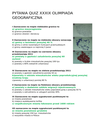 PYTANIA QUIZ XXXIX OLIMPIADA GEOGRAFICZNA I Zaznaczone na mapie niebieskie granice to a) granice mezoregionów b) granice powiatów c) granice zlewisk i dorzeczy II Zaznaczone na mapie na niebiesko obszary oznaczają a) gminy o lesistości powyżej 40 % b) gminy o silnie rozwiniętych funkcjach przemysłowych c) gminy zawierające co najmniej 5 jezior III Zaznaczone na mapie na czerwono obszary przedstawiają 2011 a) powiaty o gęstości zaludnienia powyżej 60 os/km2 b) powiaty o liczbie mieszkańców powyżej 100 tys c) powiaty o 80% wskaźnik urbanizacji IV Zaznaczone na mapie na zielone przedstawiają 2011 a) powiaty o gęstości zaludnienia poniżej 50 os b)powiaty o udziale mieszkańców wieku poprodukcyjnej powyżej średniej kraju c)powiaty o urbanizacji poniżej 80 % V Zaznaczone na mapie na fioletowo obszary przedstawiają a) powiaty o dodatnim saldzie migracji rejestrowanych b) powiaty o udziale mieszkańców wieku poprodukcyjnej o powyżej 50 % c) powiaty o zatrudnieniu w usługach poniżej 30% VI Zaznaczone na mapie sygnaturami punktowymi to a) miasta powiatowe b) miejsca wydobywania torfów c) współczesnym miasta lokowane przed 1600 rokiem VII zaznaczone na mapie sygnaturami punktowymi to a) miasta powiatowe grodzkie b) miasta powyżej 150 tys. mieszkańców c) wszystkie miasta w Polsce VIII zaznaczone na mapie sygnaturami punktowymi to a) elektrownie wodne b) jeziora poniżej 1000 ha c) złoża surowców energetycznych bez torfu XI Zaznaczona na mapie zielona linia to a) planowany przebieg drogi via baltica b) południowa granica zlodowacenia Wisły c) przebieg gazociągu jamalskiego X Zaznaczone na mapie czerwonymi liniami a) przyspieszone drogi międzywojewódzkie b) autostrady i drogi ekspresowe c) planowane autostrady