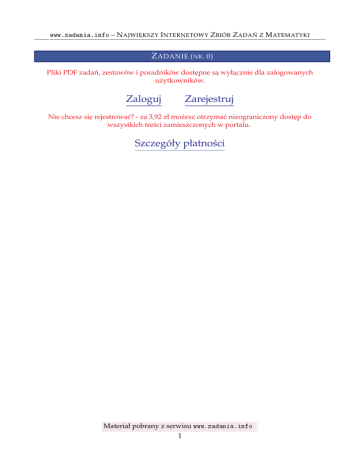 www.zadania.info – N AJWI EKSZY ˛ I NTERNETOWY Z BIÓR Z ADA Ń Z M ATEMATYKI Z ADANIE ( NR . 0) Pliki PDF zadań, zestawów i poradników dost˛epne sa˛ wyłacznie ˛ dla zalogowanych użytkowników. Zaloguj Zarejestruj Nie chcesz si˛e rejestrować? - za 3,92 zł możesz otrzymać nieograniczony dost˛ep do wszystkich treści zamieszczonych w portalu. Szczegóły płatności Materiał pobrany z serwisu www.zadania.info 1