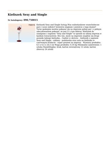 Kieliszek Sexy and Single Nr katalogowy: 090,750015 Kieliszek Sexy and Single Irytują Was walentynkowe wszechobecne pary i nowe miłości? Jesteście singlami i jesteście z tego dumni? Teraz spokojnie możesz pokazać się na imprezie pełnej par i z pełnym zdecydowaniem pokazać, że jest Ci z tym dobrze. Kieliszek do szampana z napisem "Sexy and Single" to sposób na udaną imprezę w każdym towarzystwie. Kto wie, może na imprezie znajdzie się drugi posiada takiego kieliszka... Gadżet w skrócie: - kieliszek z napisem Sexy and Single - szklany - podstawka oraz usta na kieliszku w czerwonym brokacie - super prezent na imprezy Wymiary produktu: 6,5 x 6,5 x 24,5 cm Waga produktu: 0,16 kg Minimalne zamówienie: 1 sztuka Stand/display: brak, karton wewnętrzny 12 sztuk, karton zbiorczy 24 sztuki